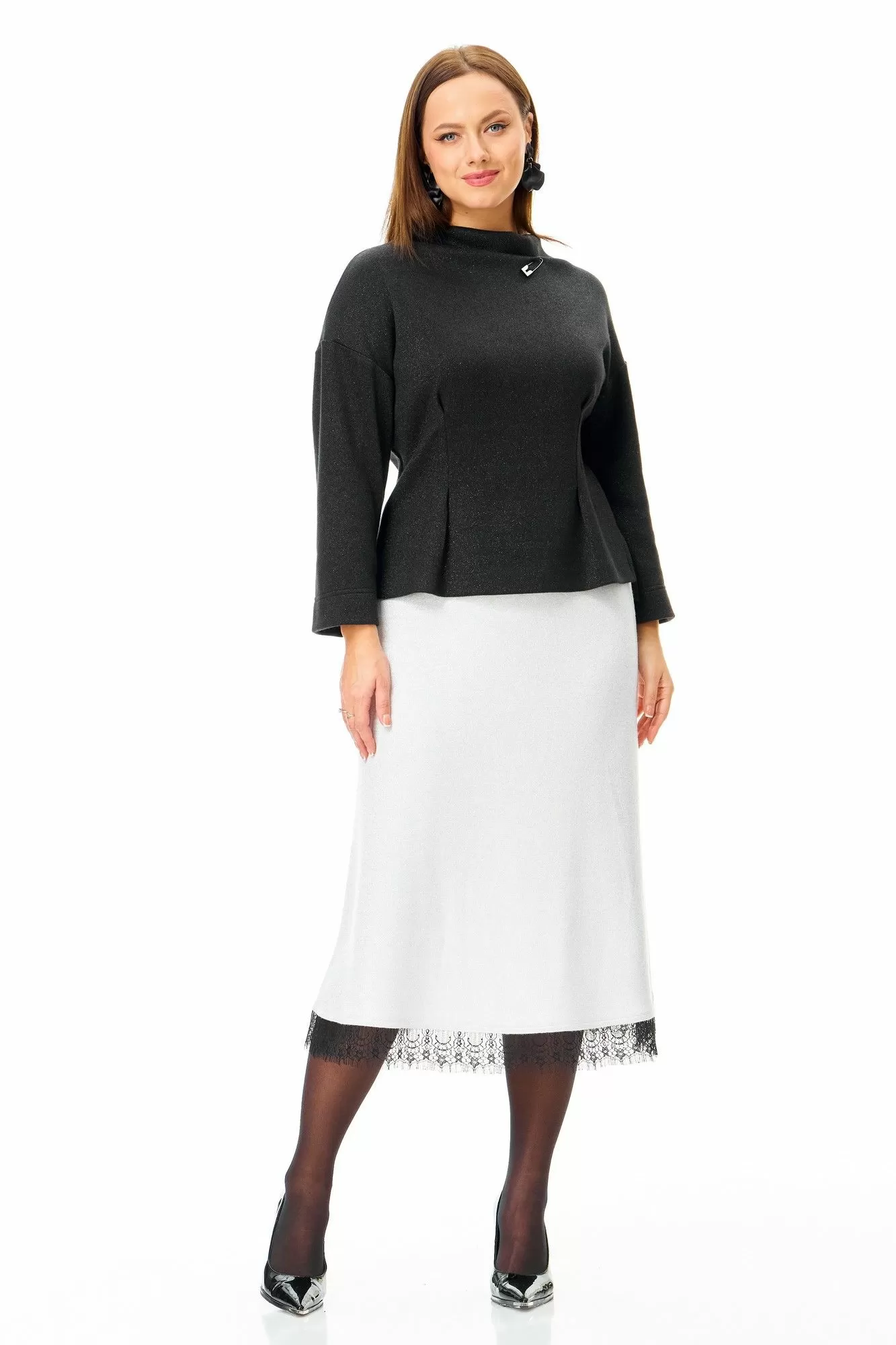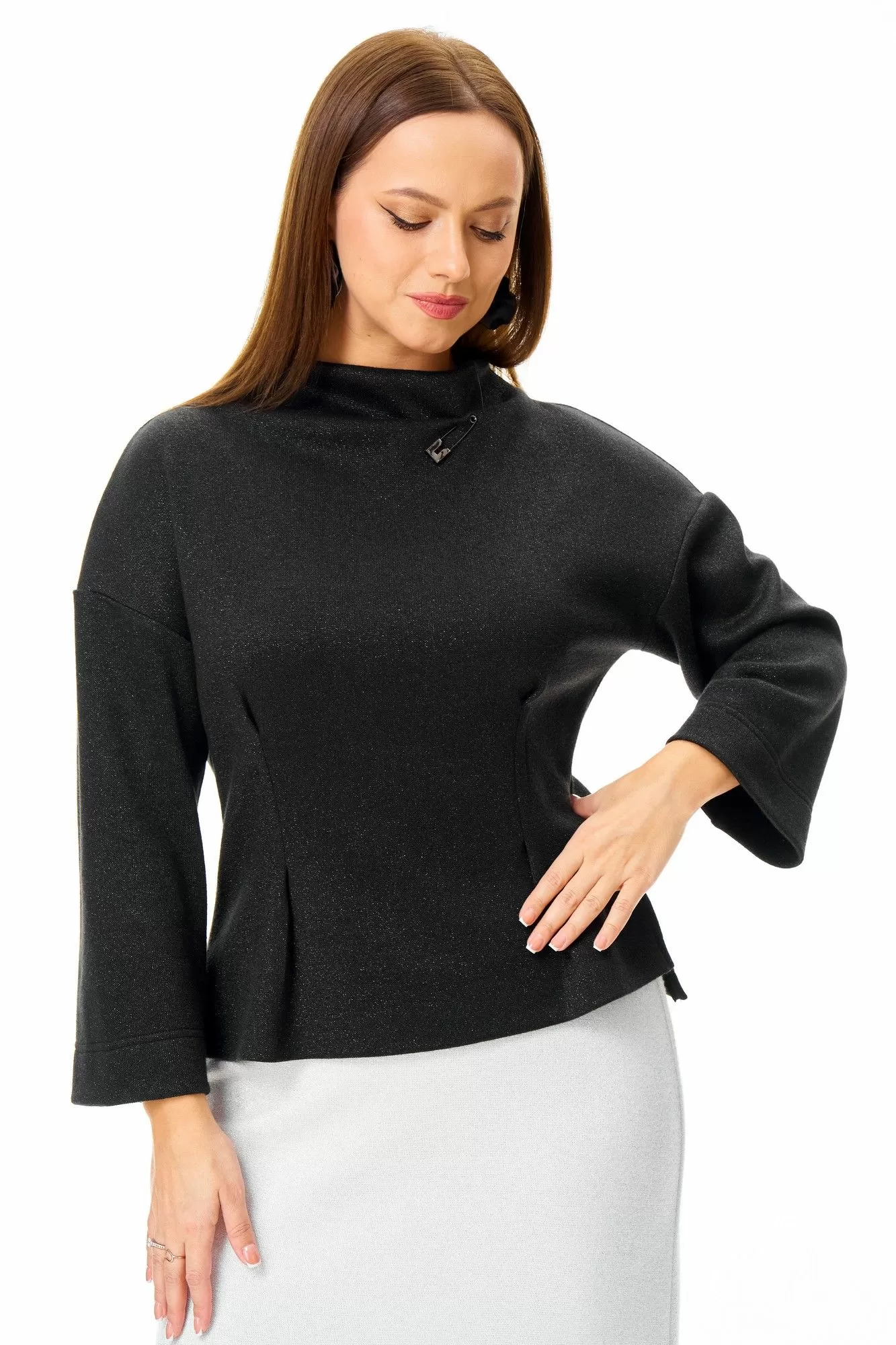 Джемпер свободного силуэта из однотонного трикотажного полотна с неярким блеском «люрекс». Горловина цельная «стойка». Плечо спущено. Рукав 3/4. По переду притален складками. Съемные кружевные манжеты добавляют страсти образу. Стильная булавка убережет от сглаза.