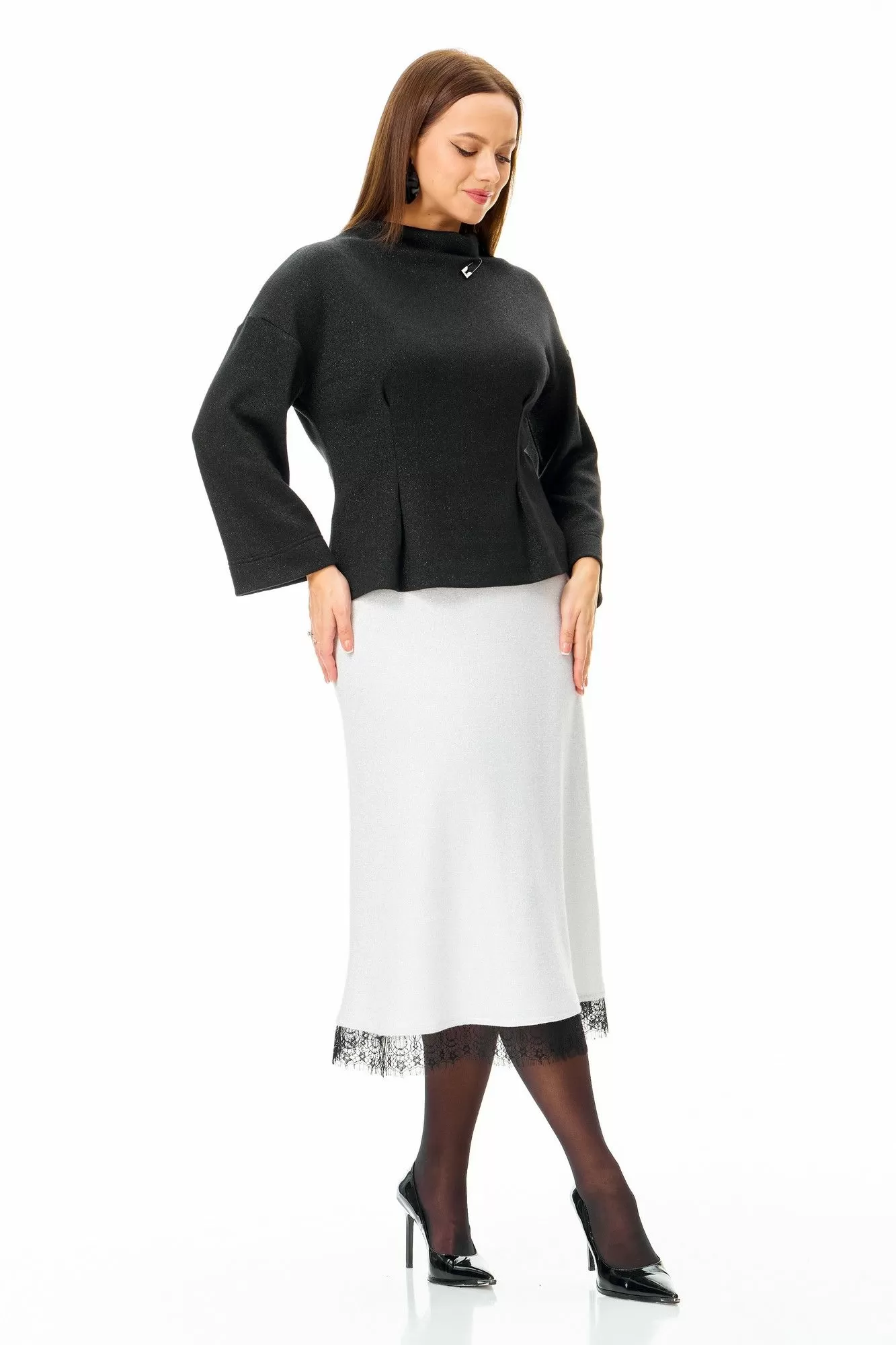Классический черный трикотаж в сочетании с кружевом: слегка приталенный джемпер со съемными манжетами и юбка-midi.