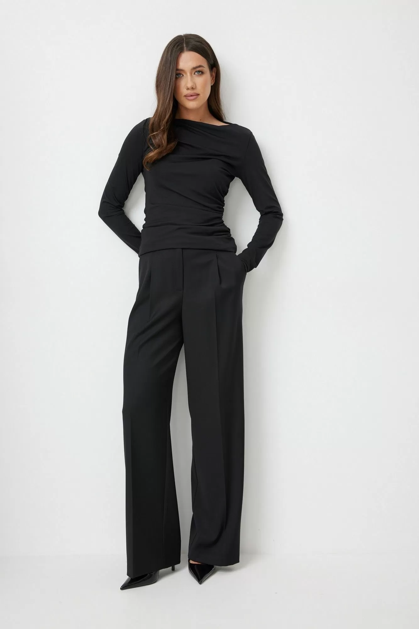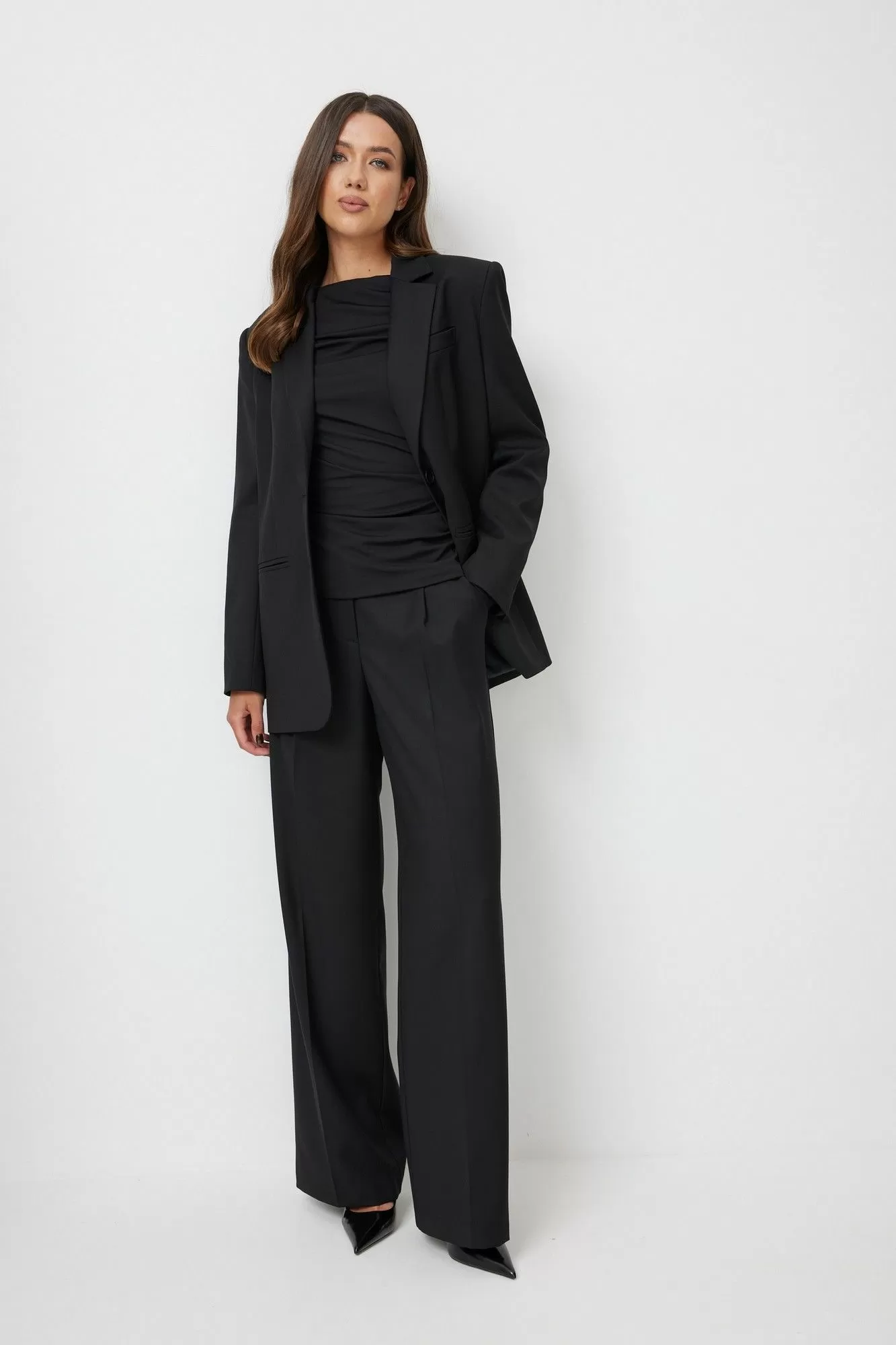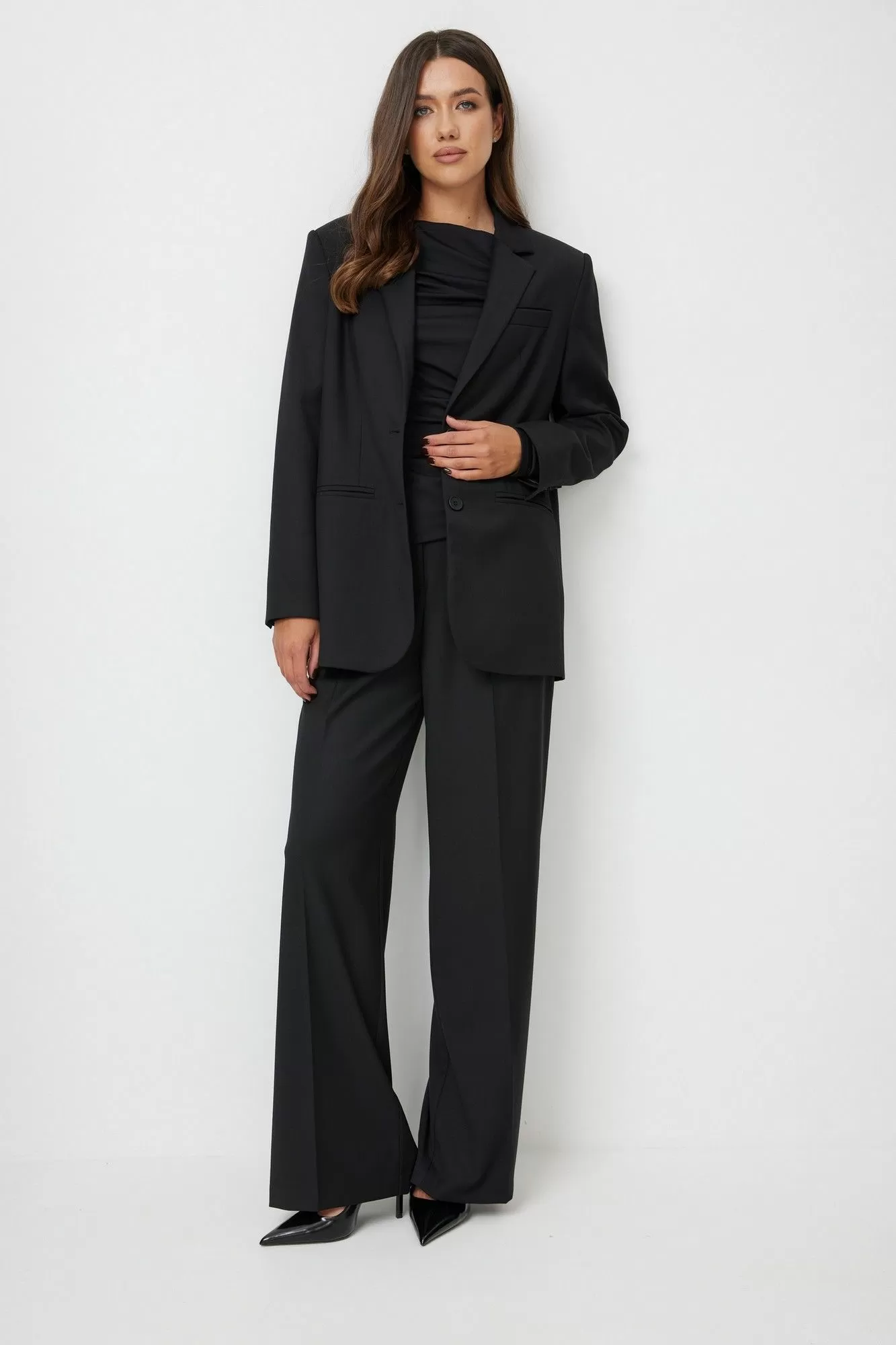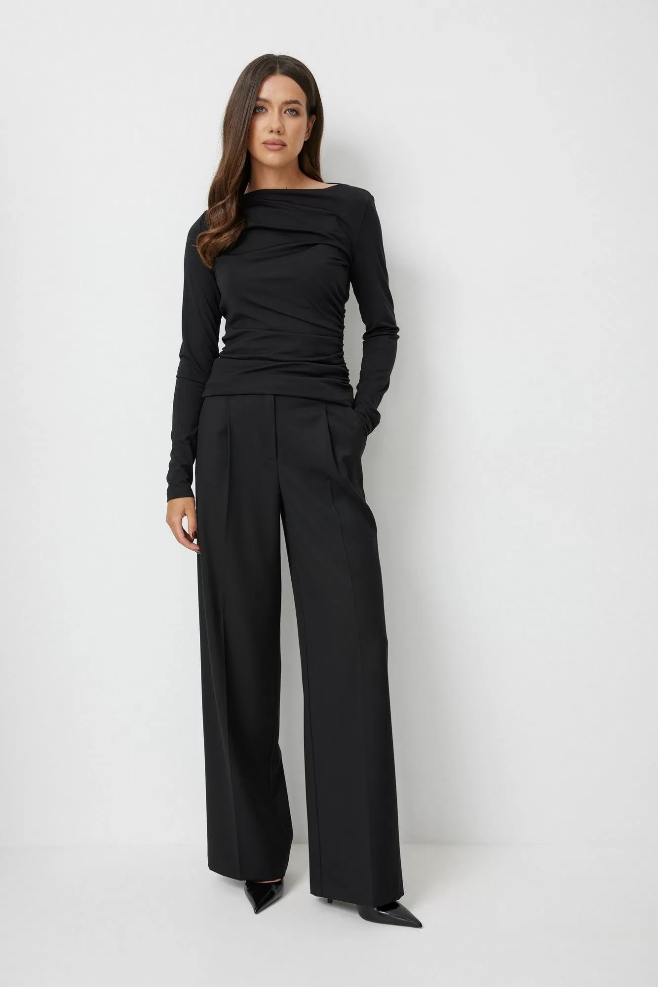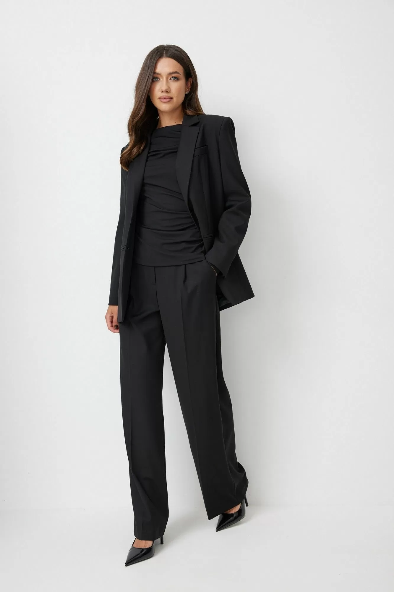 Брюки женские, прямые, с высокой посадкой. Выполнены из костюмной ткани. В боковых подрезах по переду функциональные карманы. Пояс притачной со шлевками, застегивается на потайной крючок. Застежка на тесьму-молнию. По переднему полотнищу встречные складки. Длина брюк по боковому шву с поясом 113 см.