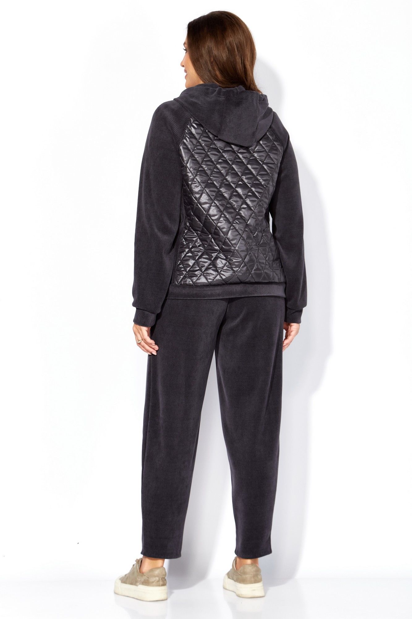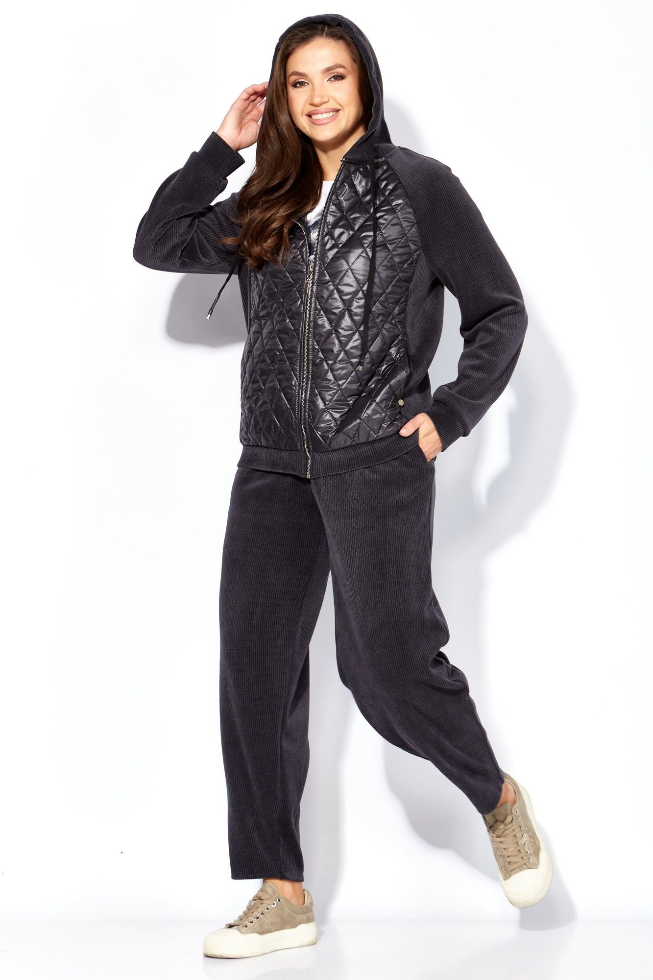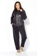 Комплект женский, 2хпредметный, состоящий из куртки и брюк. Куртка прямого силуэта с длинным рукавом. Рукав "реглан" с манжетой по низу. По переду и спинке рельефы из пройм. Спереди, в рельефах, карманы. Застежка центральная, на "молнию". Горловина оформлена капюшоном с кулисой по краю. Низ куртки на манжете. Центральные детали переда и спинки из стежки (плащевка на синтепоне.) Брюки-слаксы, объемные, к низу зауженные. Карманы в боковых швах. Сзади накладной карман с декоративной нашивкой. Пояс цельнокроеный, на резинке.