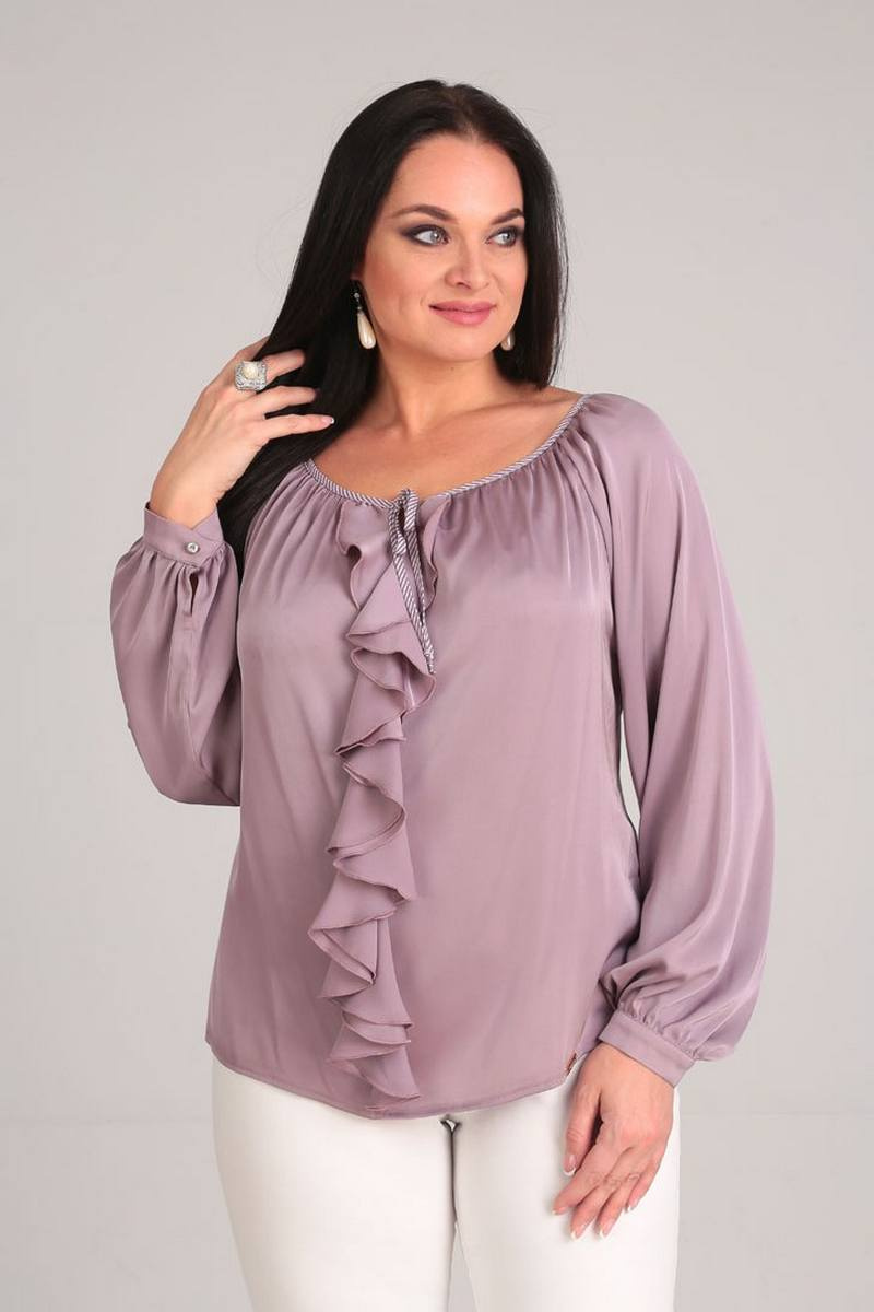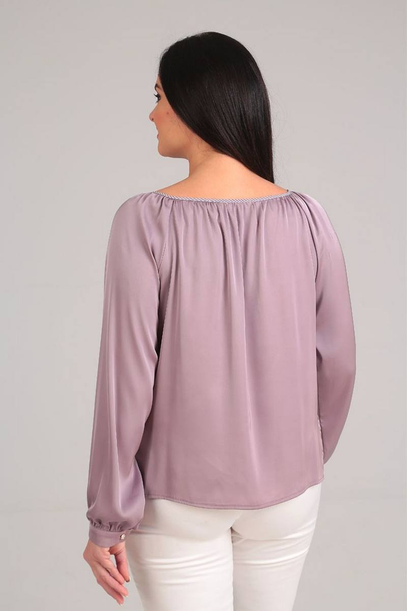 блуза женская, приталенного силуэта. Рукав втачной, реглан. Горловина изделия присборена и окантована. Свободные концы окантовки завязываются бантиком. Низ рукава присборенный на манжет. По бокам изделия обработаны разрезы. По переду обработан центральный шов, в который вставлены два волана.