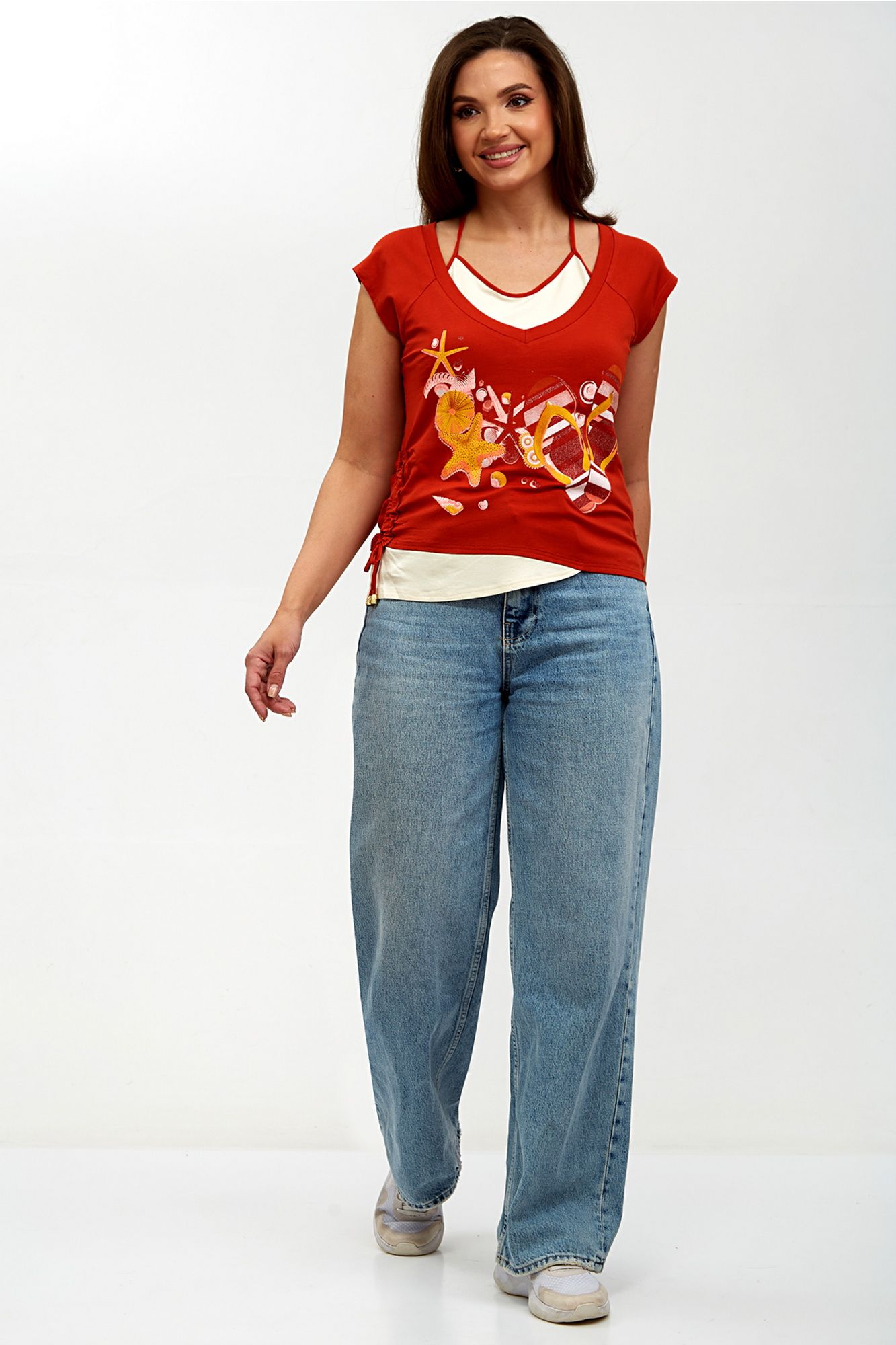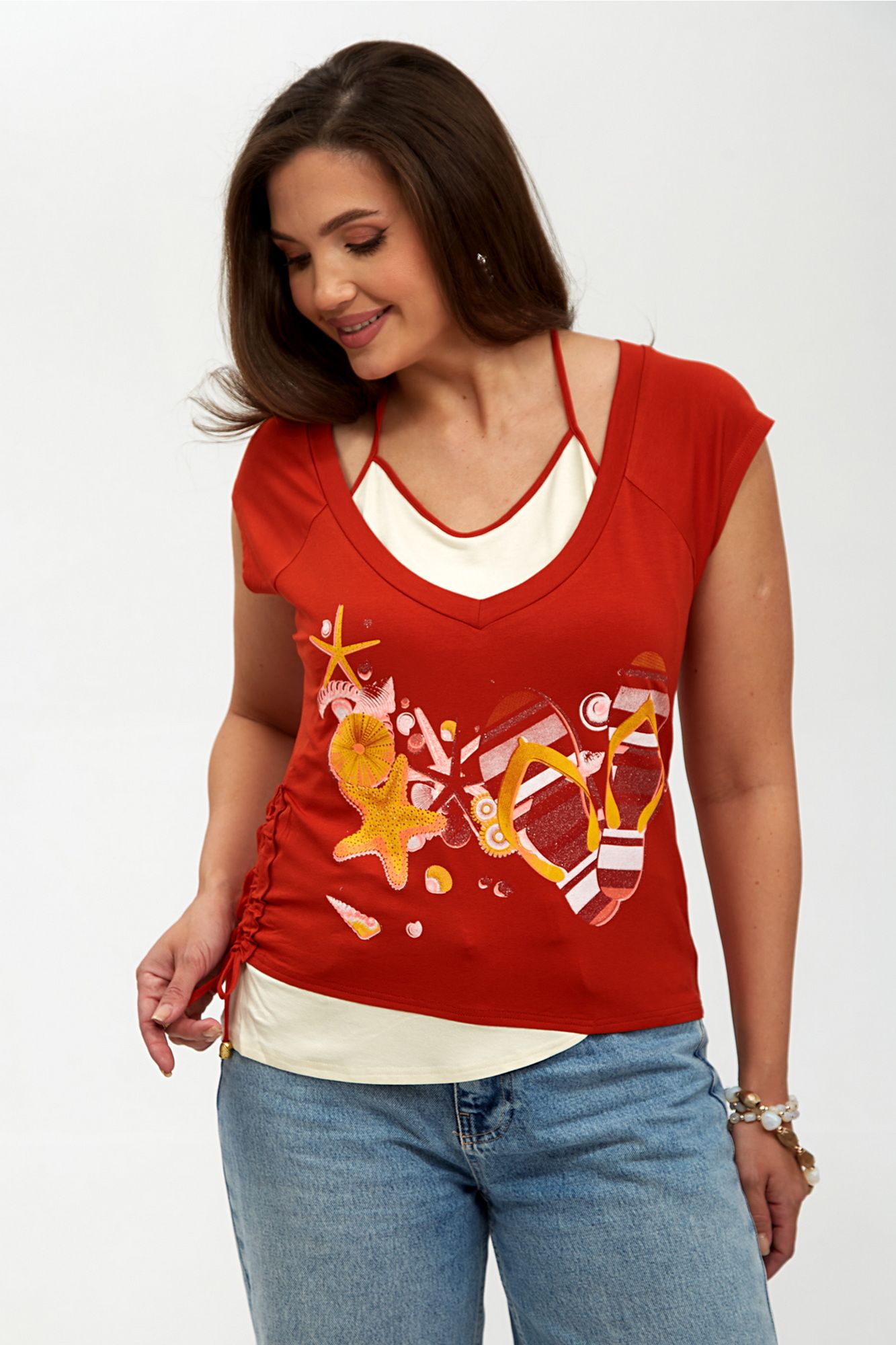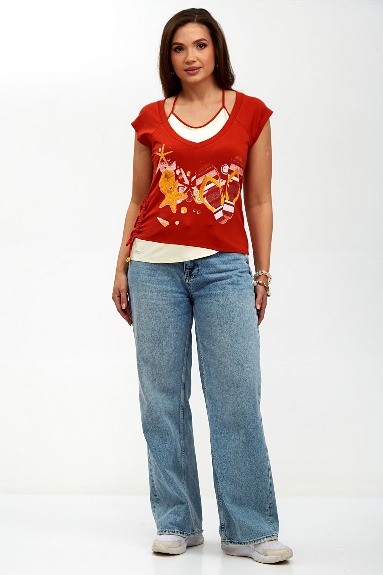Элегантная женская блуза-топ, выполненная из мягкого трикотажного полотна, идеально сочетает комфорт и стиль. Двойная полочка придает изделию объем и утонченность, а реглановые рукава обеспечивают свободу движений и удобство в носке. Горловина внутренней полочки аккуратно окантована, что добавляет изделию завершенности, в то время как основная горловина оформлена двойной бейкой, подчеркивающей изысканный дизайн. Сбоку блузы предусмотрена кулиска, которая позволяет регулировать силуэт и добавляет оригинальности. Спереди расположена стильная печать, придающая блузе уникальный характер и современный вид. Эта блуза станет отличным дополнением вашего гардероба, идеально подходя как для повседневной носки, так и для более нарядных случаев. Внимание: Цветопередача на фото может искажаться от реального цвета ткани и на различных гаджетах выглядеть по-разному. М 62150 46 48 50 52 Длинна спинки, (см) 51 51 52 52 Ширина под проймой, (см) ПОГ 46 48 50 52 Ширина по бедрам, (см) 48 50 52 54