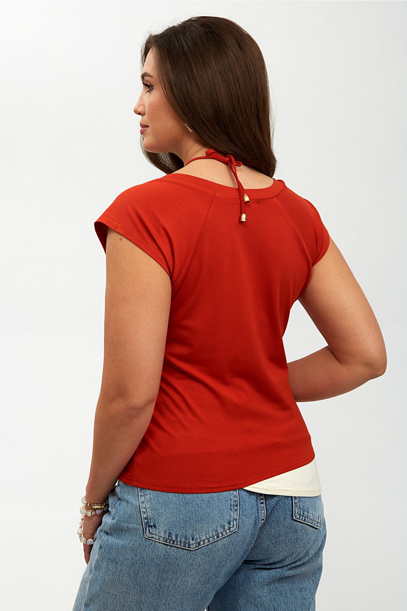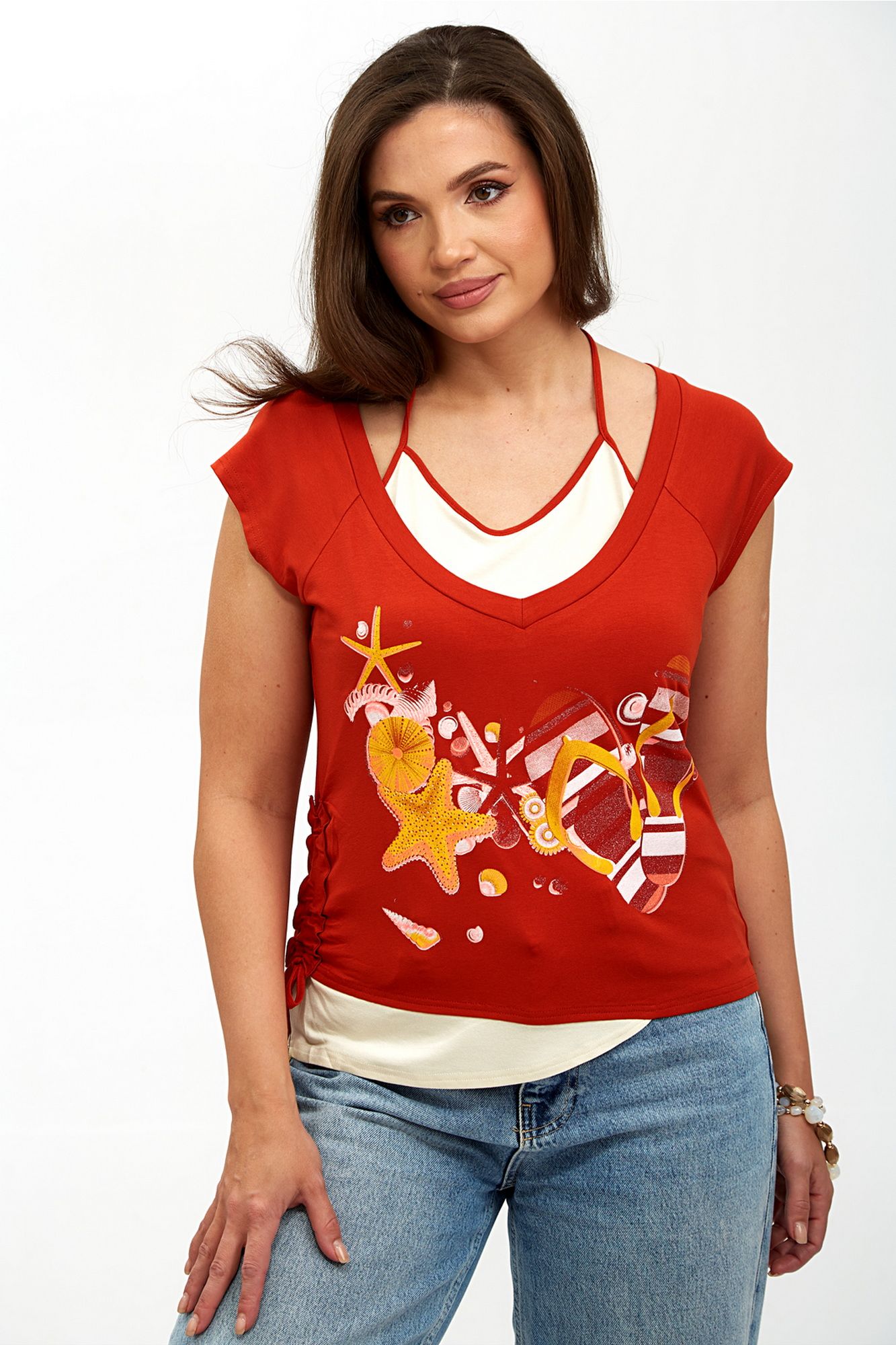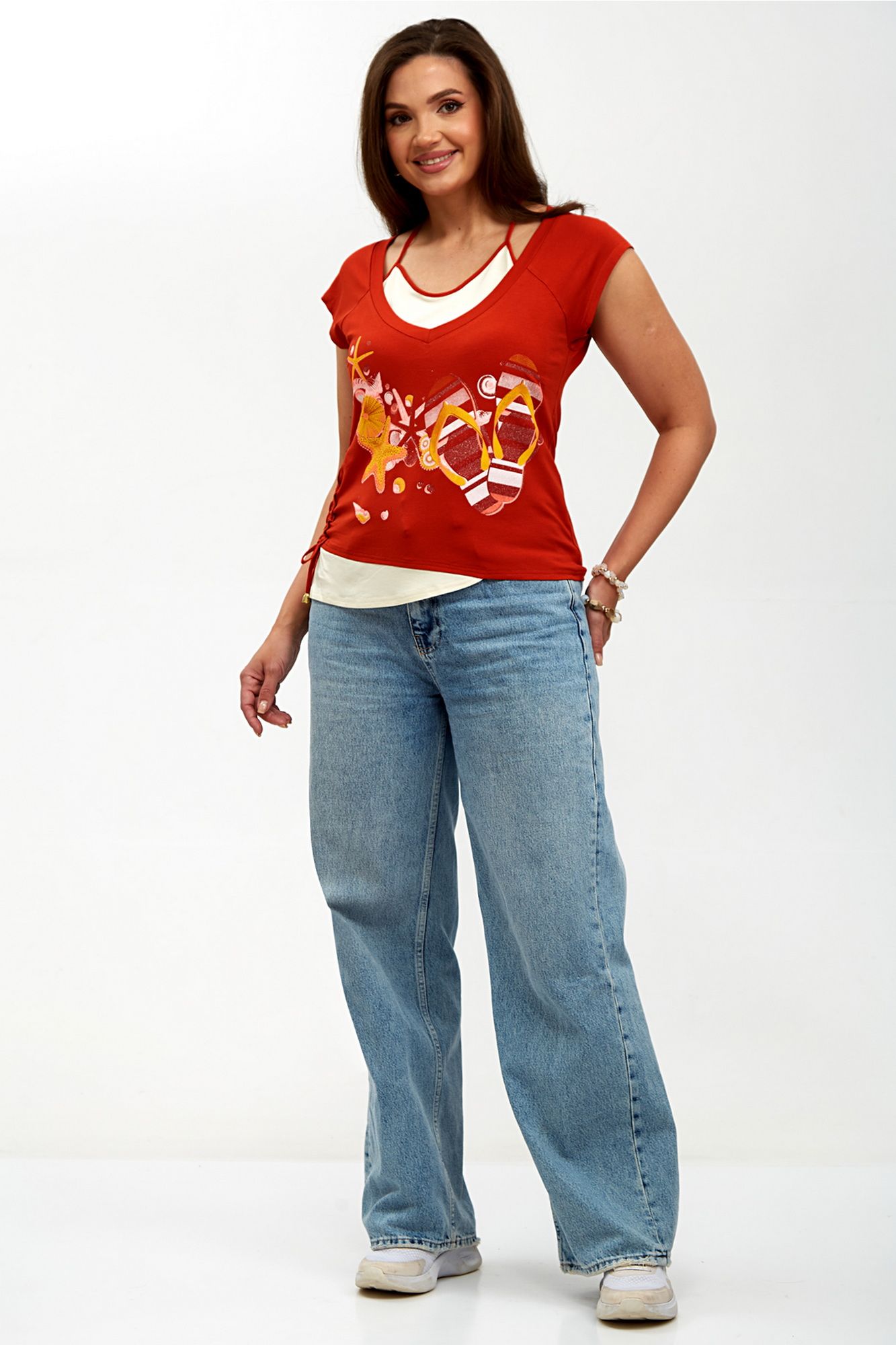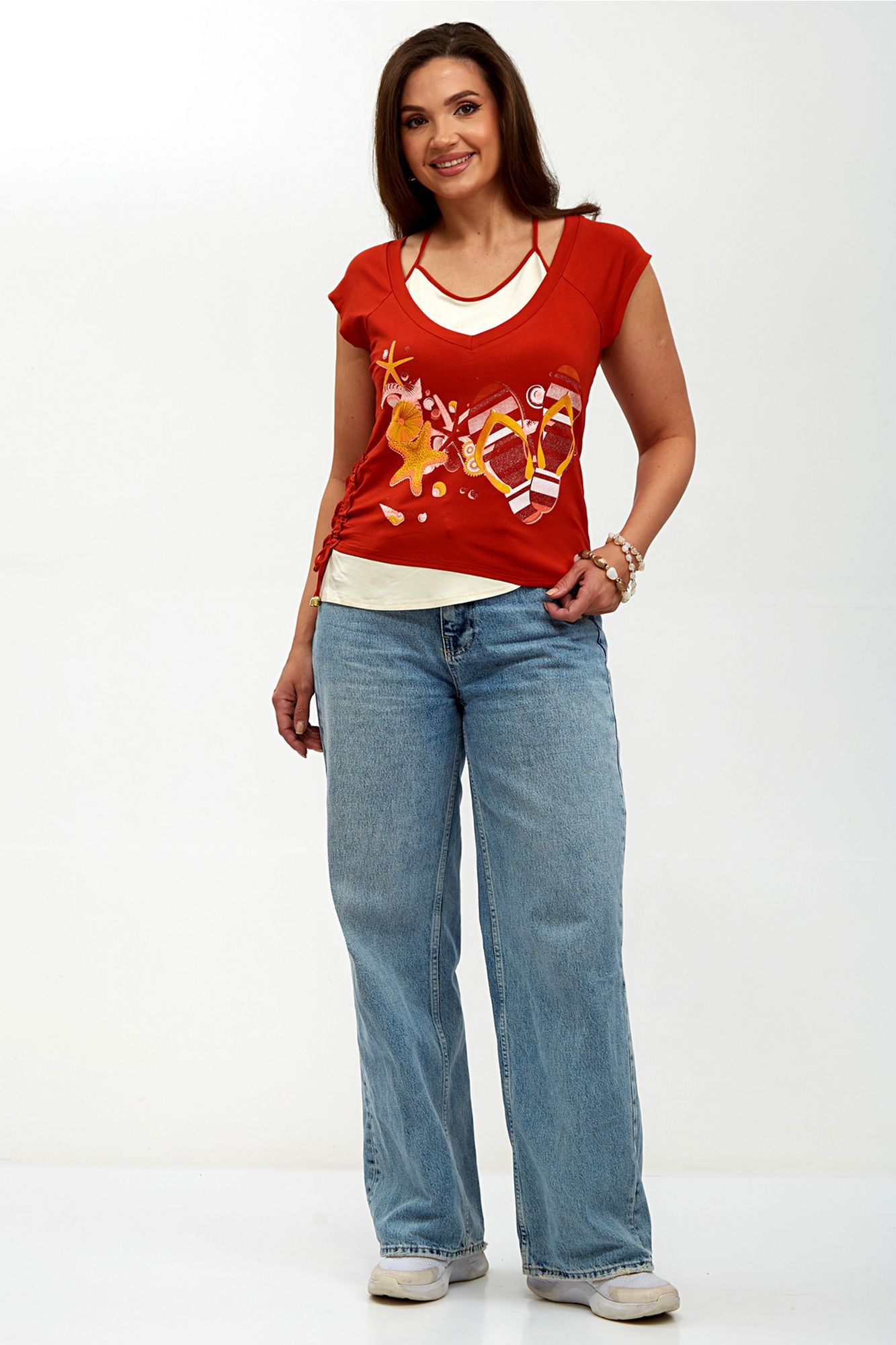 Элегантная женская блуза-топ, выполненная из мягкого трикотажного полотна, идеально сочетает комфорт и стиль. Двойная полочка придает изделию объем и утонченность, а реглановые рукава обеспечивают свободу движений и удобство в носке. Горловина внутренней полочки аккуратно окантована, что добавляет изделию завершенности, в то время как основная горловина оформлена двойной бейкой, подчеркивающей изысканный дизайн. Сбоку блузы предусмотрена кулиска, которая позволяет регулировать силуэт и добавляет оригинальности. Спереди расположена стильная печать, придающая блузе уникальный характер и современный вид. Эта блуза станет отличным дополнением вашего гардероба, идеально подходя как для повседневной носки, так и для более нарядных случаев. Внимание: Цветопередача на фото может искажаться от реального цвета ткани и на различных гаджетах выглядеть по-разному. М 62150 46 48 50 52 Длинна спинки, (см) 51 51 52 52 Ширина под проймой, (см) ПОГ 46 48 50 52 Ширина по бедрам, (см) 48 50 52 54