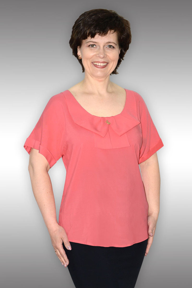 Блуза свободного силуэта с приспущенным рукавом. длина рукава чуть выше локтя, с притачным манжетом, отвернутым вверх внешними краями. По полочке обработан накладной воротник, фигурно завернутый в виде банта. Из-под воротника по центру полочки выступают отделочные детали - как продолжение воротника.