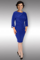 Платье прилегающего силуэта, зауженное книзу. Верхняя часть платья - "летучая мышь", рукав цельнокроеный со швом по центру от горловины. Сзади снизу обработана шлица. От левого плеча идет глубокая лучевая складка, из под которой выходят 3 складки. С правого бокового идут вверх 2 складки, с павого бокового шва идут вниз 4 глубокие складки. Длина изделия по спинке 97-102 см ( в зависимоти от размера), длина рукава от горловины 54-56 см