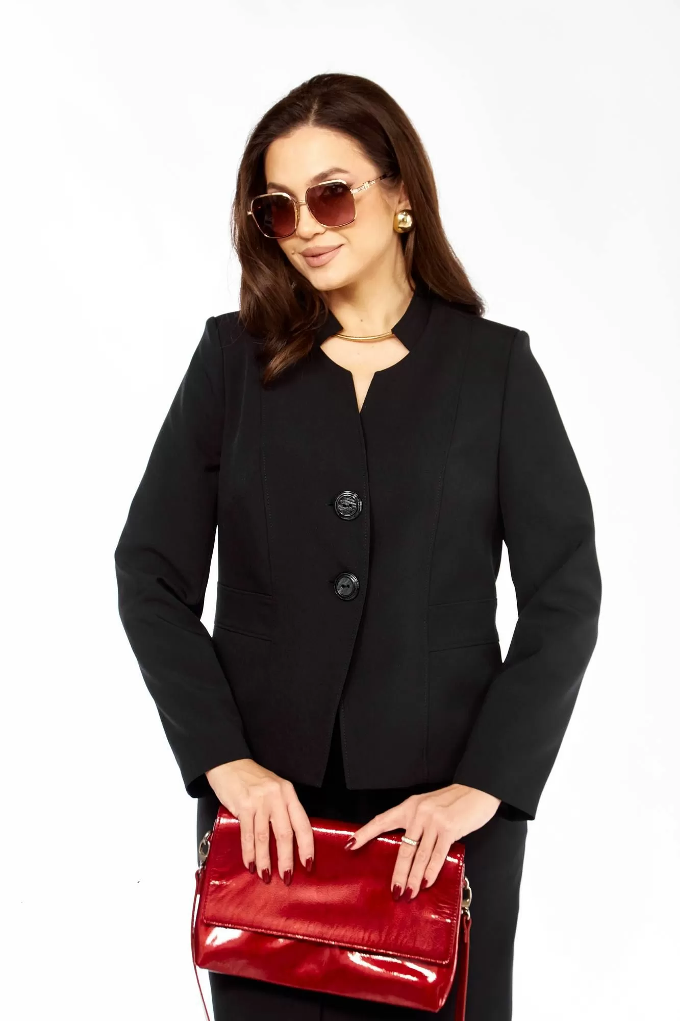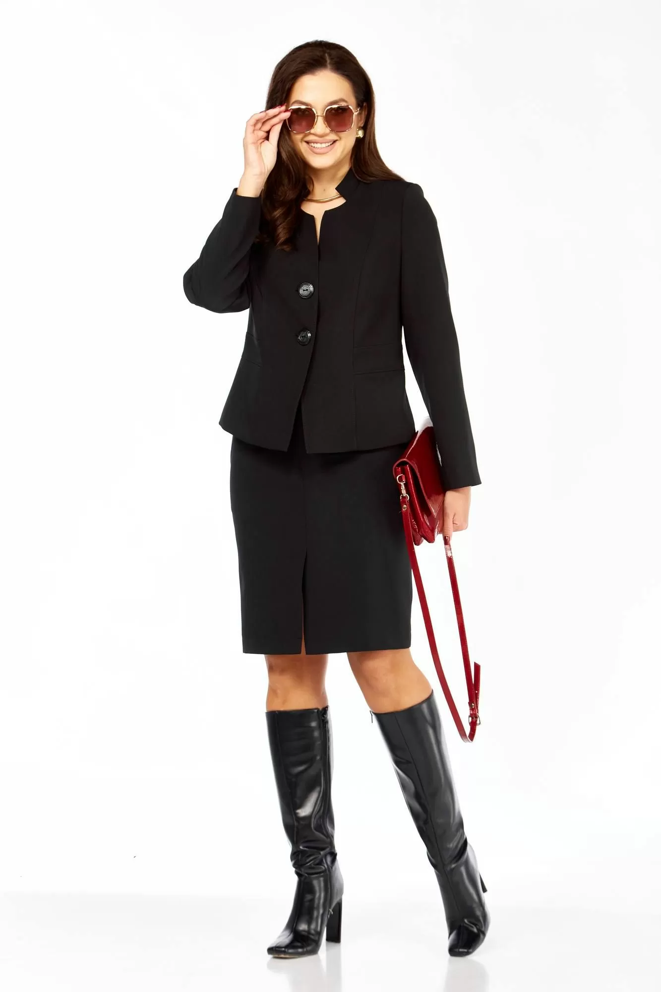 Красивый , элегантный женский комплект , состоит из жакета и юбки . Жакет очень интересного дизайна , с воротничком стойка , с интересным вырезом спереди , на двух пуговицах. Жакет полностью на подкладке , с длинным рукавом. Длина жакета по спинке от плеча -57,5 см , длина рукава- 61,5 см. Юбка слегка заужена книзу ,спереди шлица, пояс по бакам на резинке , сбоку юбки функциональные карманы. Длина юбки -60 см Ткань костюмно- плательная 96 пэ 4 спандекс. Рост модели 173 см