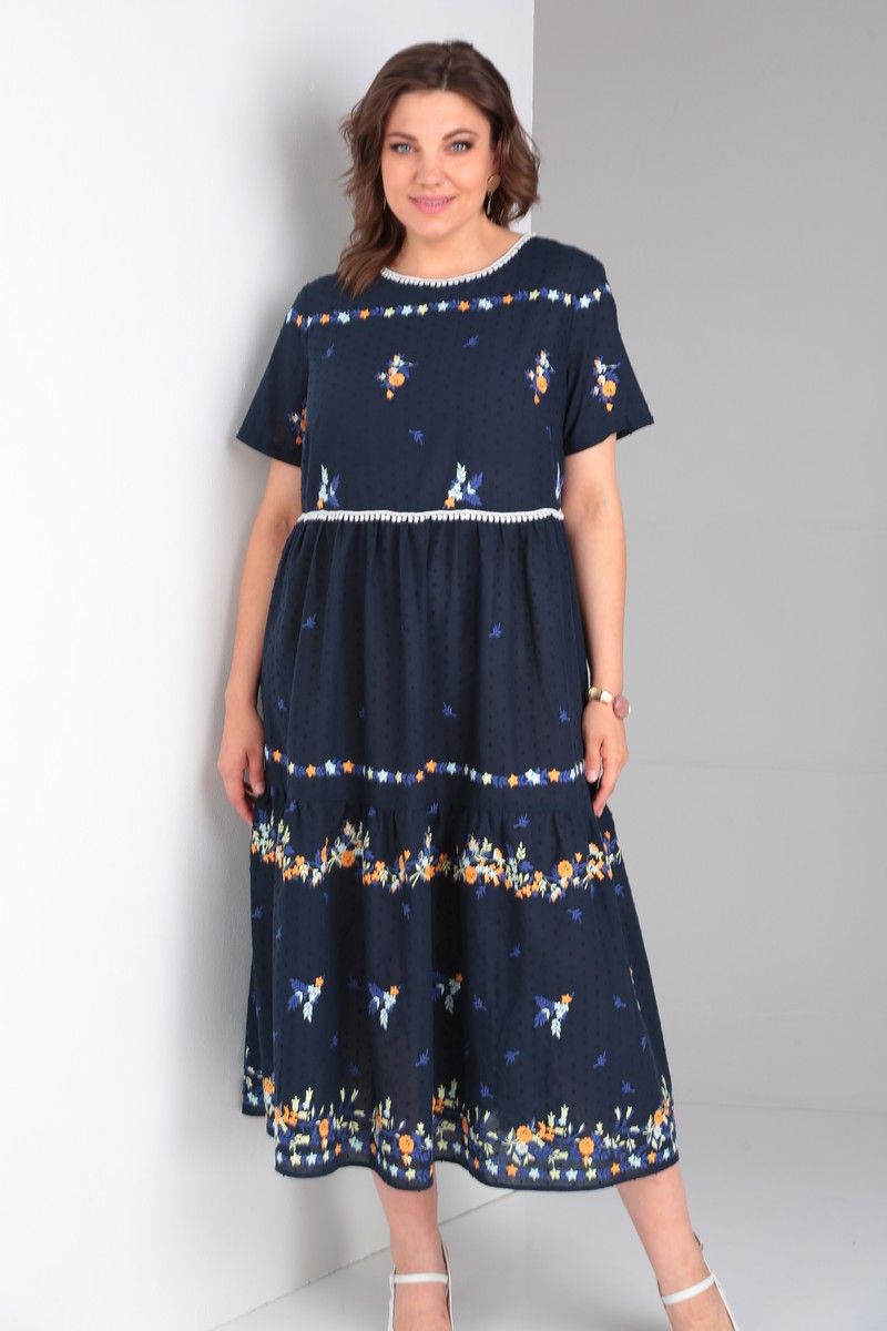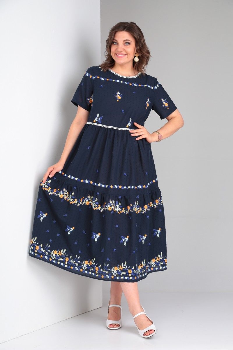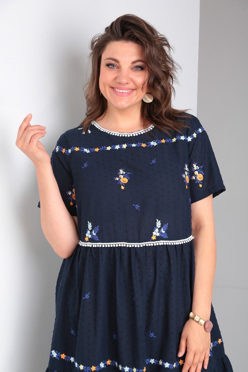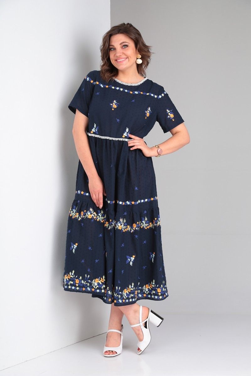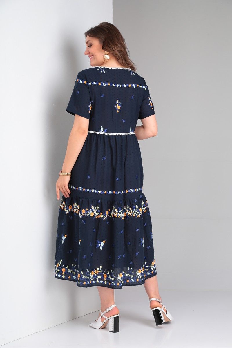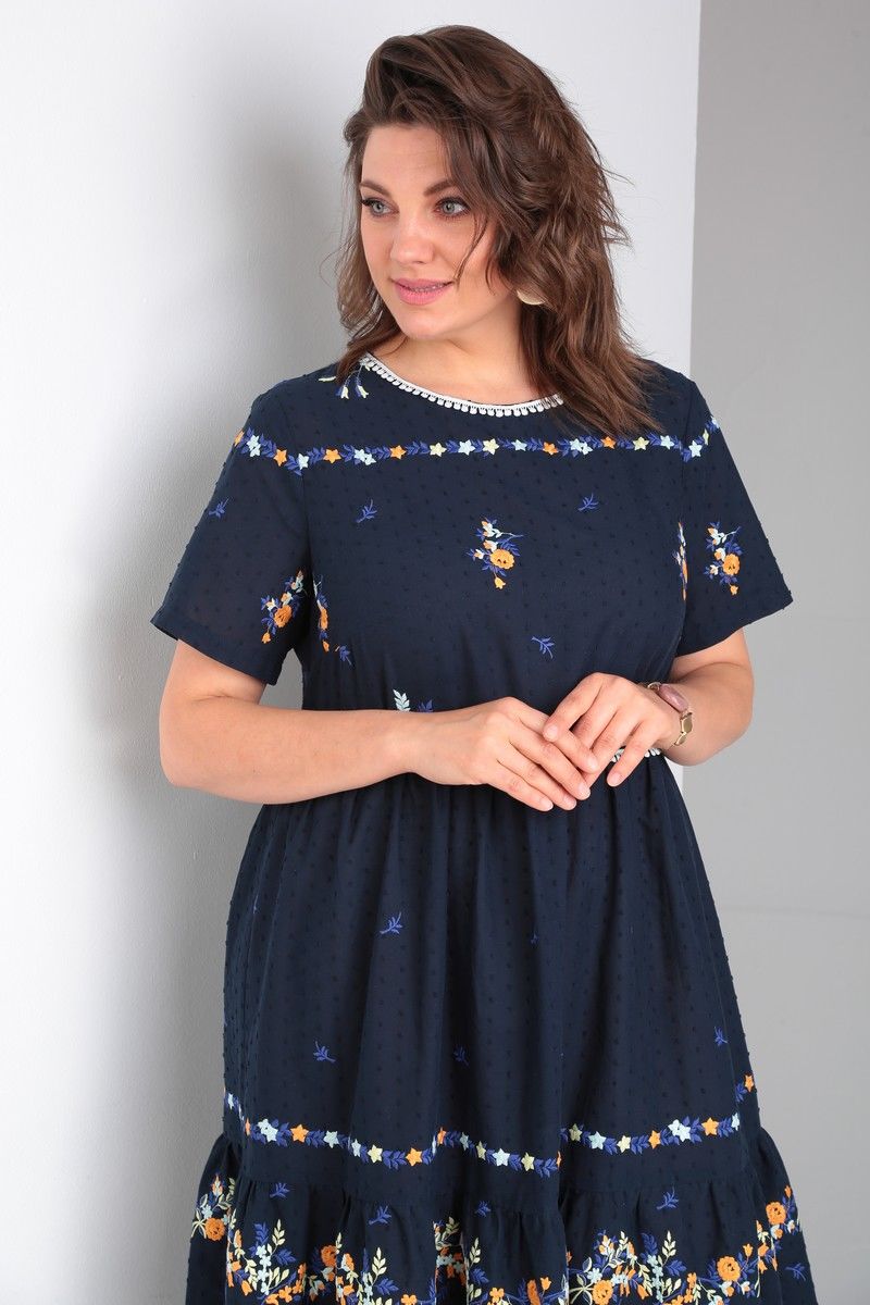 Платье из хлопка с вышивкой, свободного силуэта, с двумя оборками, коротким рукавом, круглым вырезом, «застежкой-молний» в боковом шве. Швы по линии талии и горловины отделаны кружевом. Длина по спинке 125. Длина рукава 23