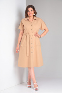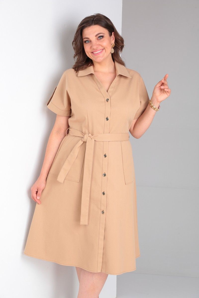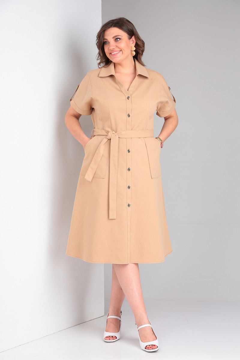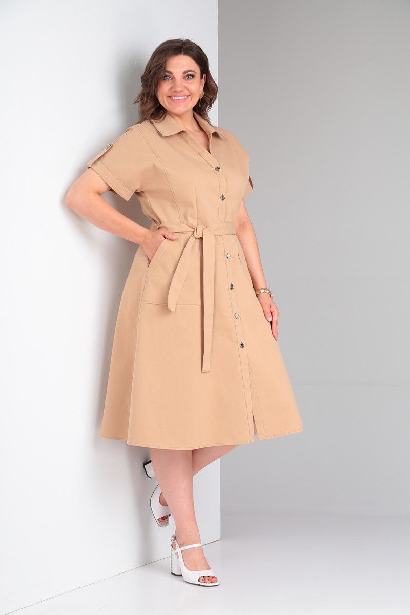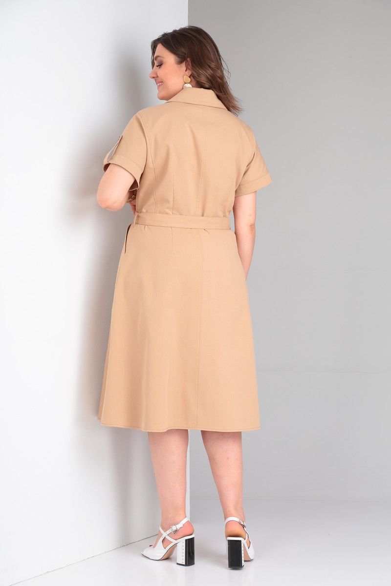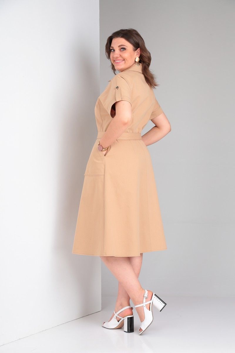 Платье в стиле «сафари» из ткани с хлопком, прилегающего силуэта, отрезное по линии талии, с цельнокроеным рукавом, центральной бортовой застежкой на петли и пуговицы, отложным воротником. Перед и спинка лифа с отрезными бочками и талиевыми вытачками. Юбка платья с накладными карманами на переде и средним швом и талиевыми вытачками по спинке. Низ рукава обработан обтачкой и патой с застежкой на петли и пуговицы. Длина по спинке 112. Длина рукава 21.