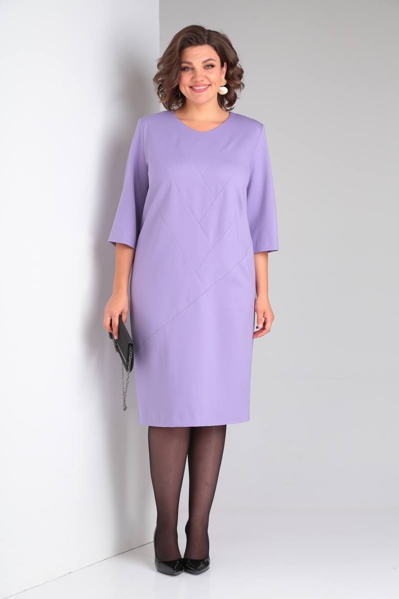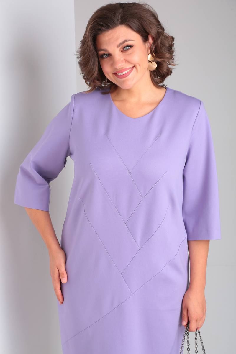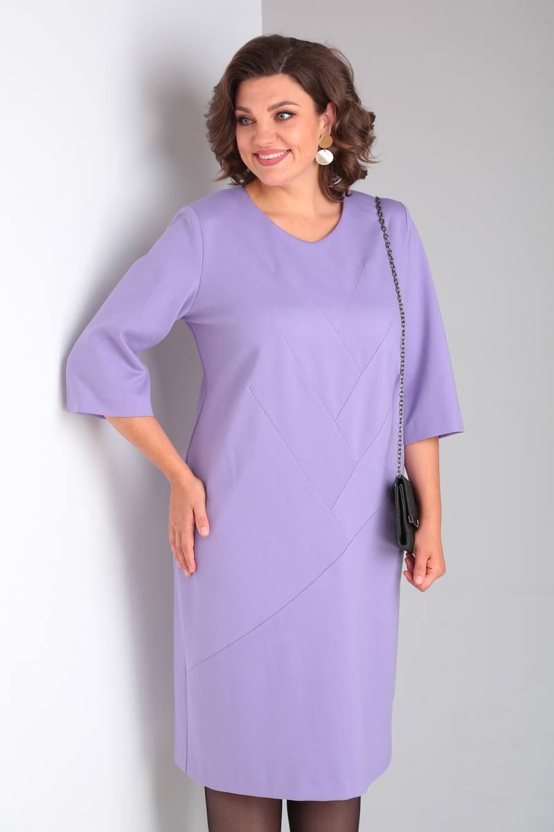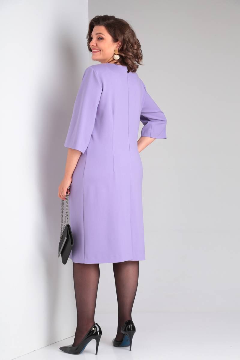 Платье трикотажное прилегающего силуэта, длиной ниже колена. Перед оформлен фигурными подрезами “ёлочка”. Спинка со среднимшвом, вытачками, застежкой на потайную-молнию, шлицей. Рукав одношовный втачной, длиной ¾. Вырез горловины круглый