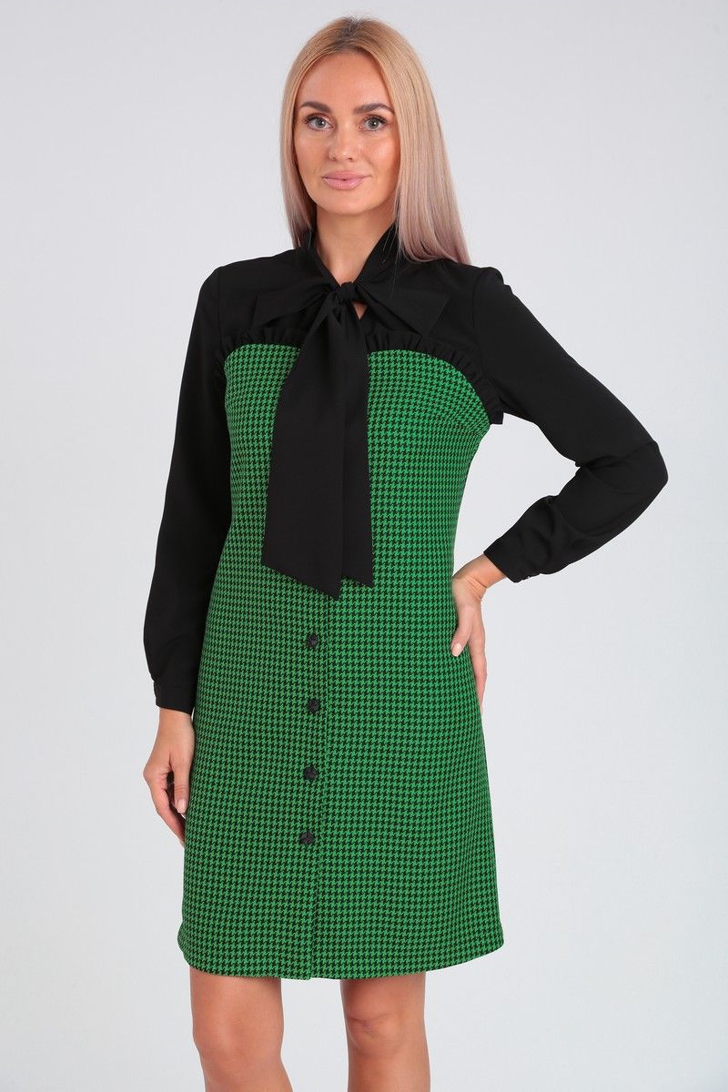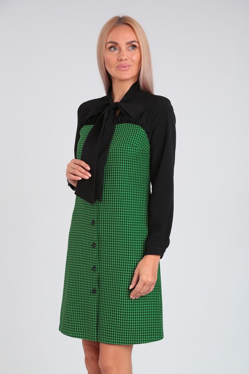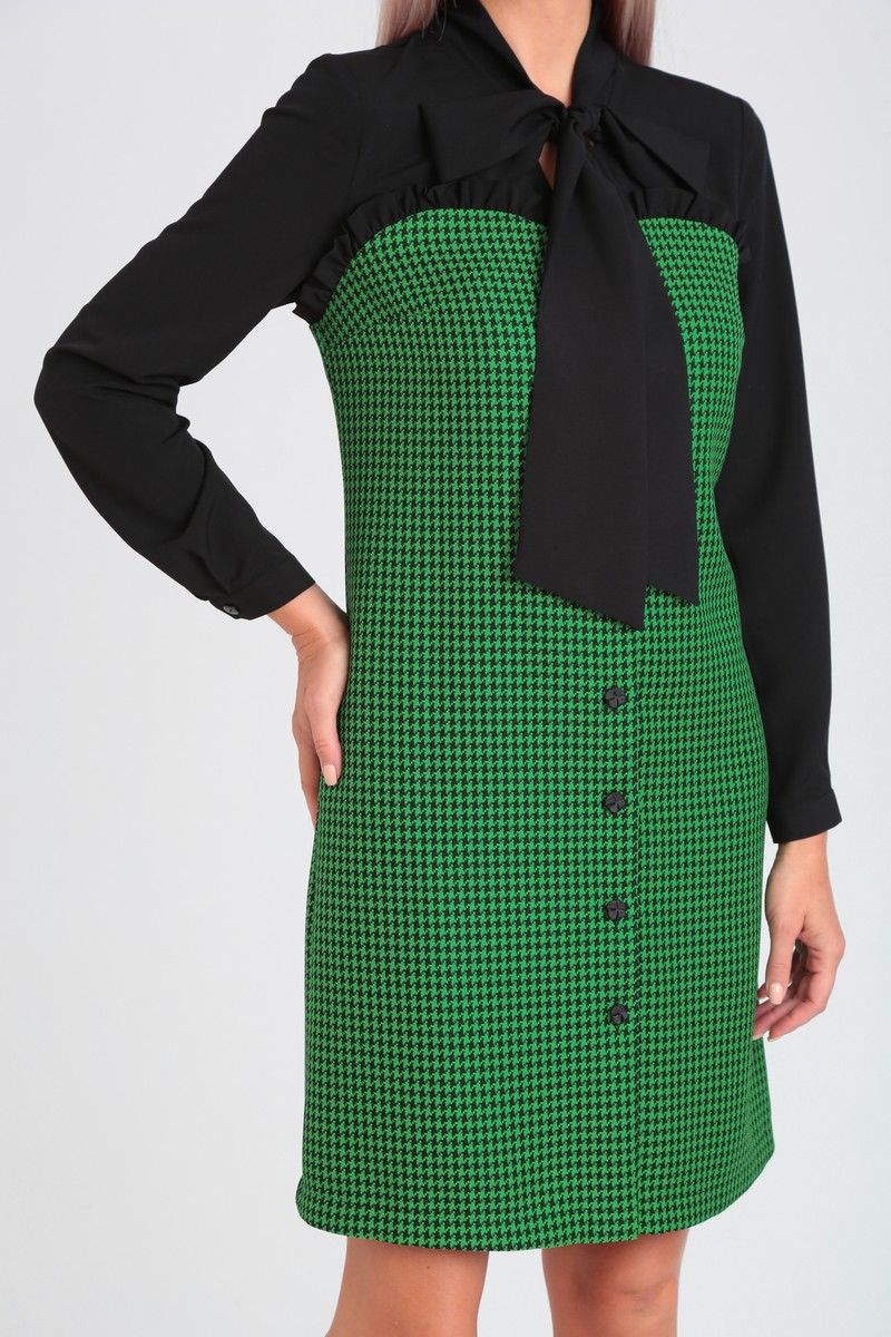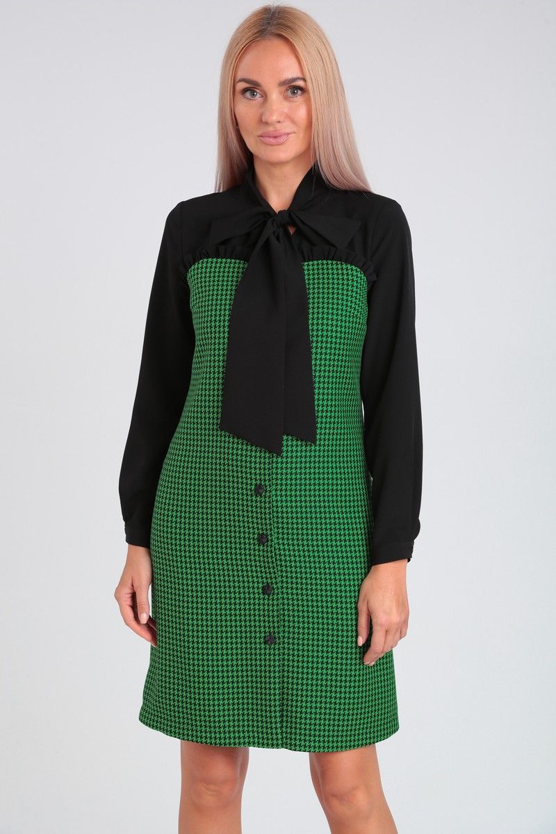Платье из костюмной ткани и крепа, полуприлегающего силуэта, с центральной бортовой застежкой на петли и пуговицы. Перед с нагрудными вытачками, фигурным подрезом, с воротником, завязывающимся на бант. Рукав втачной одношовный, с манжетой с застежкой на петли и пуговицы. Длина по спинке 90. Длина рукава 64. Фурнитура может отличаться.