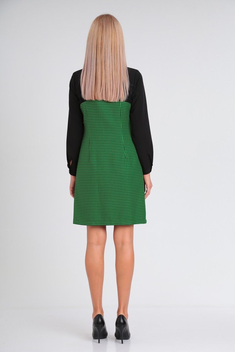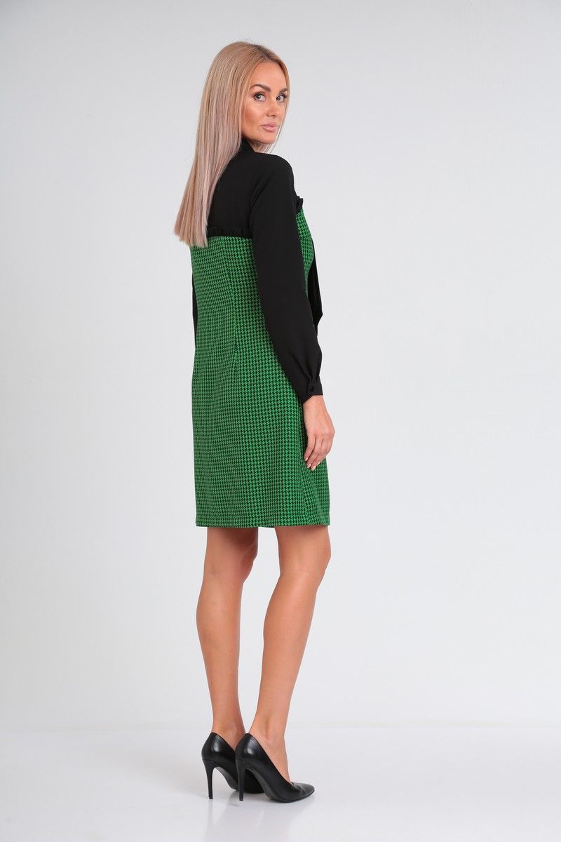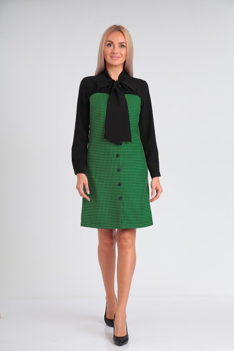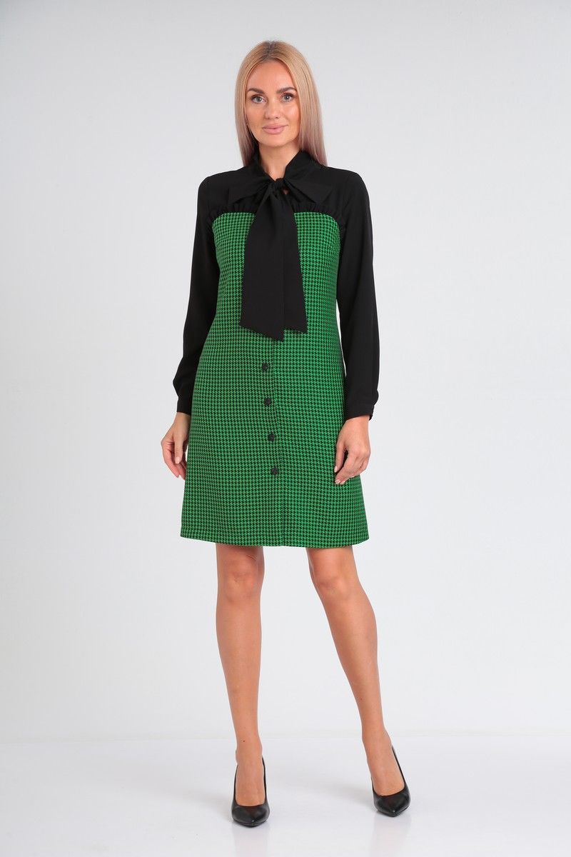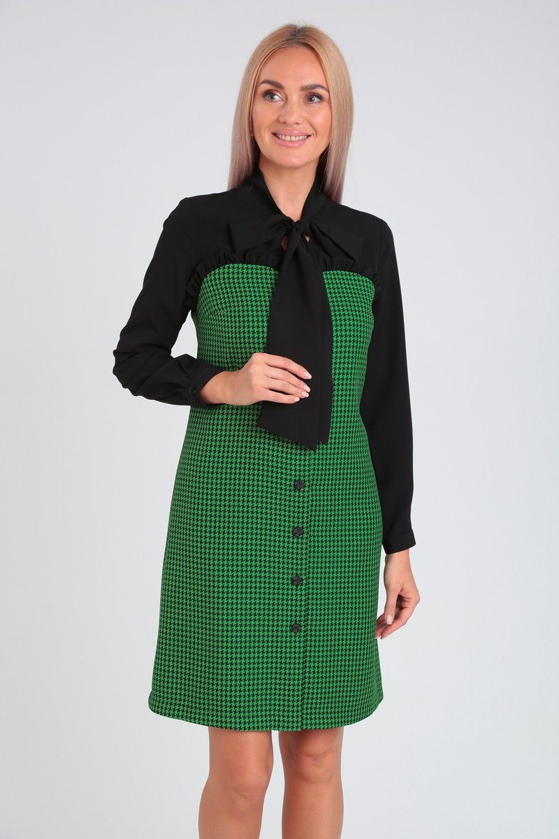 Платье из костюмной ткани и крепа, полуприлегающего силуэта, с центральной бортовой застежкой на петли и пуговицы. Перед с нагрудными вытачками, фигурным подрезом, с воротником, завязывающимся на бант. Рукав втачной одношовный, с манжетой с застежкой на петли и пуговицы. Длина по спинке 90. Длина рукава 64. Фурнитура может отличаться.