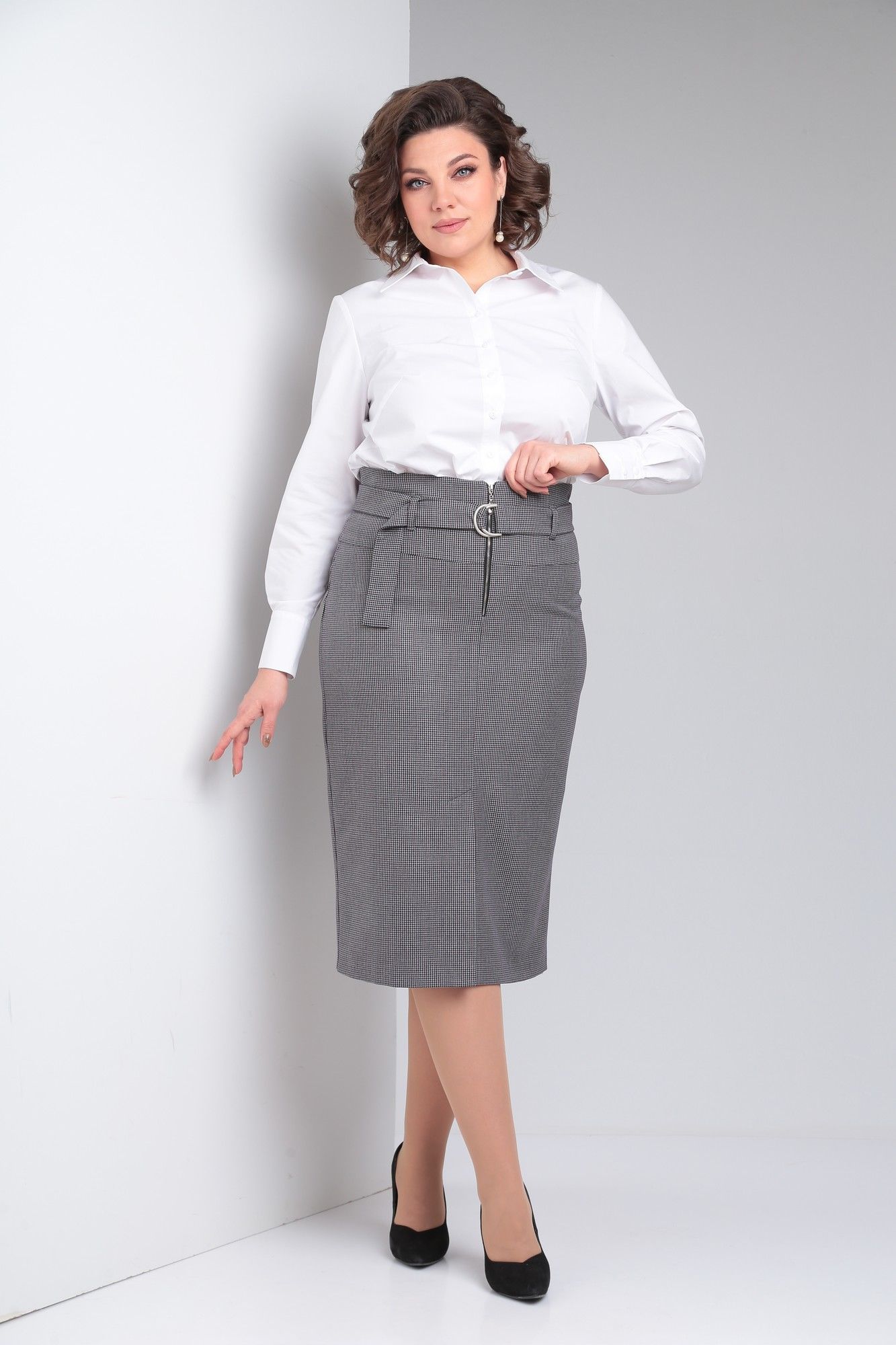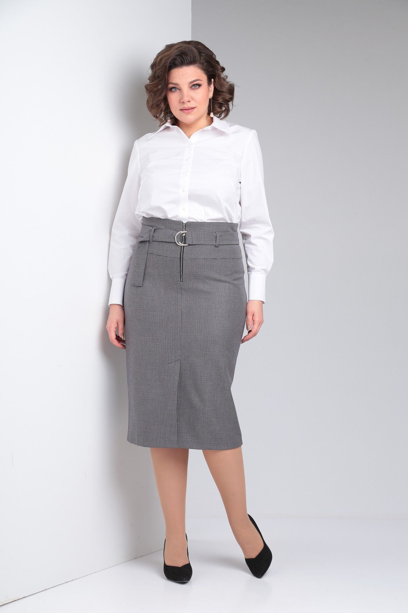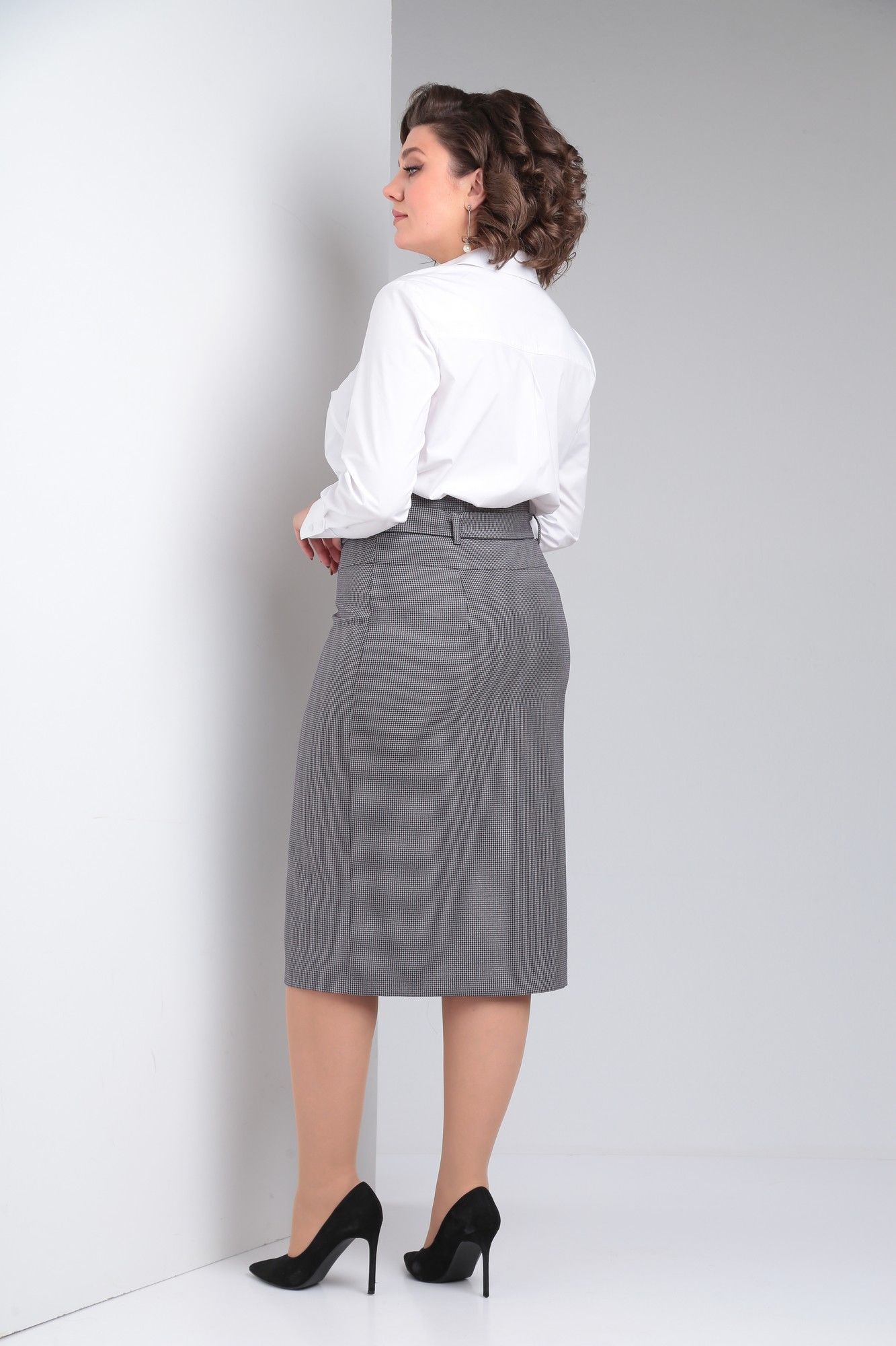 Юбка из костюмной ткани на подкладке, слегка зауженная к низу, с талиевыми вытачками на заднем полотнище, со шлицей и застежкой - «молнией» на переднем полотнище. Юбка с завышенной линией талии и поясом из основной ткани.