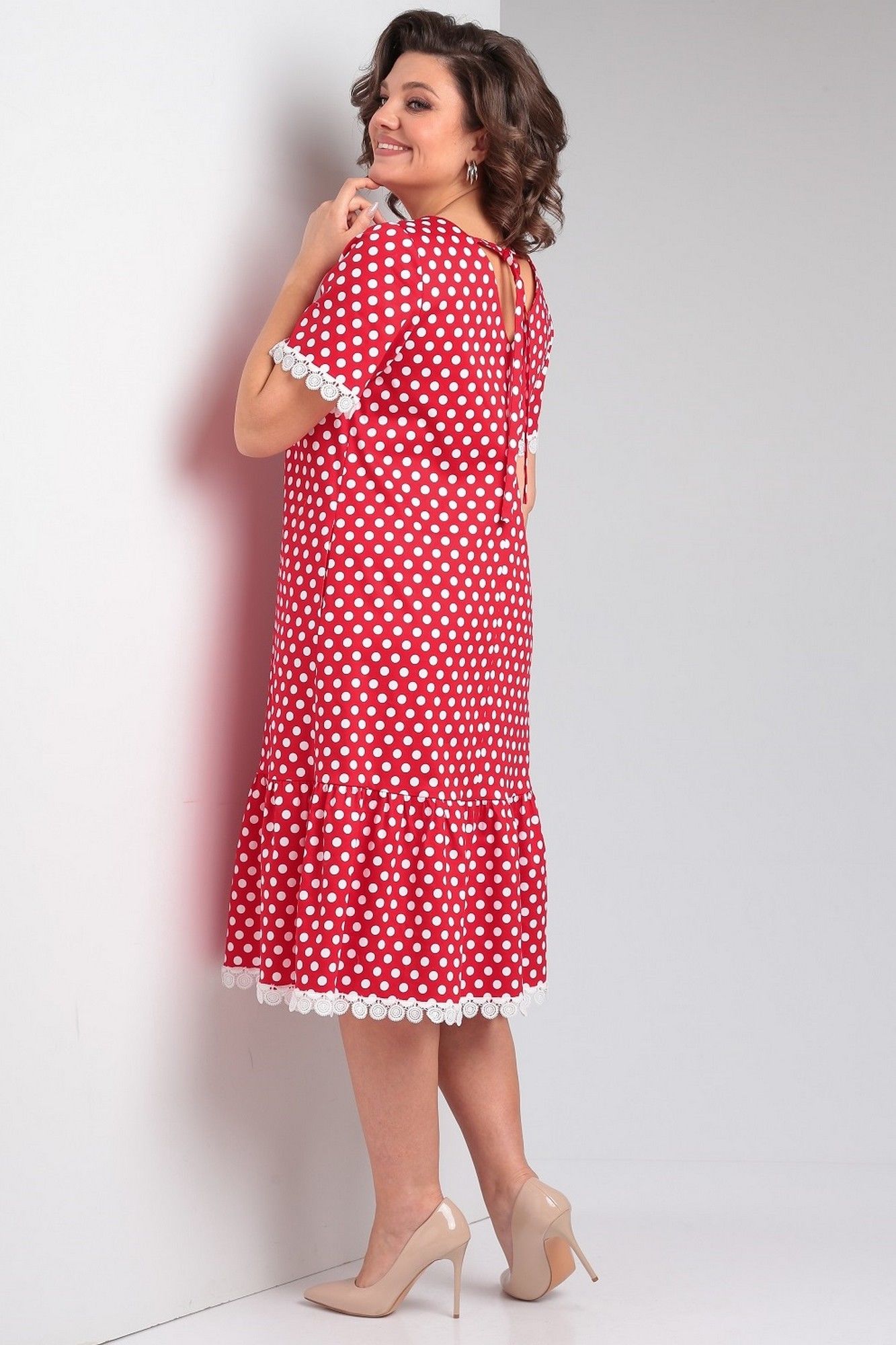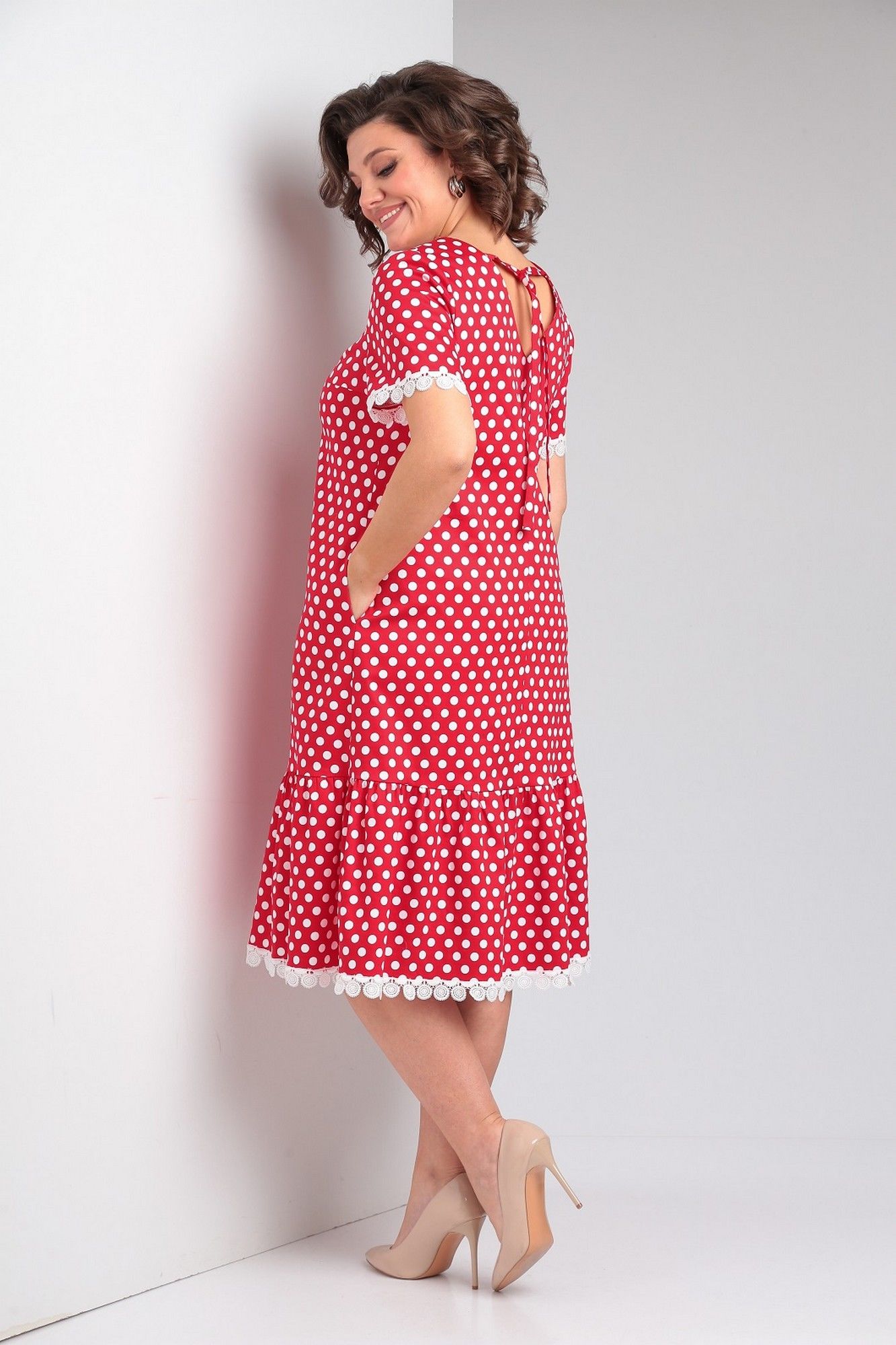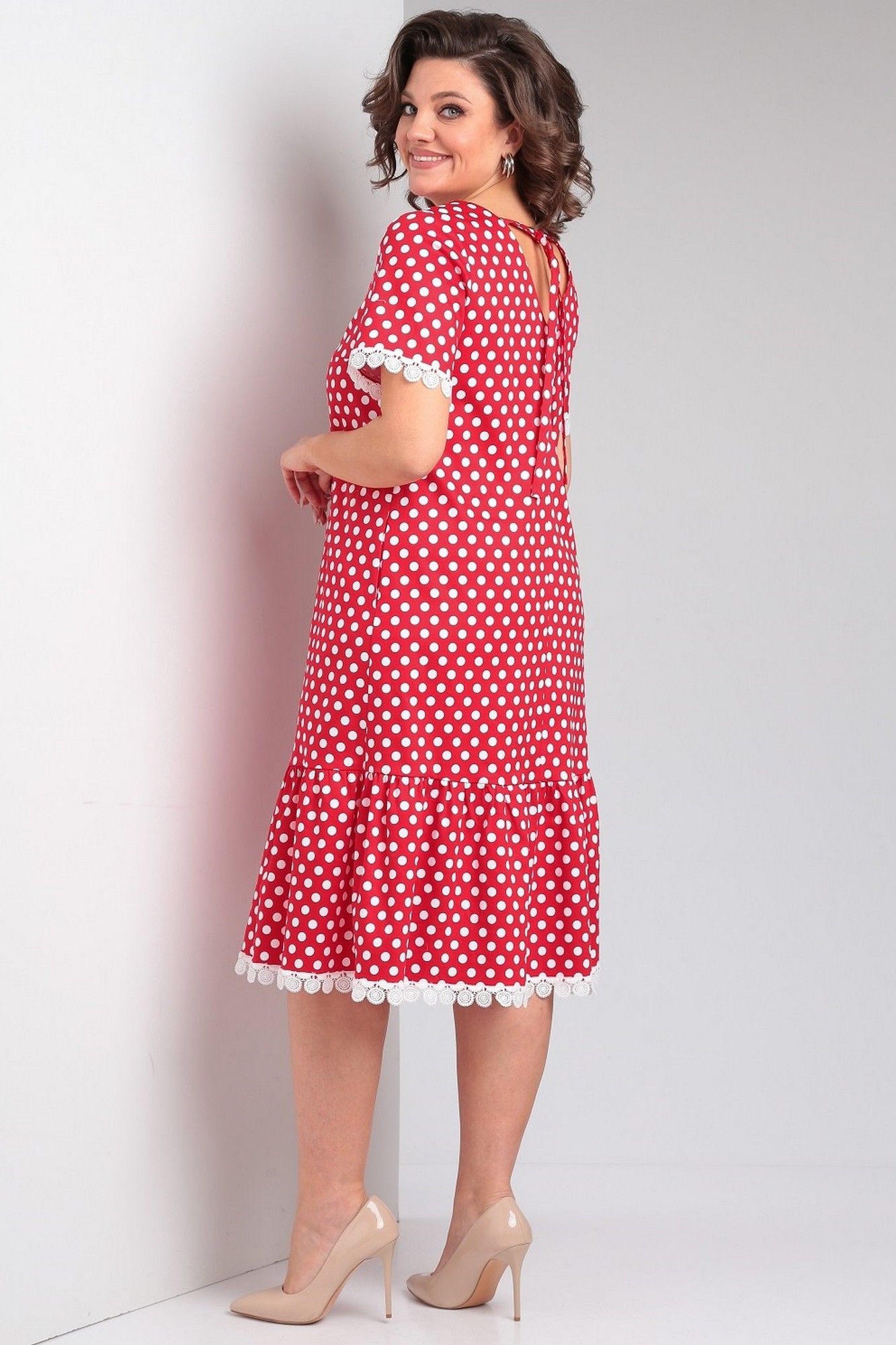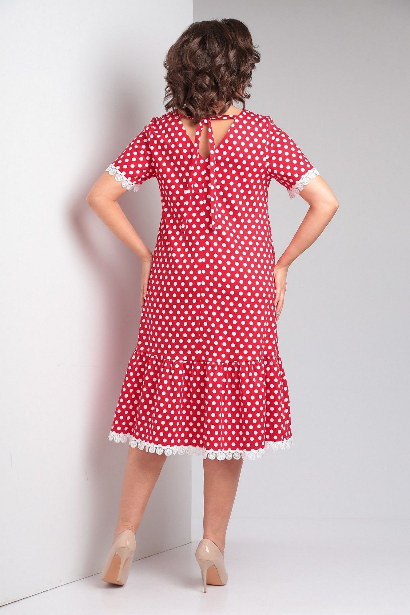 Платье из ткани с хлопком свободного силуэта с оборкой, с нагрудными вытачками, круглым вырезом горловины по переду и V -образным вырезом с завязкой по спинке. Рукав втачной одношовный короткий. Низ рукава и оборки обработан кружевом. Длина по спинке от плеча 113. Длина рукава 24.