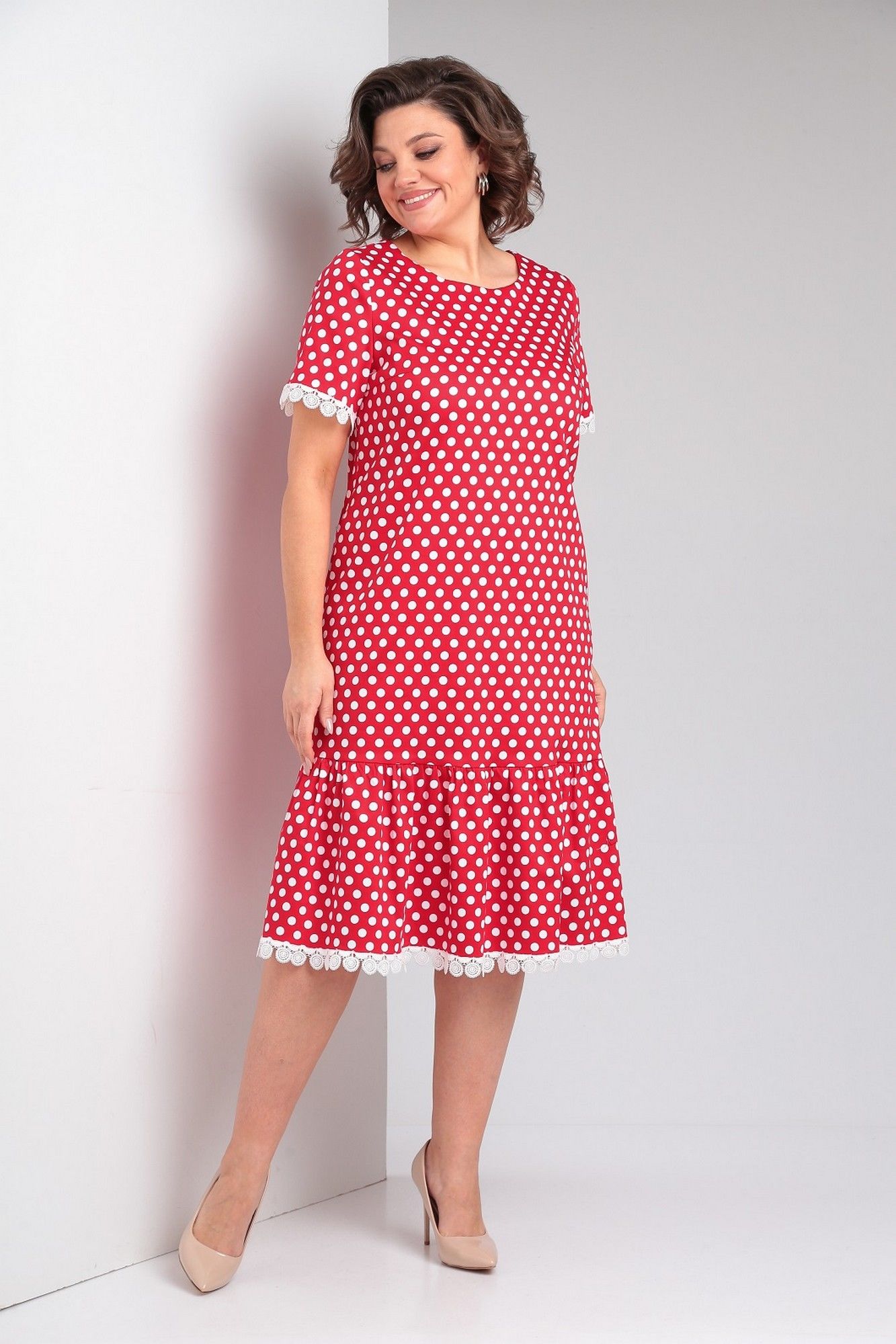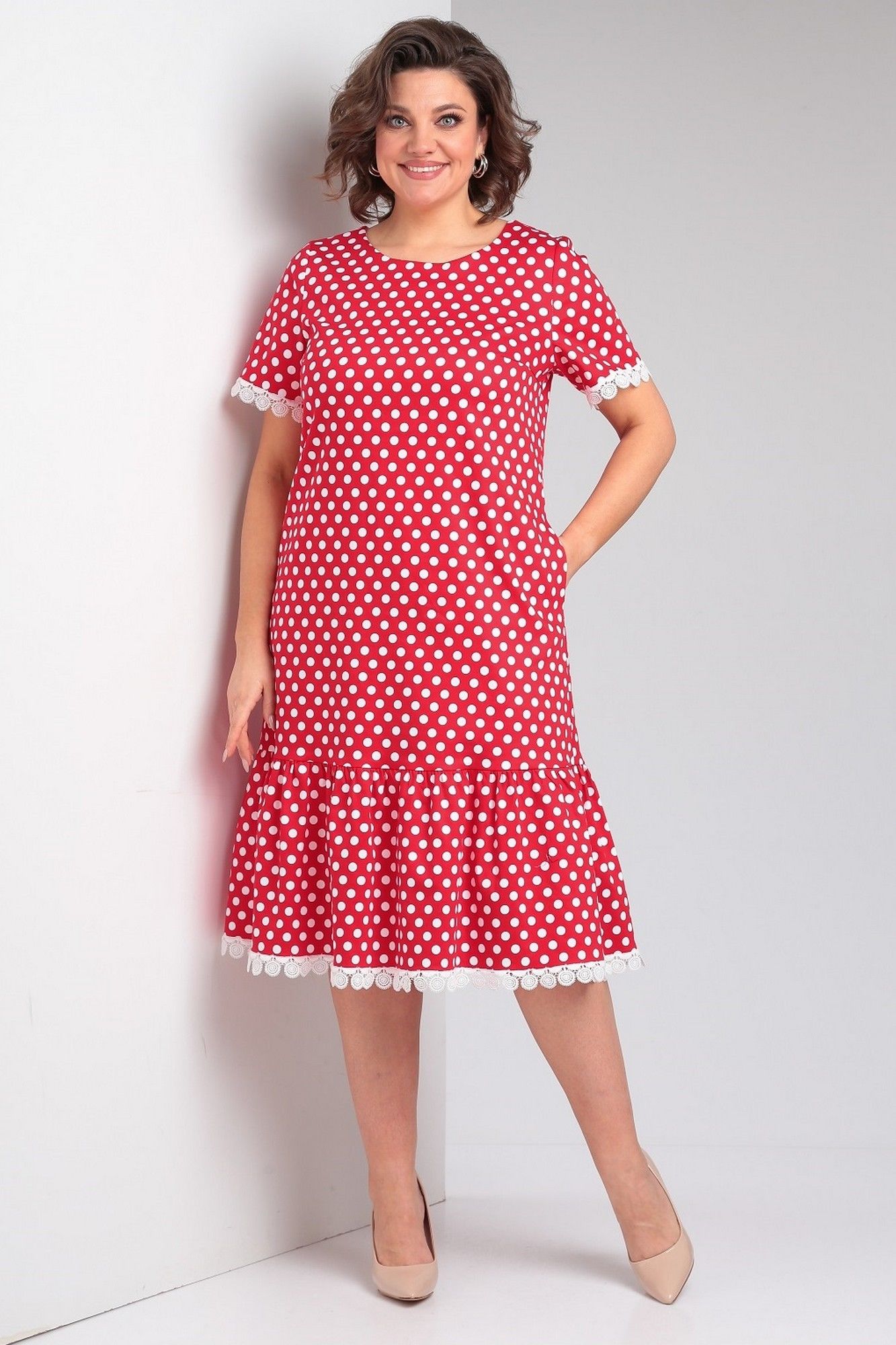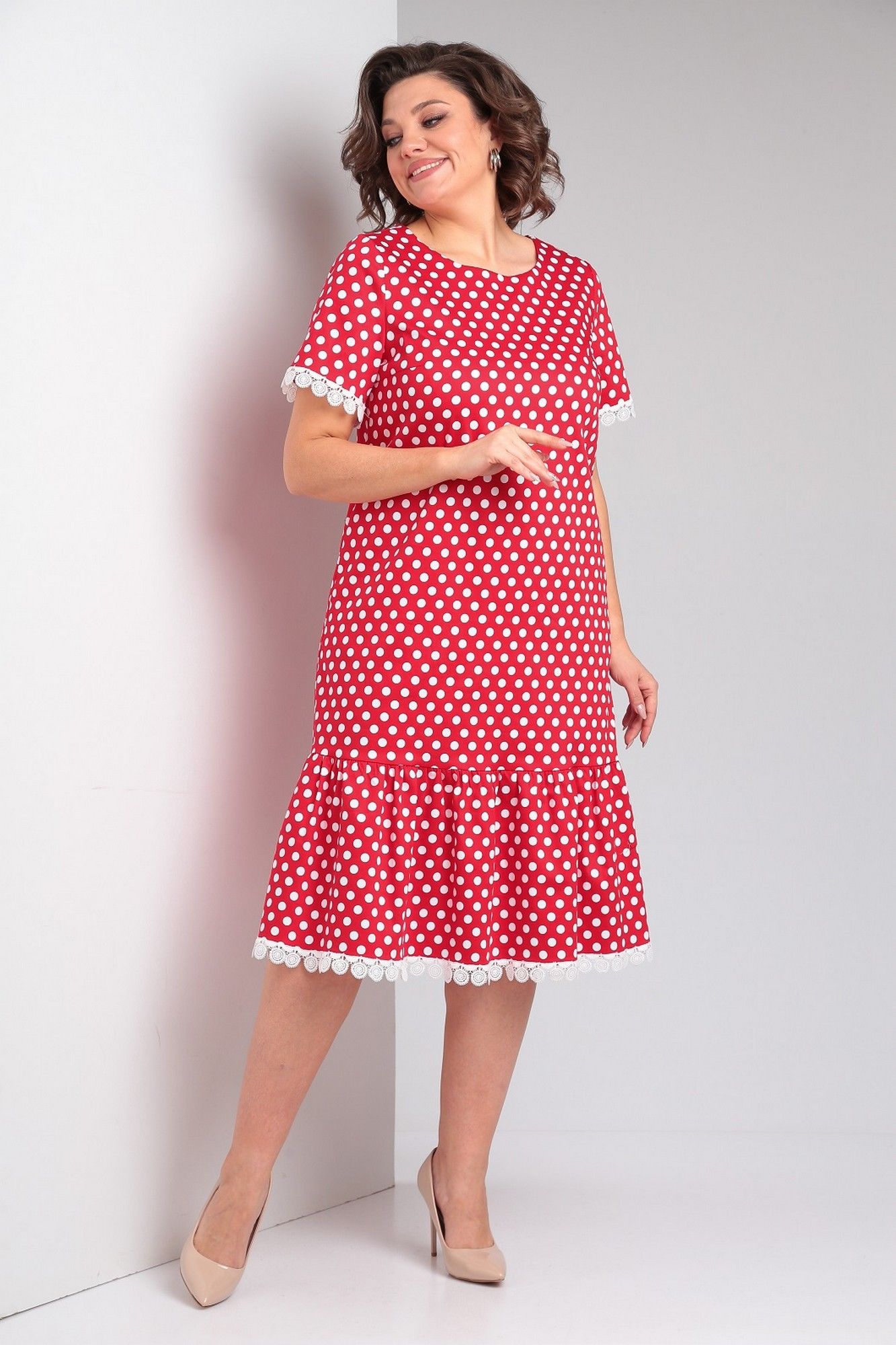 Платье из ткани с хлопком свободного силуэта с оборкой, с нагрудными вытачками, круглым вырезом горловины по переду и V -образным вырезом с завязкой по спинке. Рукав втачной одношовный короткий. Низ рукава и оборки обработан кружевом. Длина по спинке от плеча 113. Длина рукава 24.