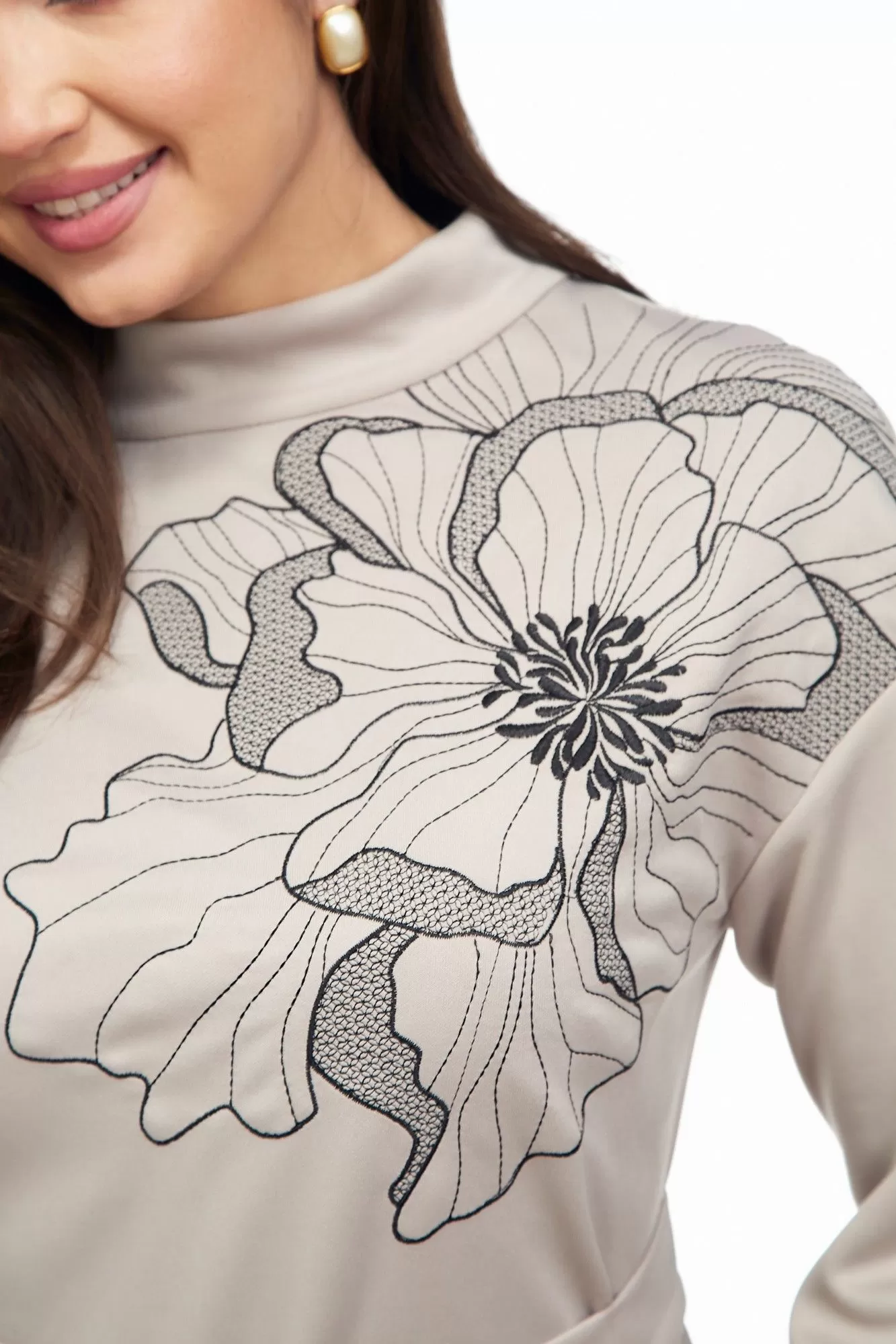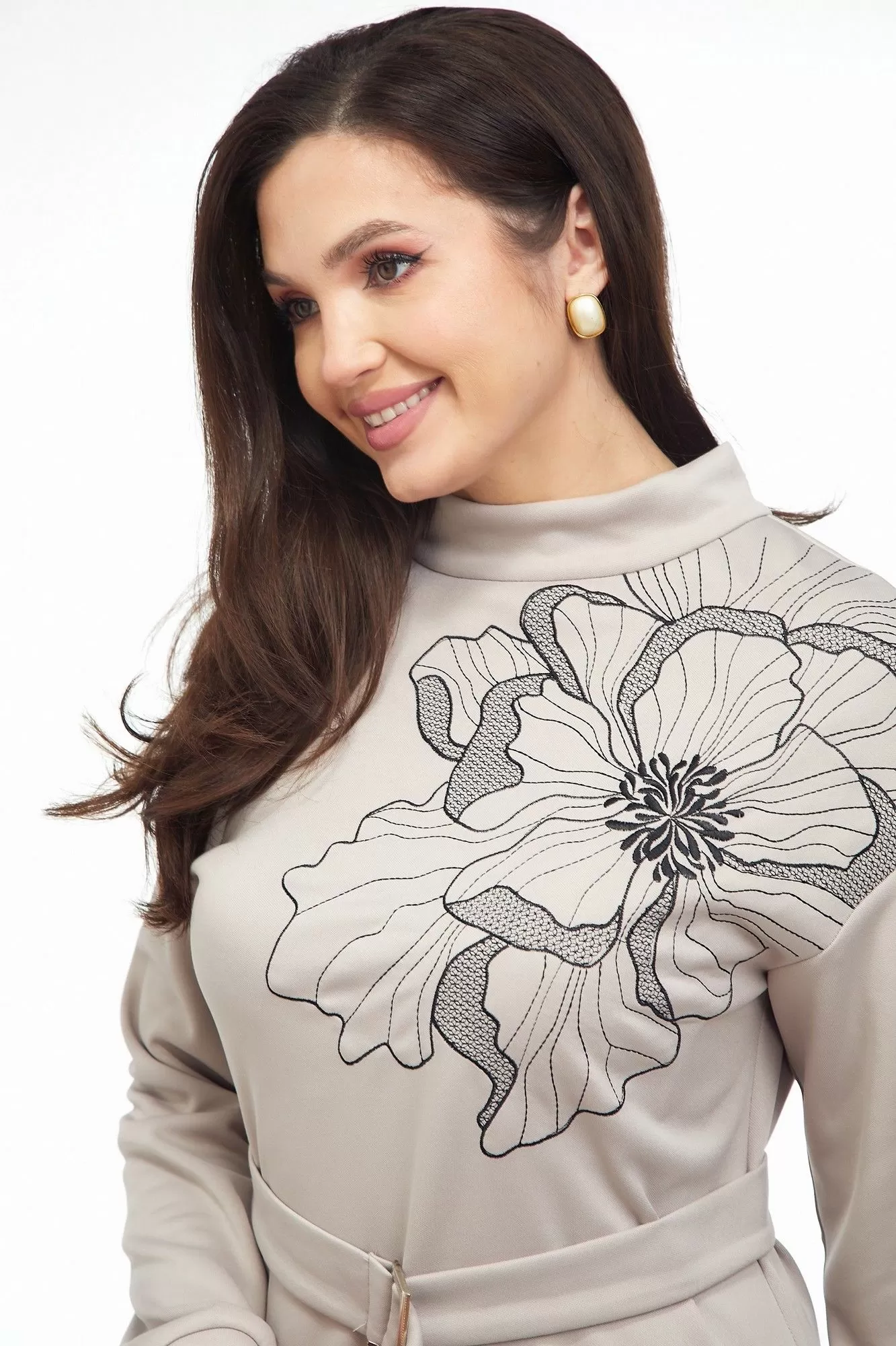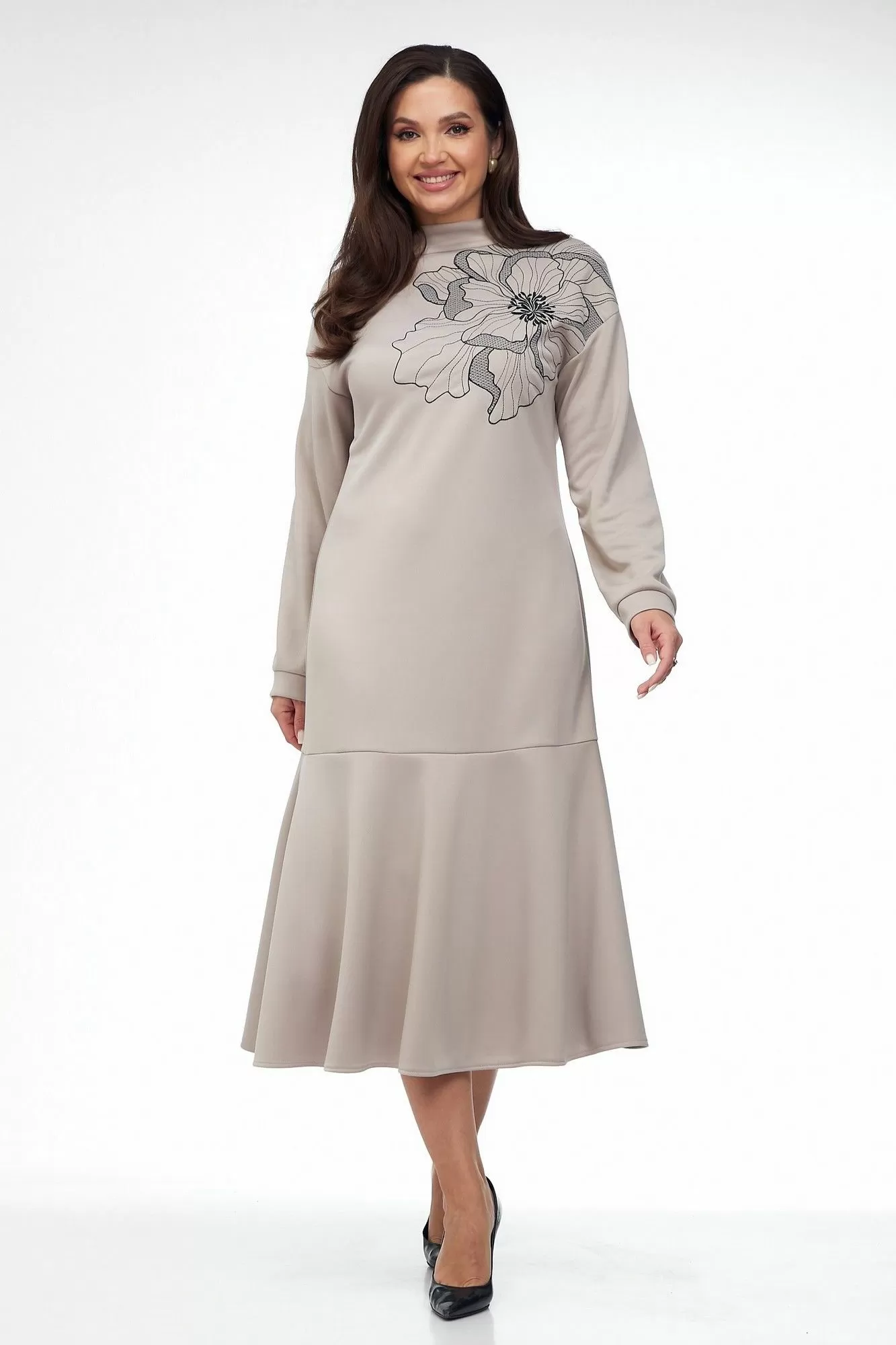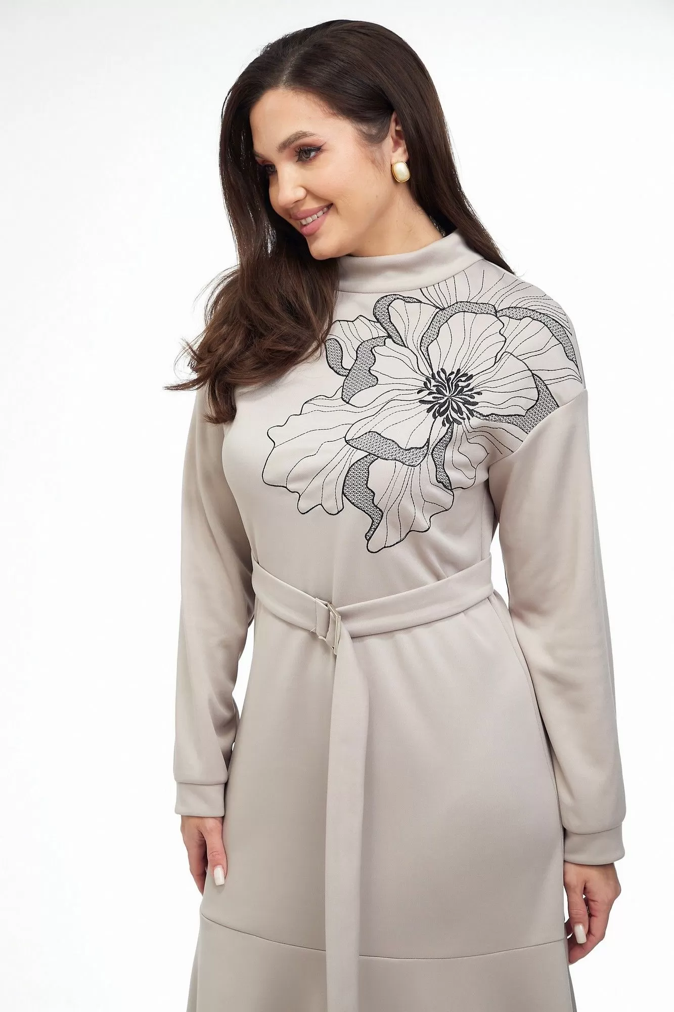 Платье из трикотажного полотна прямого силуэта со спущенной линией плеча, воланом по низу. Спинка со средним швом и застежкой на «молнию» в верхней части и по стойке. Рукав втачной одношовный на притачной манжете. Вырез горловины круглый. Воротник стойка. В верхней части переда слева расположена вышивка «цветок». Есть съемный пояс из основной ткани с пряжкой.