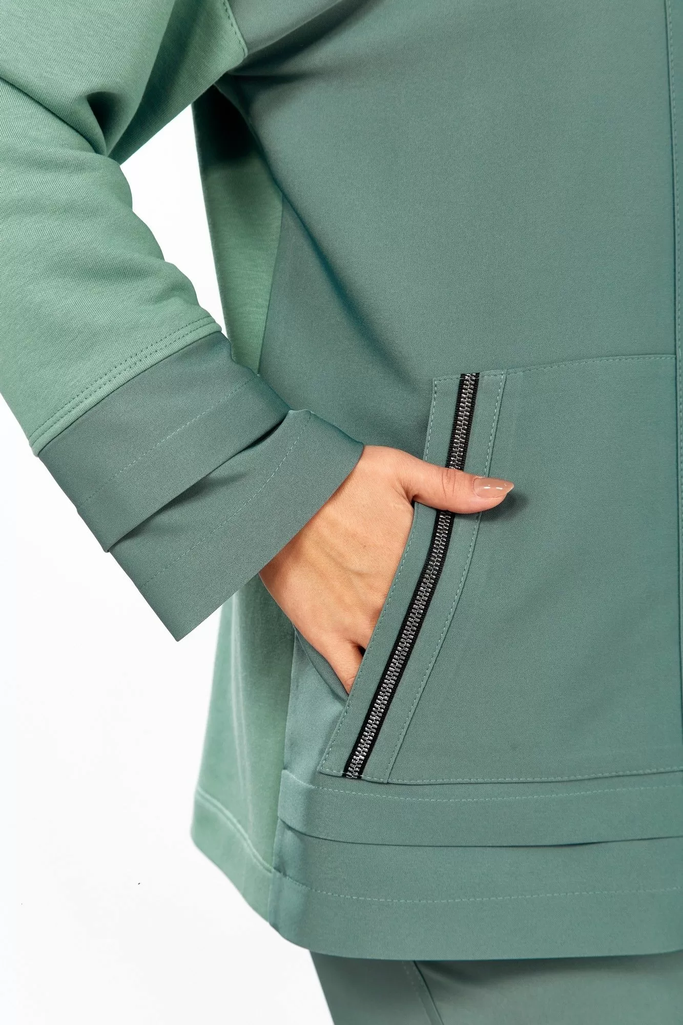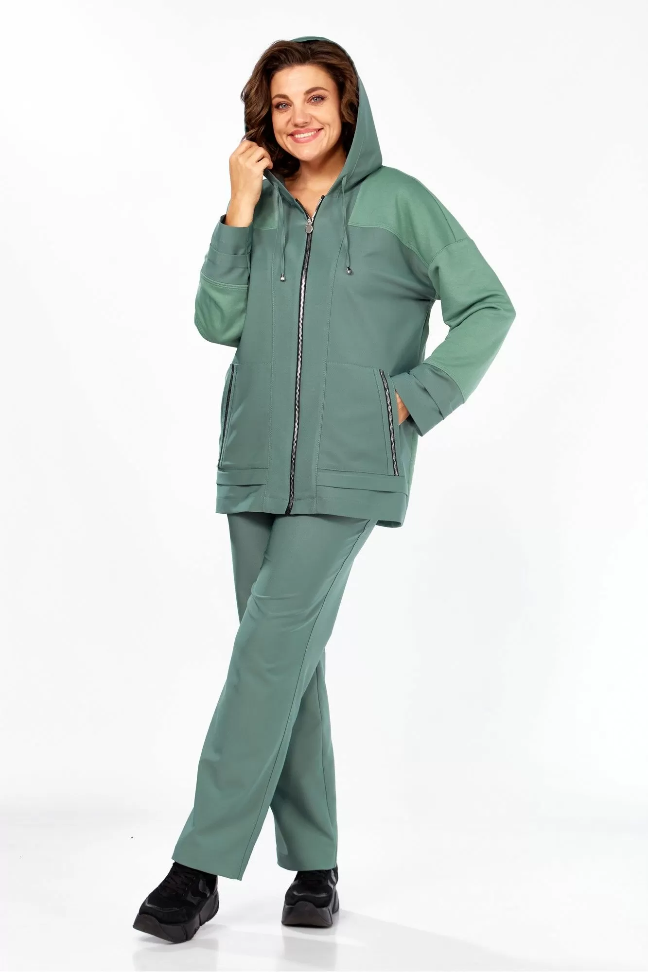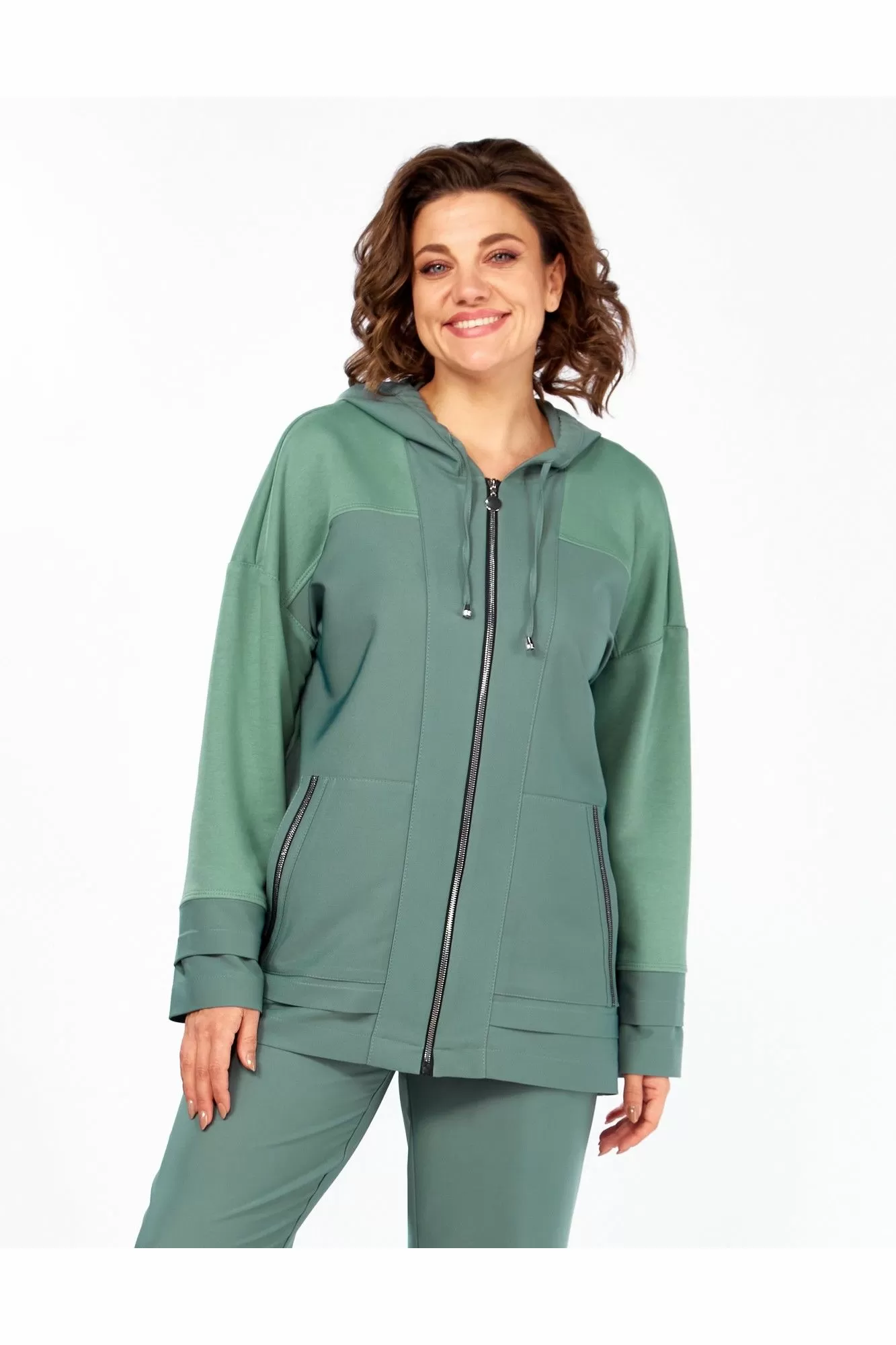 Комфортный комплект-двойка для повседневных дел и отдыха. Модель свободного кроя, комбинированная из двух видов ткани(текстиль «Монако» и хлопковый трикотаж трёхнитка). Натуральная фактура материалов делает образ не только стильным, но и удобным. Жакет-худи с центральной застёжкой на молнию, имеет спущенную линию плеча. На переде обработаны кокетки, планки, накладные карманы с отделочной тесьмой, по низу застрочены декоративные складки. Спинка с кокеткой и средним швом. Рукав спущенный, длинный, на манжете заложена декоративная складка. Горловина обработана притачным капюшоном с кулисой.