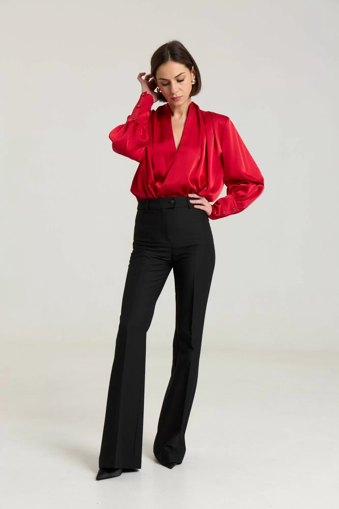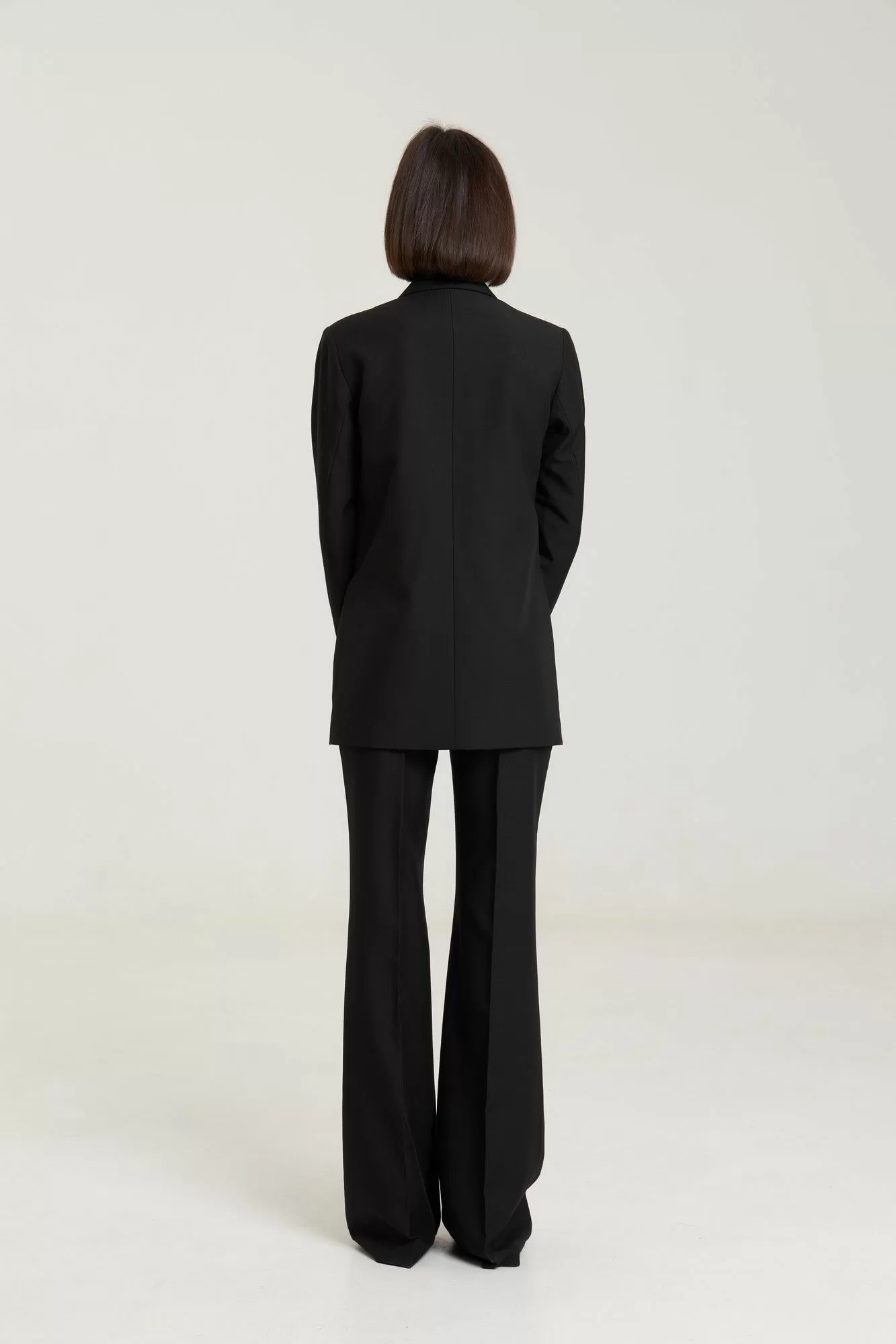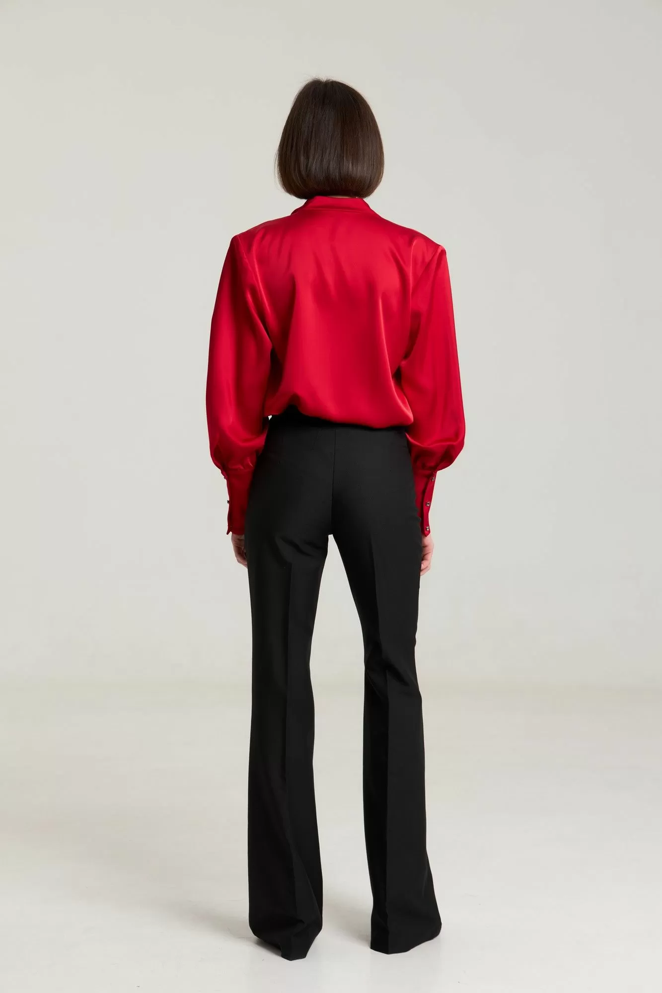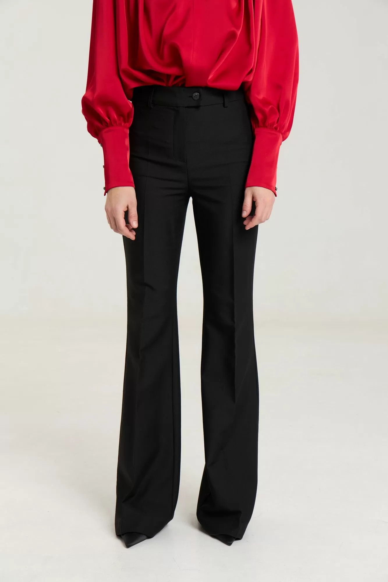 Классические расклешенные брюки полупрелегающегоьсилуэта с высокрй посадкой, пояс притачной со шлевками, застежка на молнию и петлю-пуговицу, брюки без карманов. Выполнены из премиальной ткани костюмной группы. Длина по боковому шву 111 см, полуобхват талии 35 см, полуобхват бедер 45 см , высота посадки 30 см в 42-м размере.