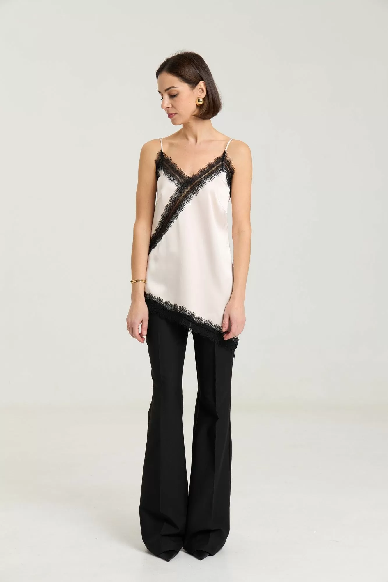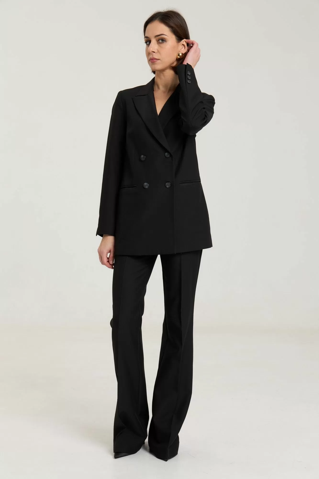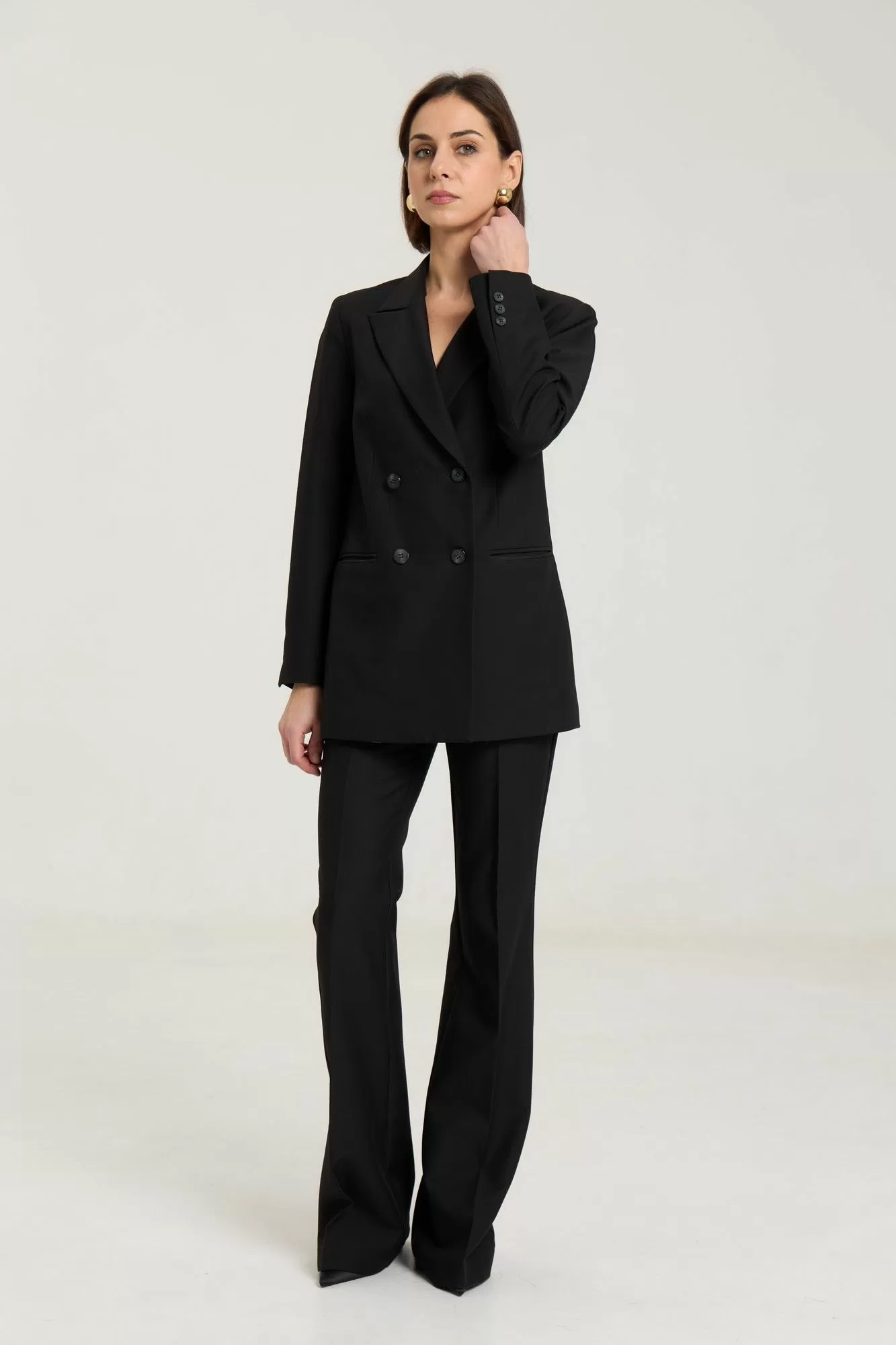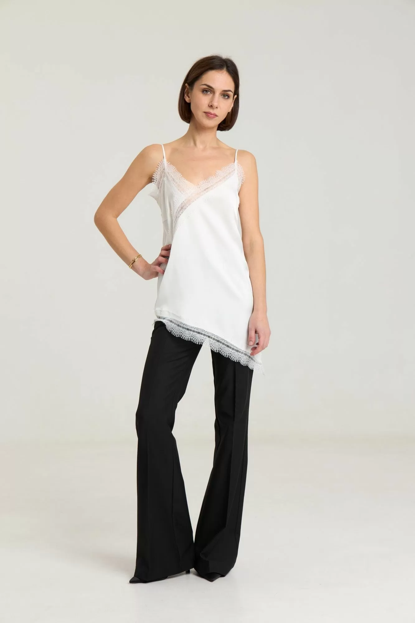Классические расклешенные брюки полупрелегающегоьсилуэта с высокрй посадкой, пояс притачной со шлевками, застежка на молнию и петлю-пуговицу, брюки без карманов. Выполнены из премиальной ткани костюмной группы. Длина по боковому шву 111 см, полуобхват талии 35 см, полуобхват бедер 45 см , высота посадки 30 см в 42-м размере.