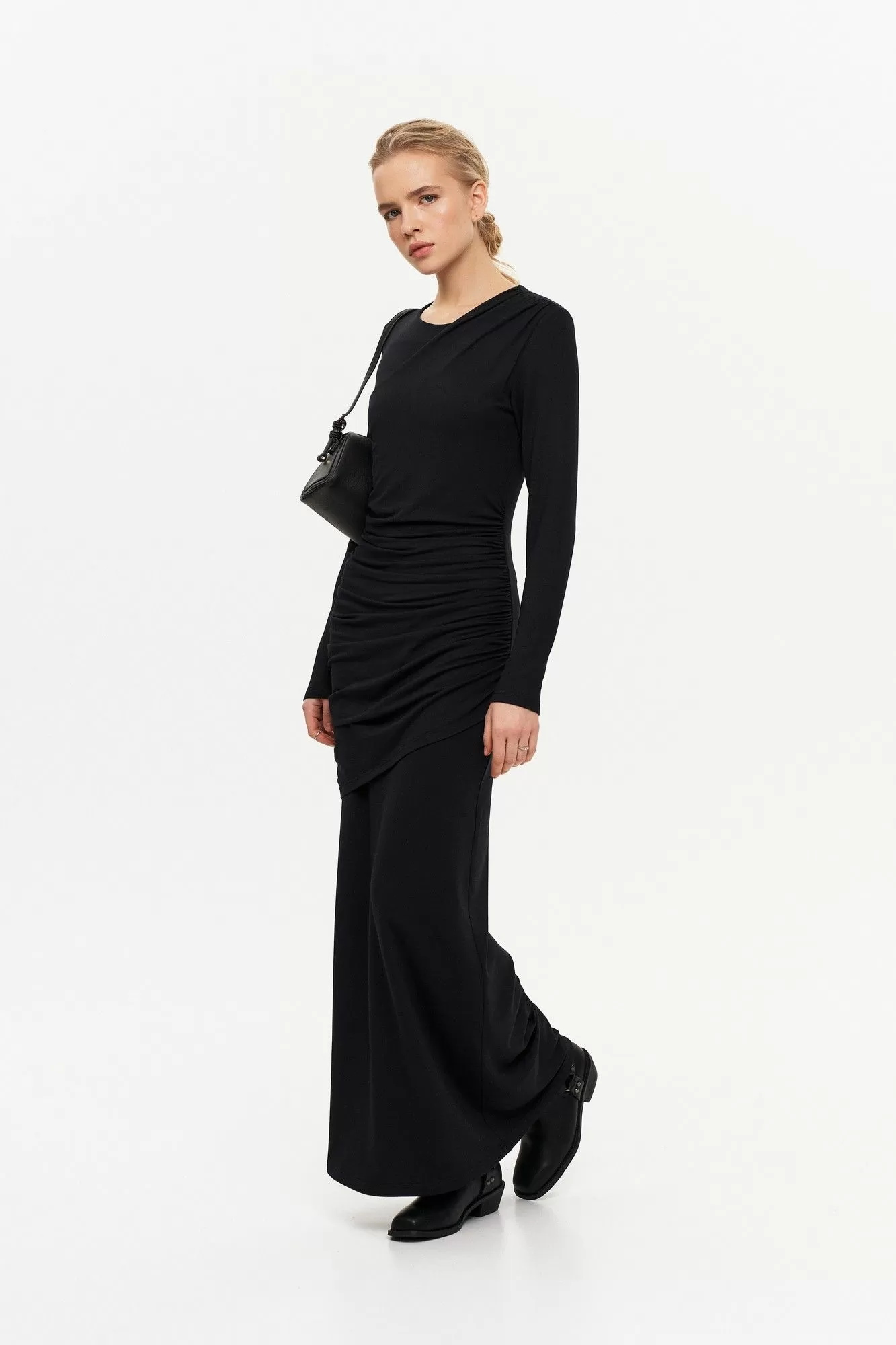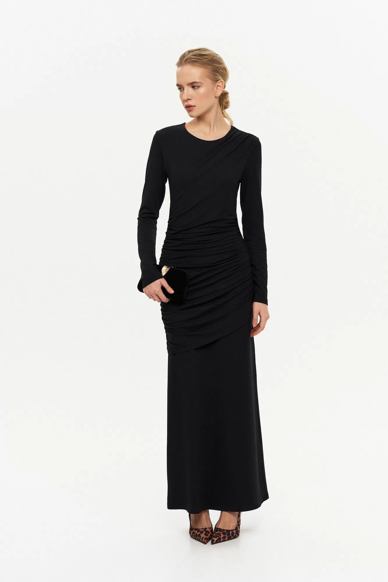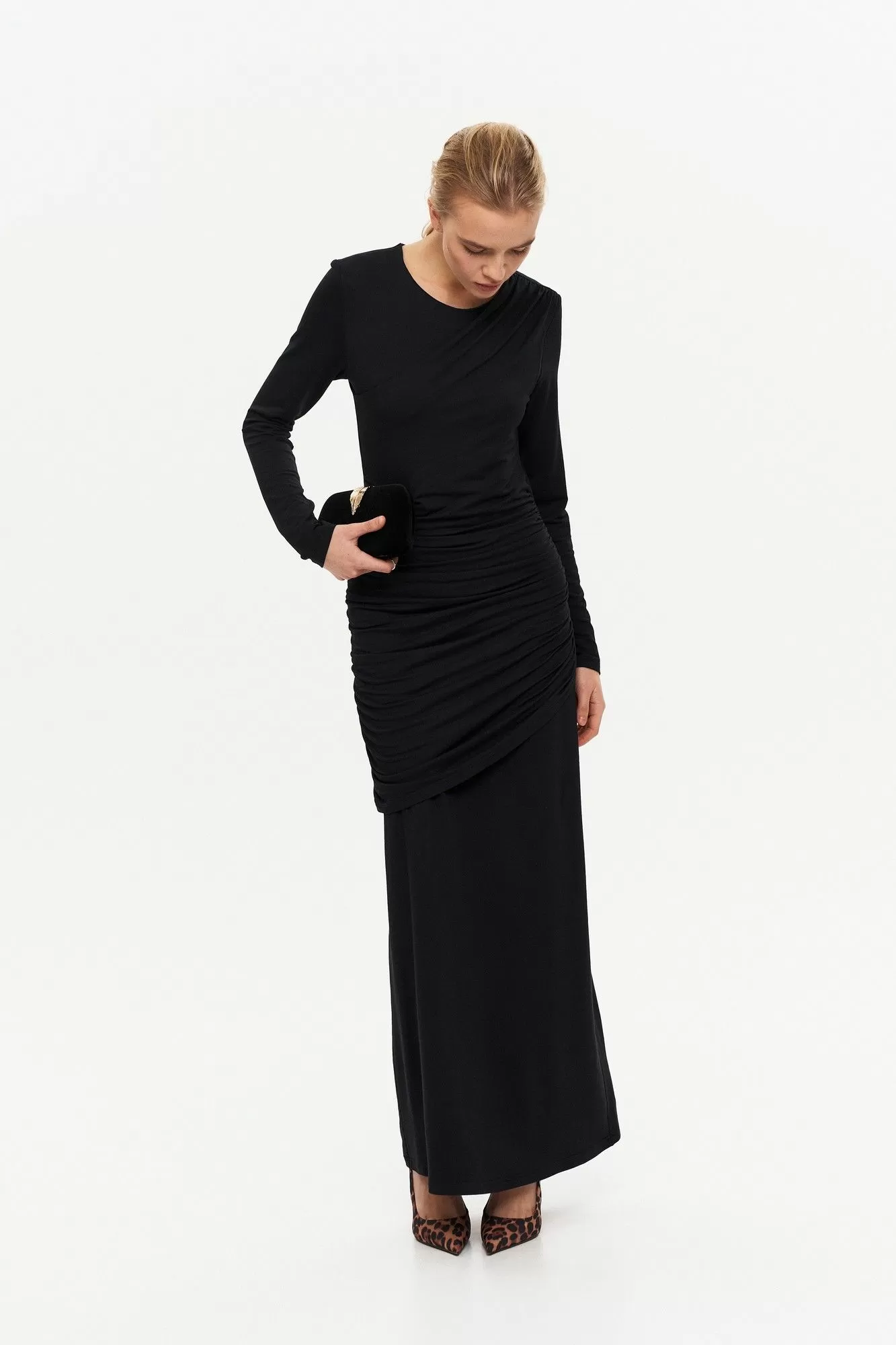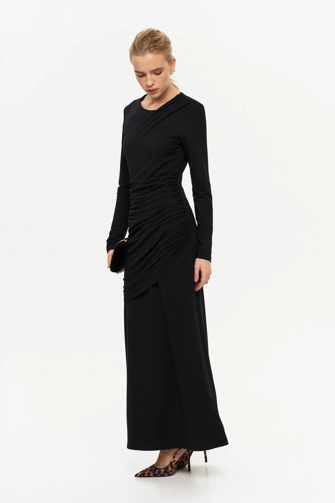 Платье из трикотажного полотна, прилегающего силуэта с расклешением к низу . Рукава втачные, длинные. Горловина круглой формы. Спинка цельная. По переду вшита дополнительная асимметричная деталь со сборкой по бедрам и левому плечу.
