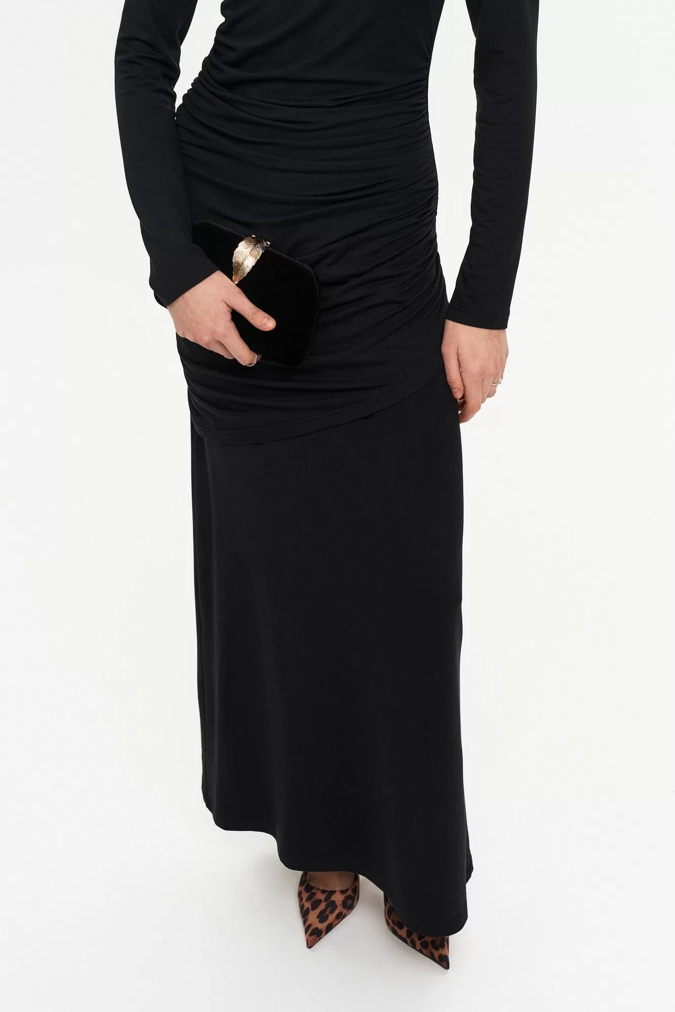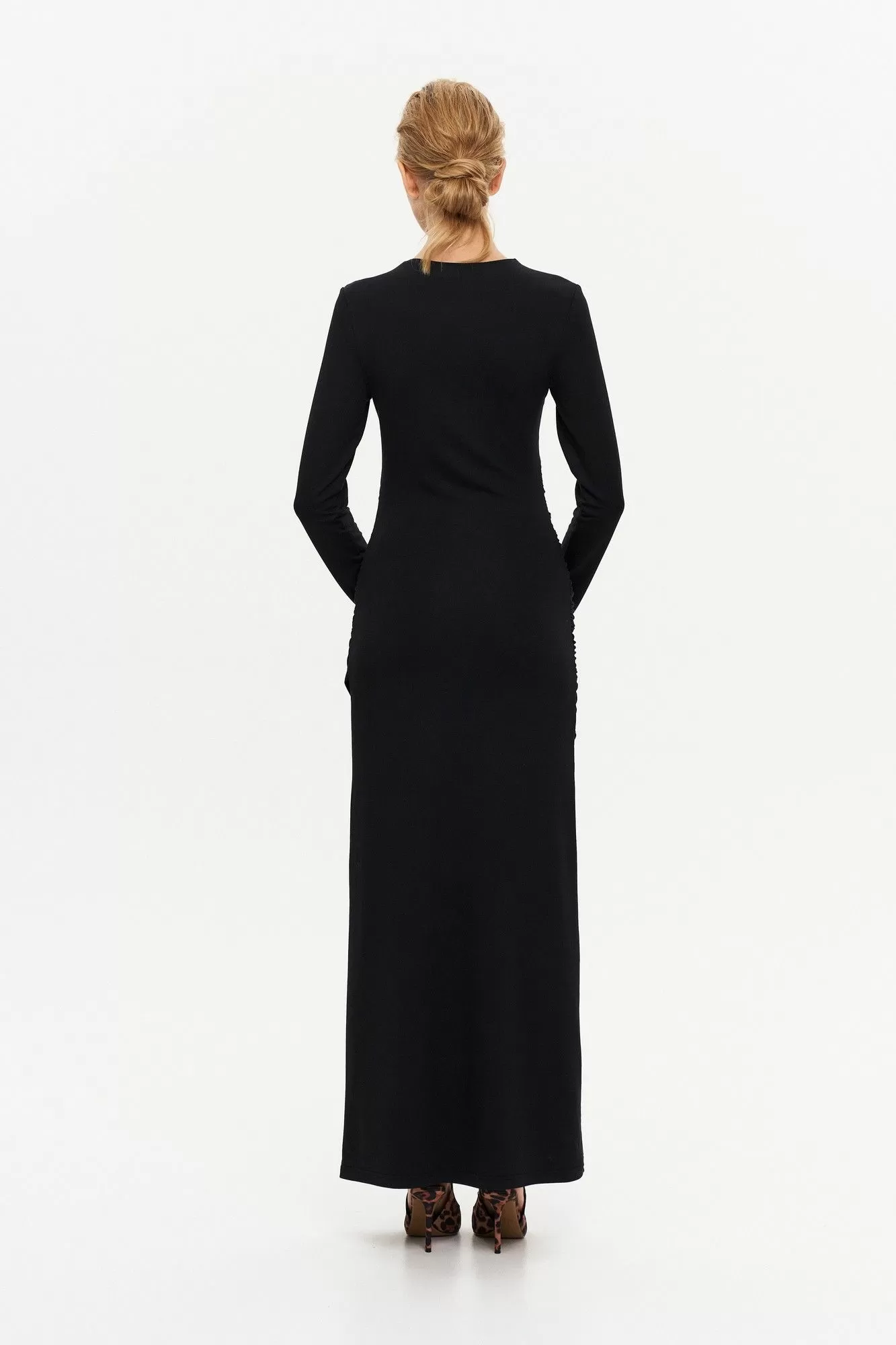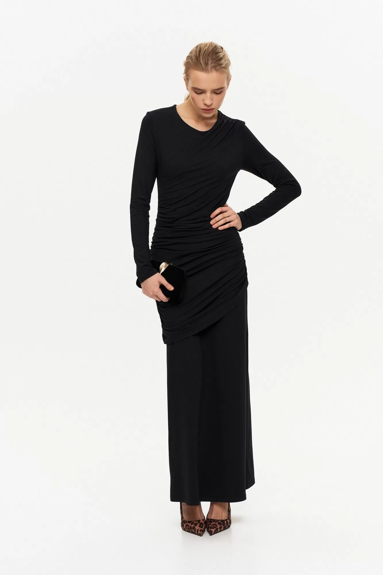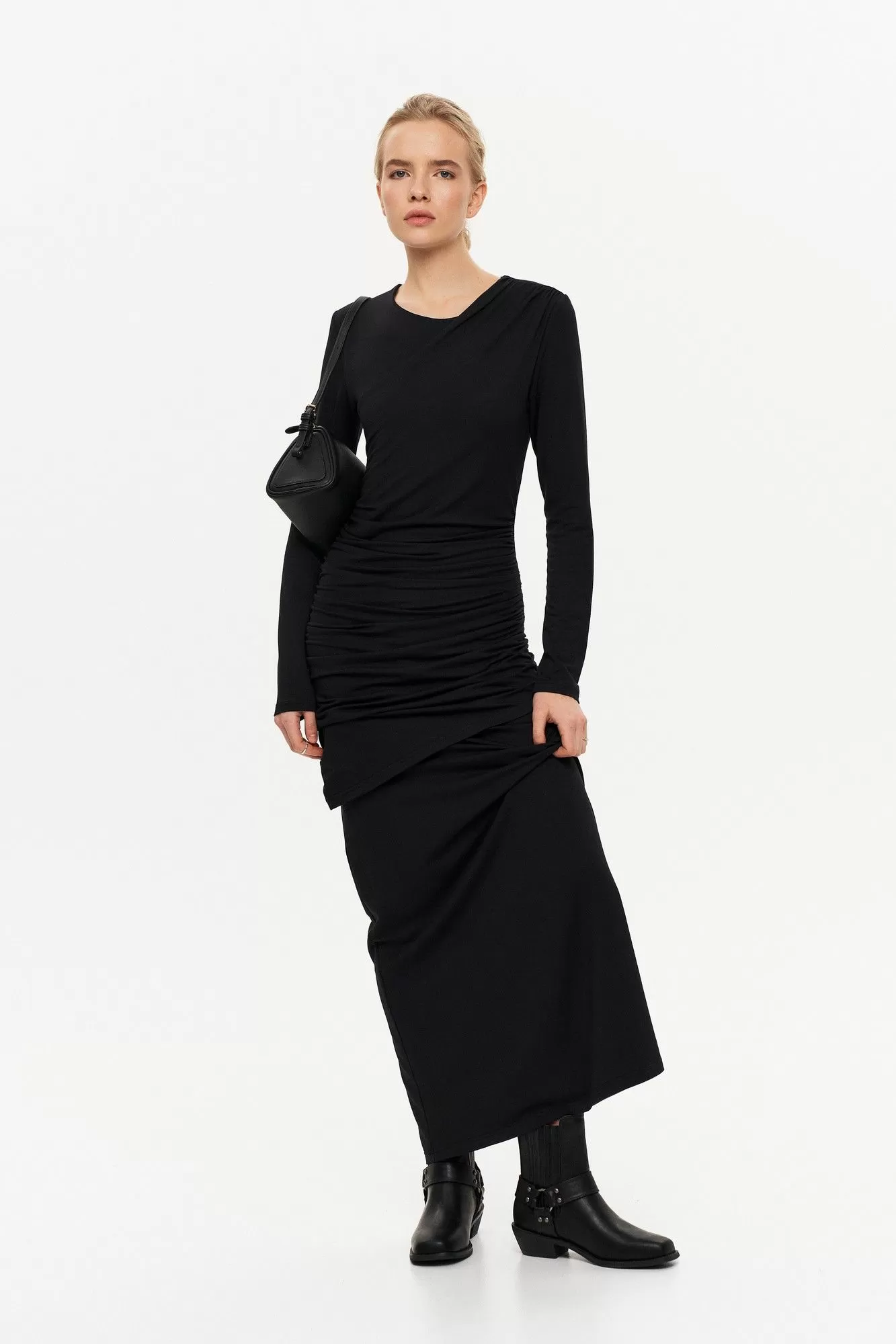 Платье из трикотажного полотна, прилегающего силуэта с расклешением к низу . Рукава втачные, длинные. Горловина круглой формы. Спинка цельная. По переду вшита дополнительная асимметричная деталь со сборкой по бедрам и левому плечу.