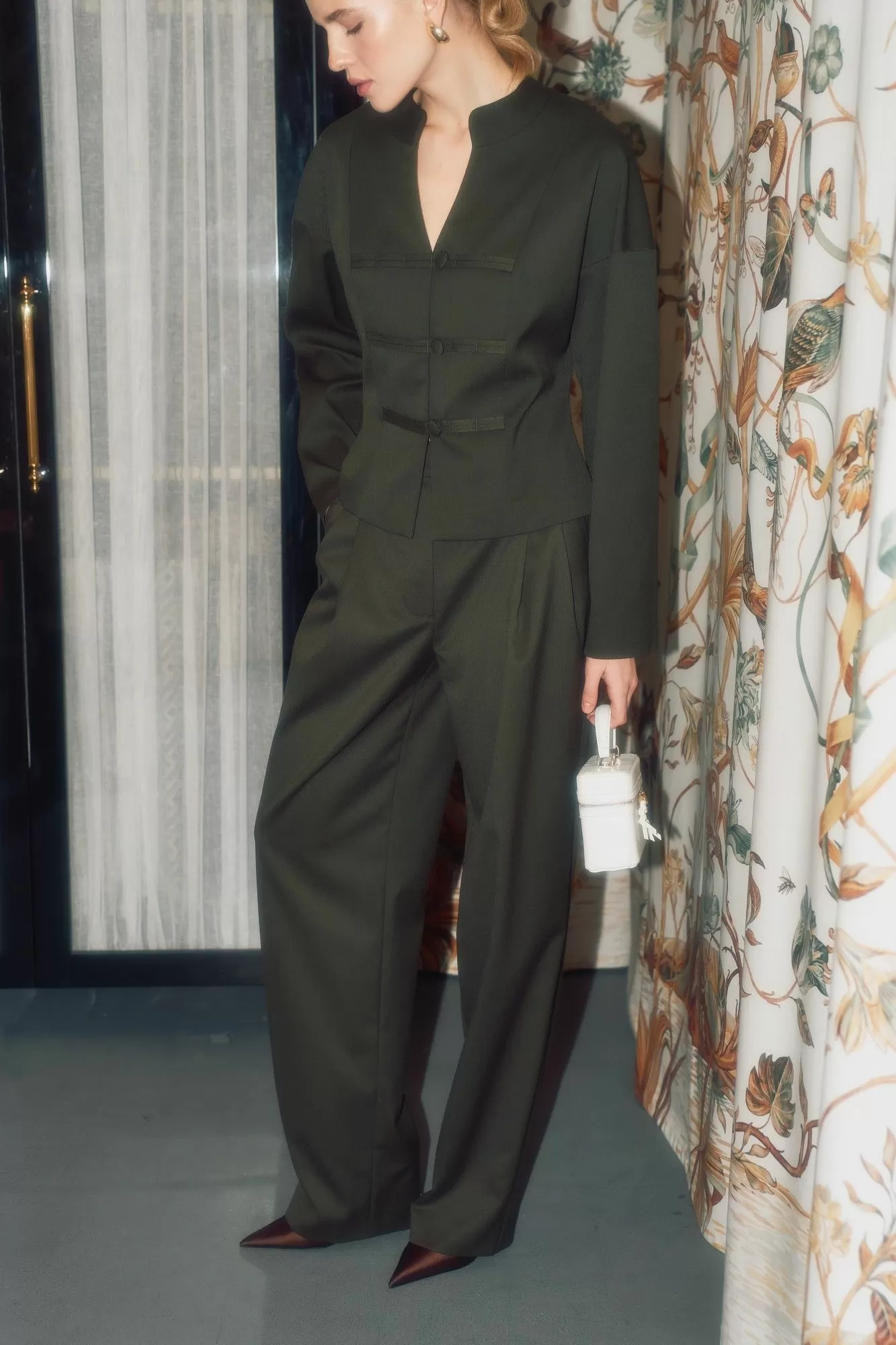 Брюки прямого кроя с двумя складками, направленными от середины изделия к боковым швам. Изнанка пояса выполнена из корсажной ленты, что визуально удорожает обработку изделия, а также делает пояс более стабильным. Пояс имеет выступ, который фиксируется на брючный крючок. Внутренняя часть пояса зафиксирована пуговицей. Пояс со шлевками. На передних частях брюк выполнены боковые карманы наклонные к боковому шву. На задних частях выполнены вытачки.