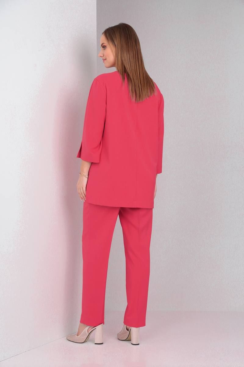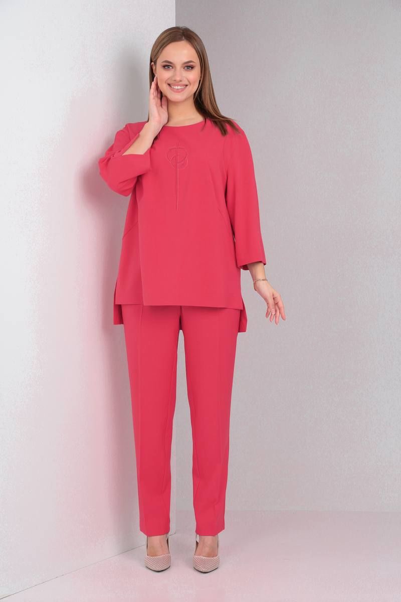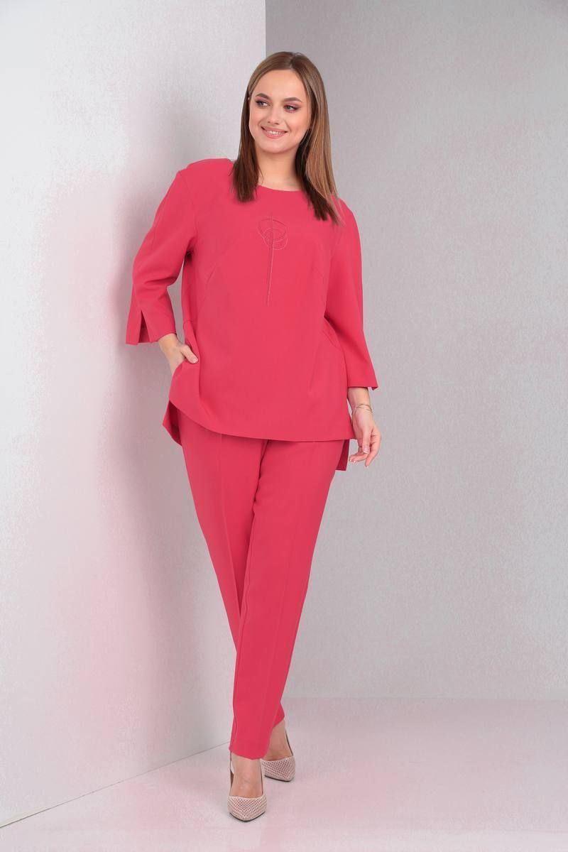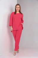 Комплект женский выполнен из плательно-костюмной однотонной ткани, состоит из брюк и блузона. Брюки слегка зауженные к низу на притачном поясе с резинкой. В боковых швах имеются функциональные карманы. Блузон свободного покроя, по спинке средний шов с застёжкой сверху на потайную молнию. По переду вышивка. В боковых швах блузона разрезы, спинка длиннее переда на 8 см. Горловина округлой формы. Рукав двухшовный 3/4 по низу разрез. Блузон: Длина спинки 74 см Длина рукава 45 см Брюки: Длина сбоку 103,5 см