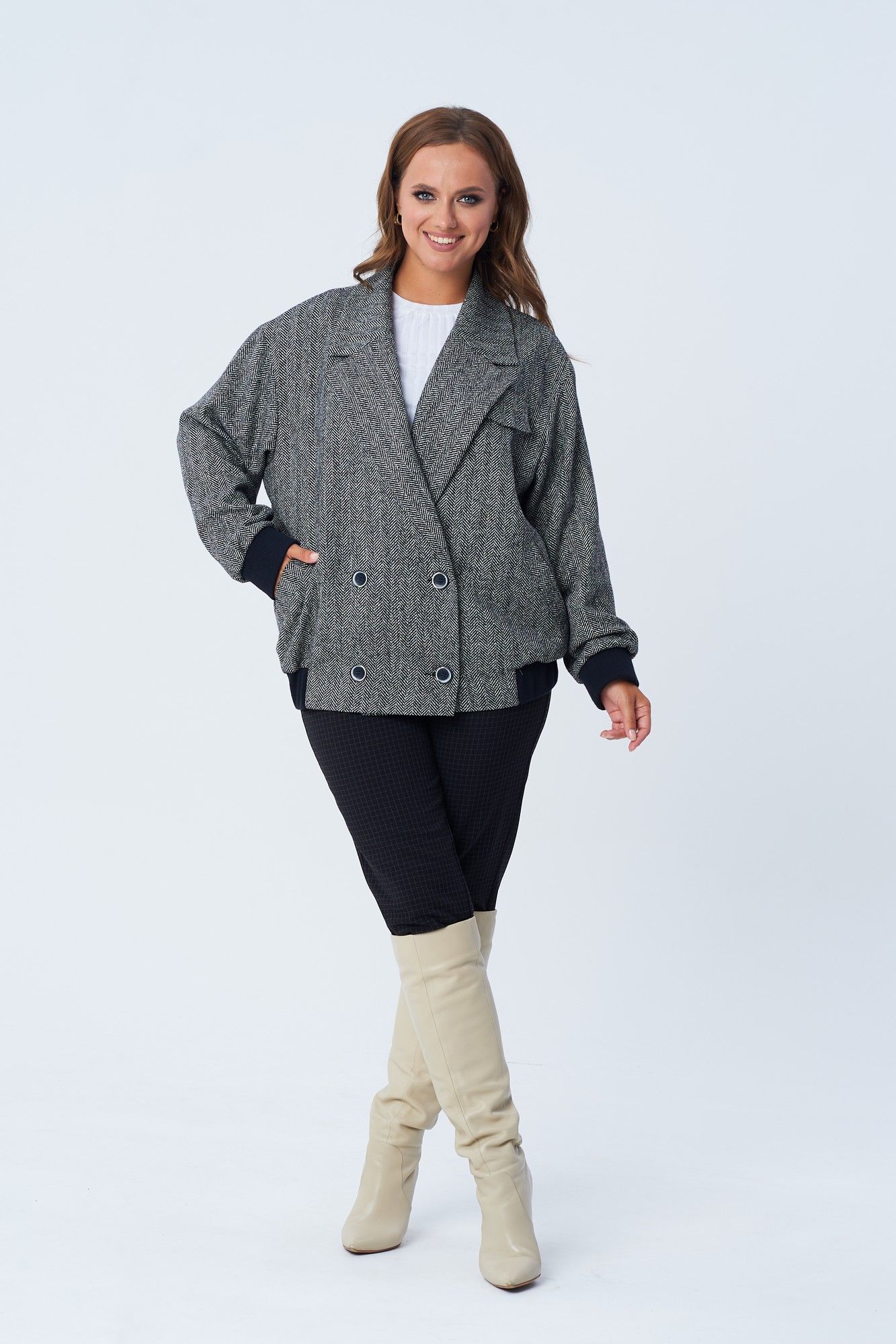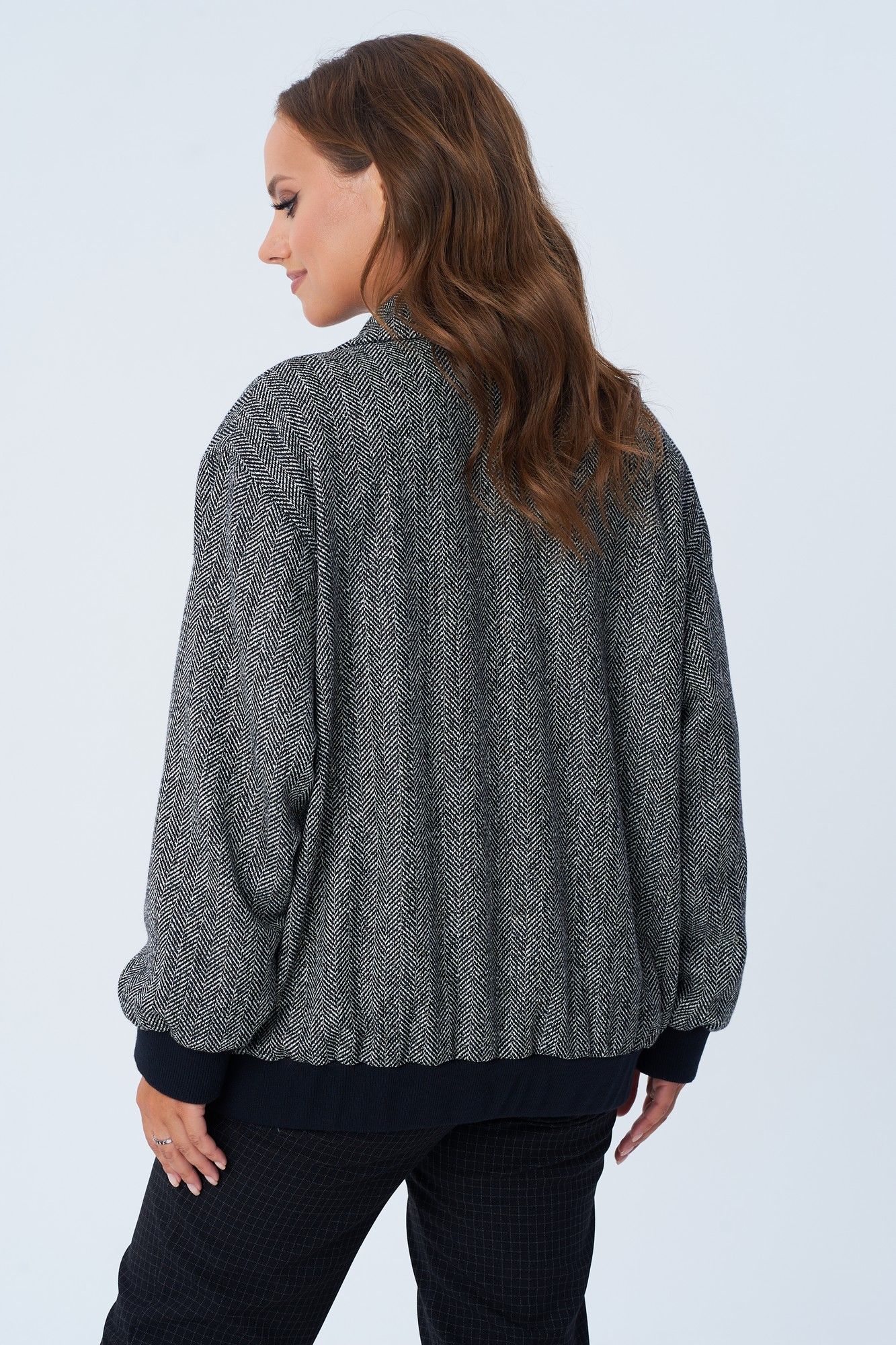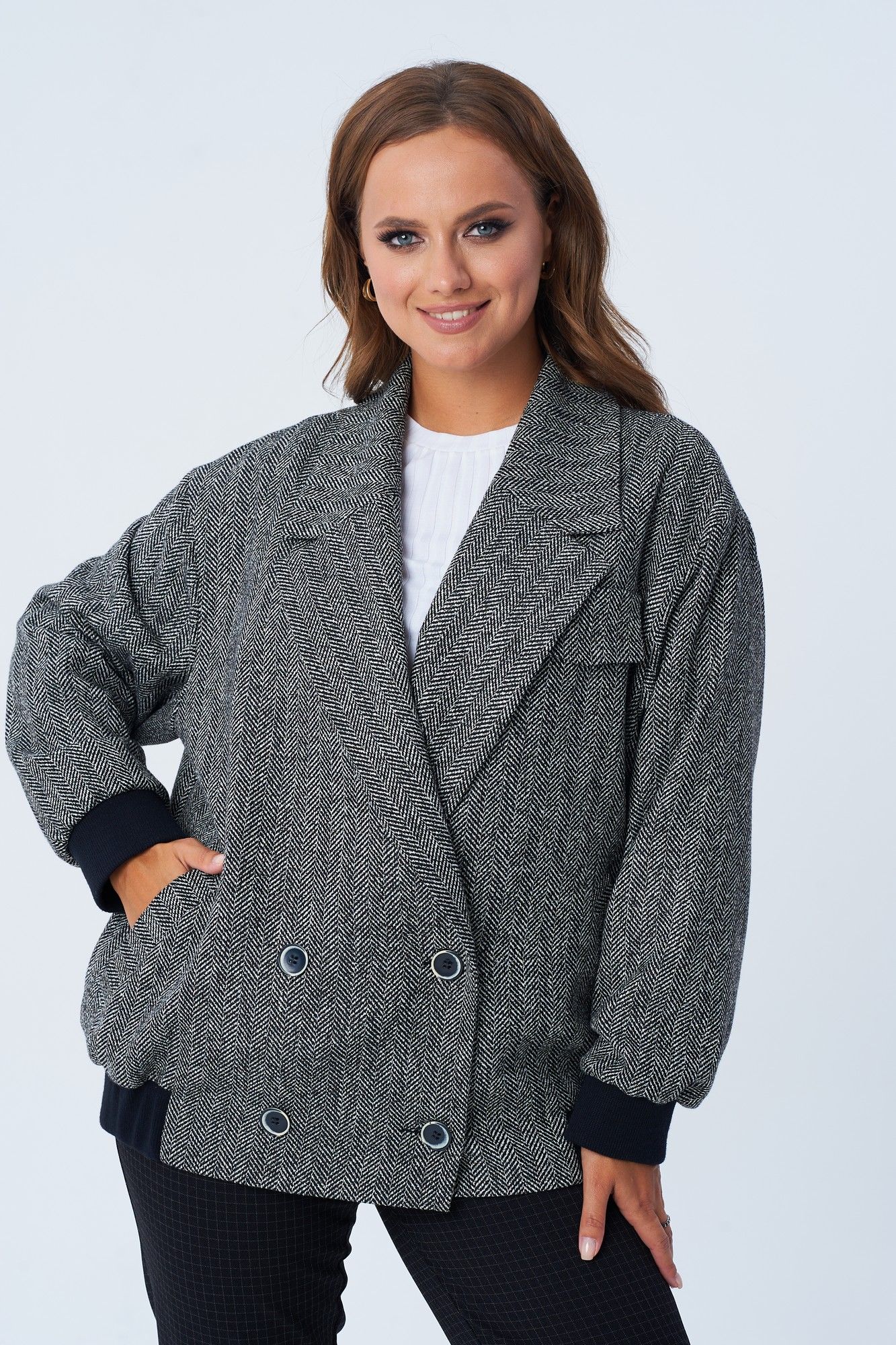 Жакет женский свободного покроя в виде куртки-бомбера из костюмно-плательной ткани с твидовым плетением "елочка". Жакет на подкладке. По переду двубортная застежка на петли и пуговицы, карманы с листочкой, декоративный клапан. Спинка цельная. Воротник пиджачного типа с лацканом. Рукав втачной на спущенной пройме. По низу изделия и рукава элементы из отделочной ткани. Длина по спинке 67 см. Ширина изделия на уровне глубины проймы в 46р 64 см, в 48р 65 см, в 50р 66 см, в 52р 67 см, в 54р 68 см. длина рукава 54 см. Ширина изделия по линии талии в 46р 64 см, в 48р 65 см, в 50р 66 см, в 52р 67 см, в 54р 68 см. Ширина изделия на уровне линии бедер в 46р 98 см, в 48р 100 см, в 50р 102 см, в 52р 104 см, в 54р 106 см.
