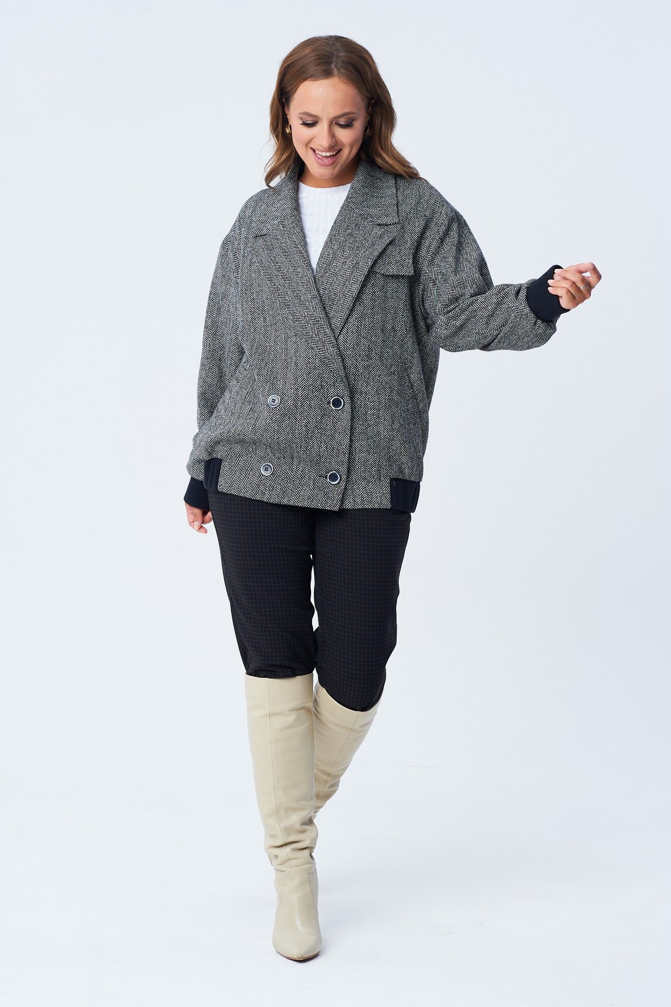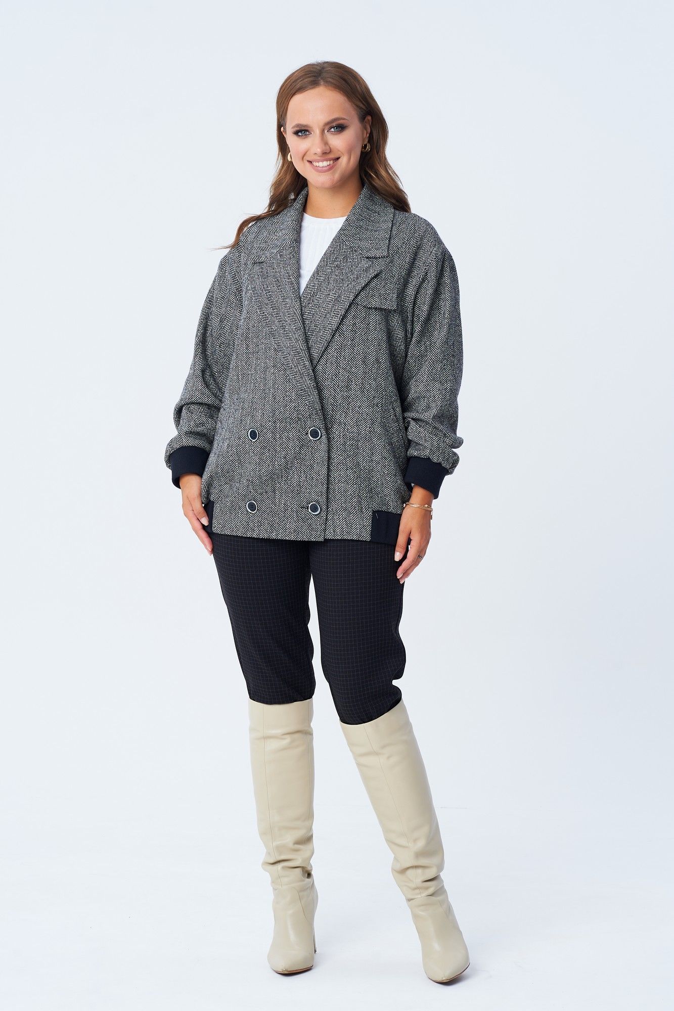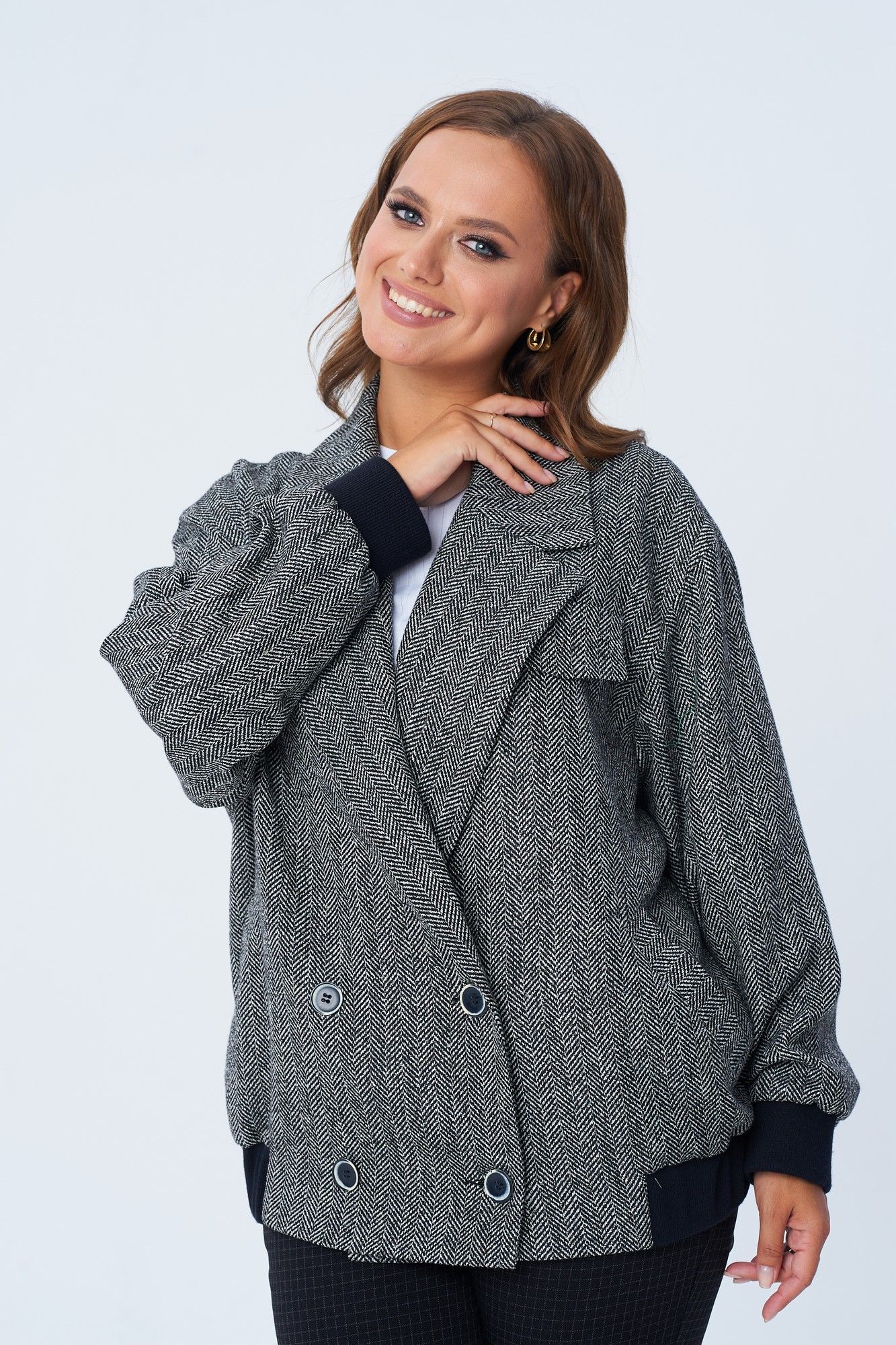 Жакет женский свободного покроя в виде куртки-бомбера из костюмно-плательной ткани с твидовым плетением "елочка". Жакет на подкладке. По переду двубортная застежка на петли и пуговицы, карманы с листочкой, декоративный клапан. Спинка цельная. Воротник пиджачного типа с лацканом. Рукав втачной на спущенной пройме. По низу изделия и рукава элементы из отделочной ткани. Длина по спинке 67 см. Ширина изделия на уровне глубины проймы в 46р 64 см, в 48р 65 см, в 50р 66 см, в 52р 67 см, в 54р 68 см. длина рукава 54 см. Ширина изделия по линии талии в 46р 64 см, в 48р 65 см, в 50р 66 см, в 52р 67 см, в 54р 68 см. Ширина изделия на уровне линии бедер в 46р 98 см, в 48р 100 см, в 50р 102 см, в 52р 104 см, в 54р 106 см.