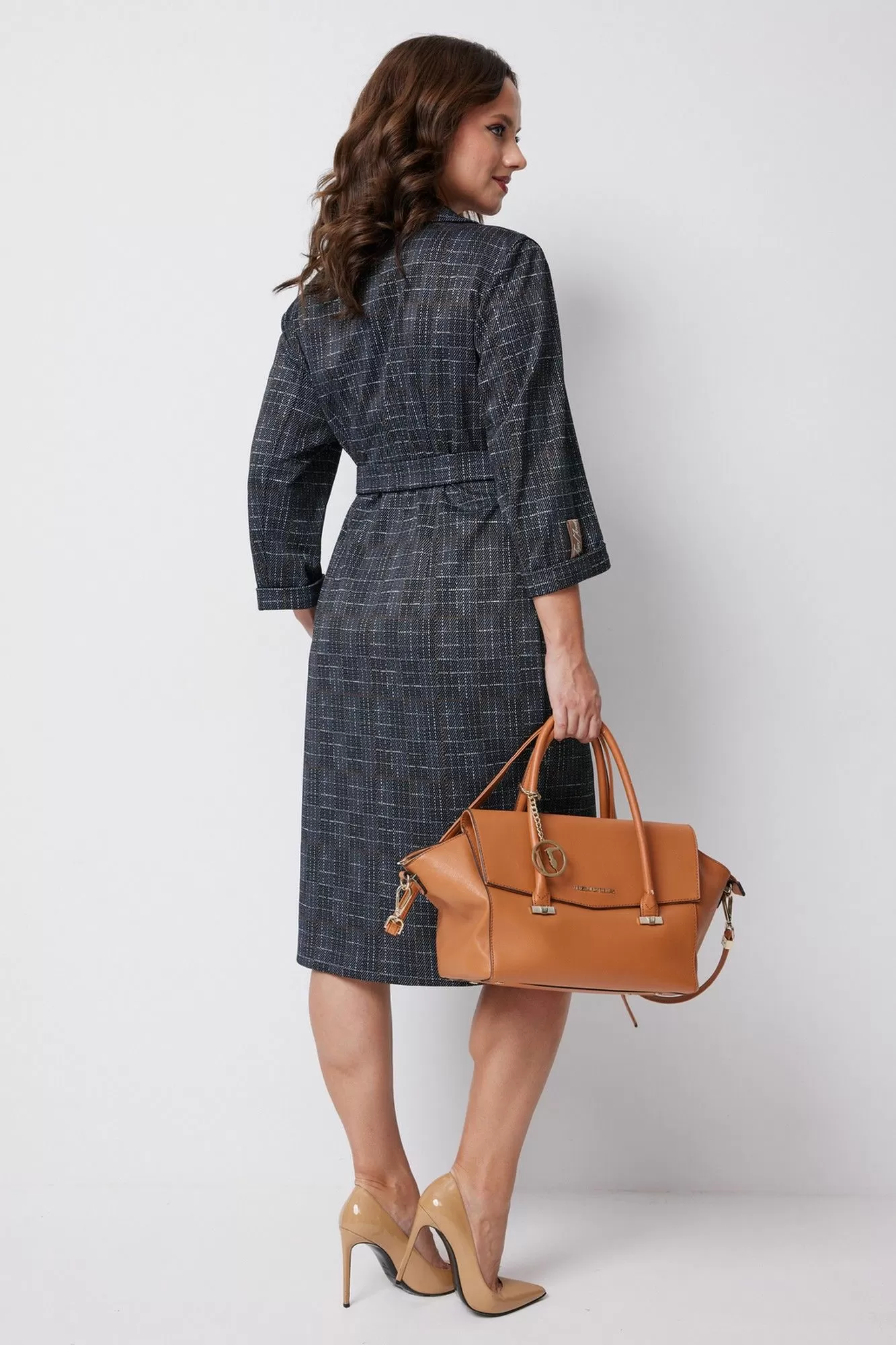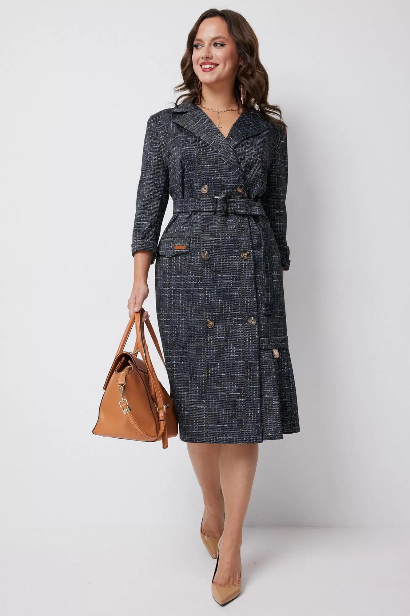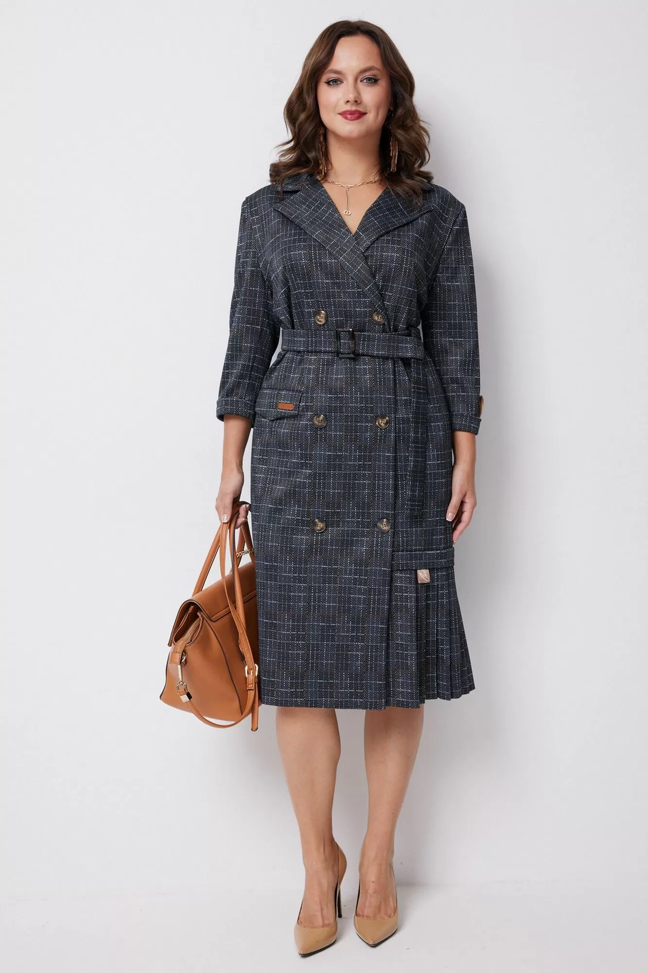 Платье женское полуприлегающего силуэта, выполненное из трикотажа. Платье с двухбортной застежкой на петли-пуговицы. Горловина оформлена воротником пиджачного типа. Рукава двушовные, длиной 3/4, по низу обработаны притачной манжетой. По спинке - средний шов и талиевые выточки. По переду расположены нагрудные выточки. В левой боковой части переда вставлена отделочная деталь со складками, направленными к центру, над которой горизонтально расположена пата. В комплект к платью входит пояс из основной ткани с декоративной пряжкой, в цвет фурнитуры.