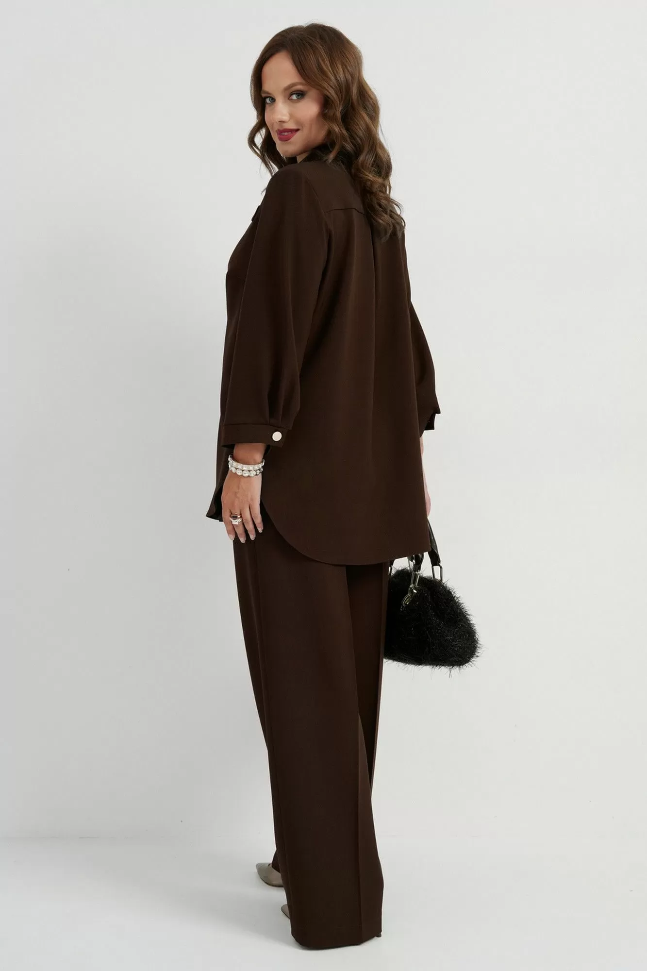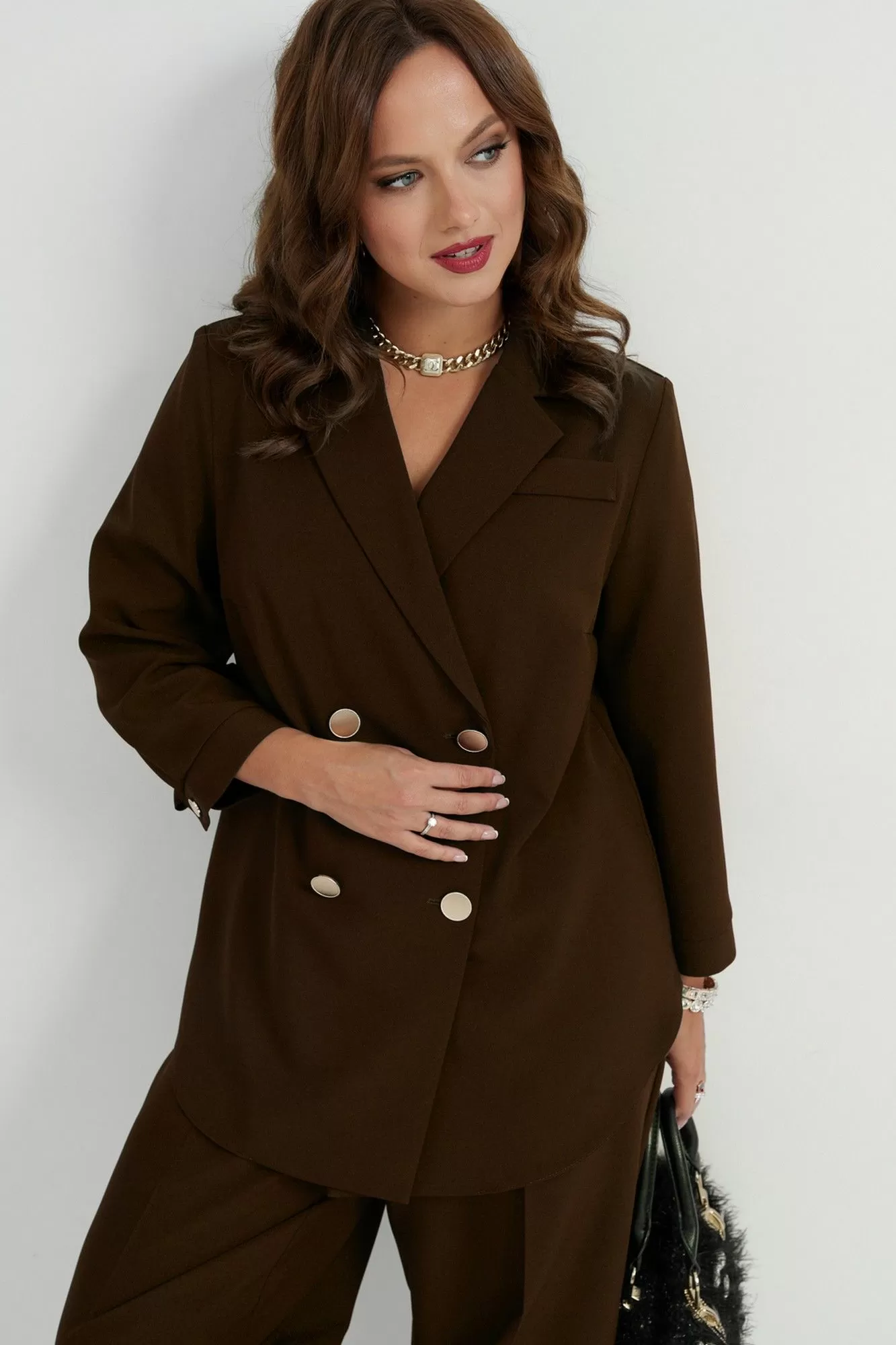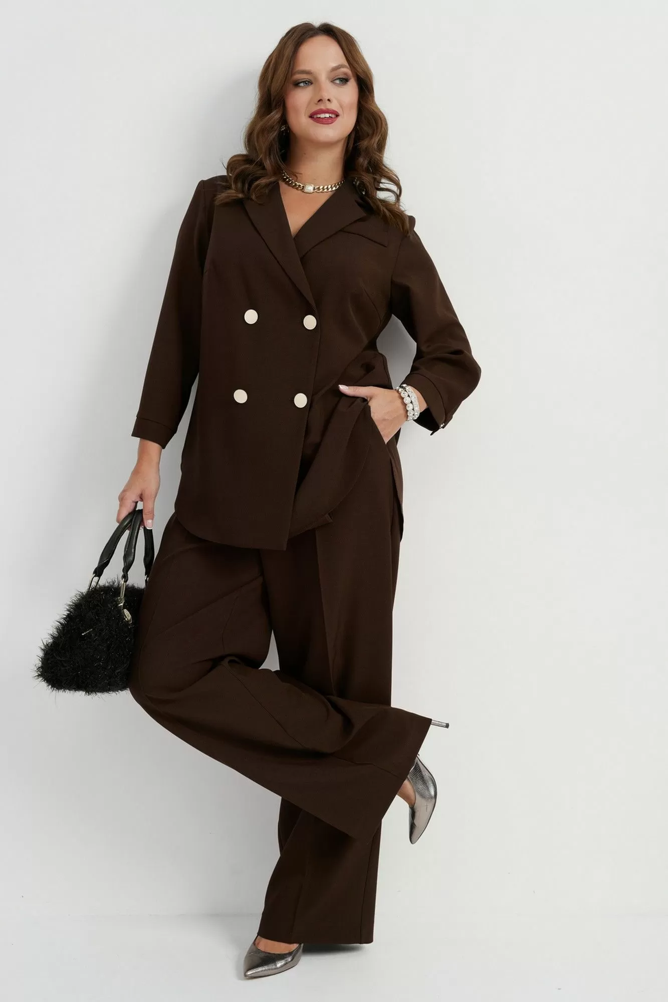 Костюм состоит из жакета и брюк. Качественная поливискоза, из которой выполнена модель, обеспечит долговечность изделию и приятные ощущения его обладательнице. Жакет без подкладки прямого силуэта, с двубортной застежкой на петли-пуговицы, длиной до середины бедра. Перед жакета с нагрудными вытачками, в области груди расположена декоративная листочка. Спинка с двойной кокеткой, в шве притачивания которой обработана встречная складка. Низ жакета фигурный, с закруглениями по боковым швам. Рукава двушовные, длиной 3/4, по низу с манжетой, застегивающейся на петлю и пуговицу. Горловина оформлена воротником пиджачного типа. Брюки классической формы, прямые от линии бедер, со стрелками по передним и задним половинкам. Верхний срез обработан поясом, в который от бокового шва вставлена резинка по задним половинкам. В боковых швах обработаны наклонные карманы. На задних половинках расположены талиевые вытачки. В комплект входит пояс из основной ткани.