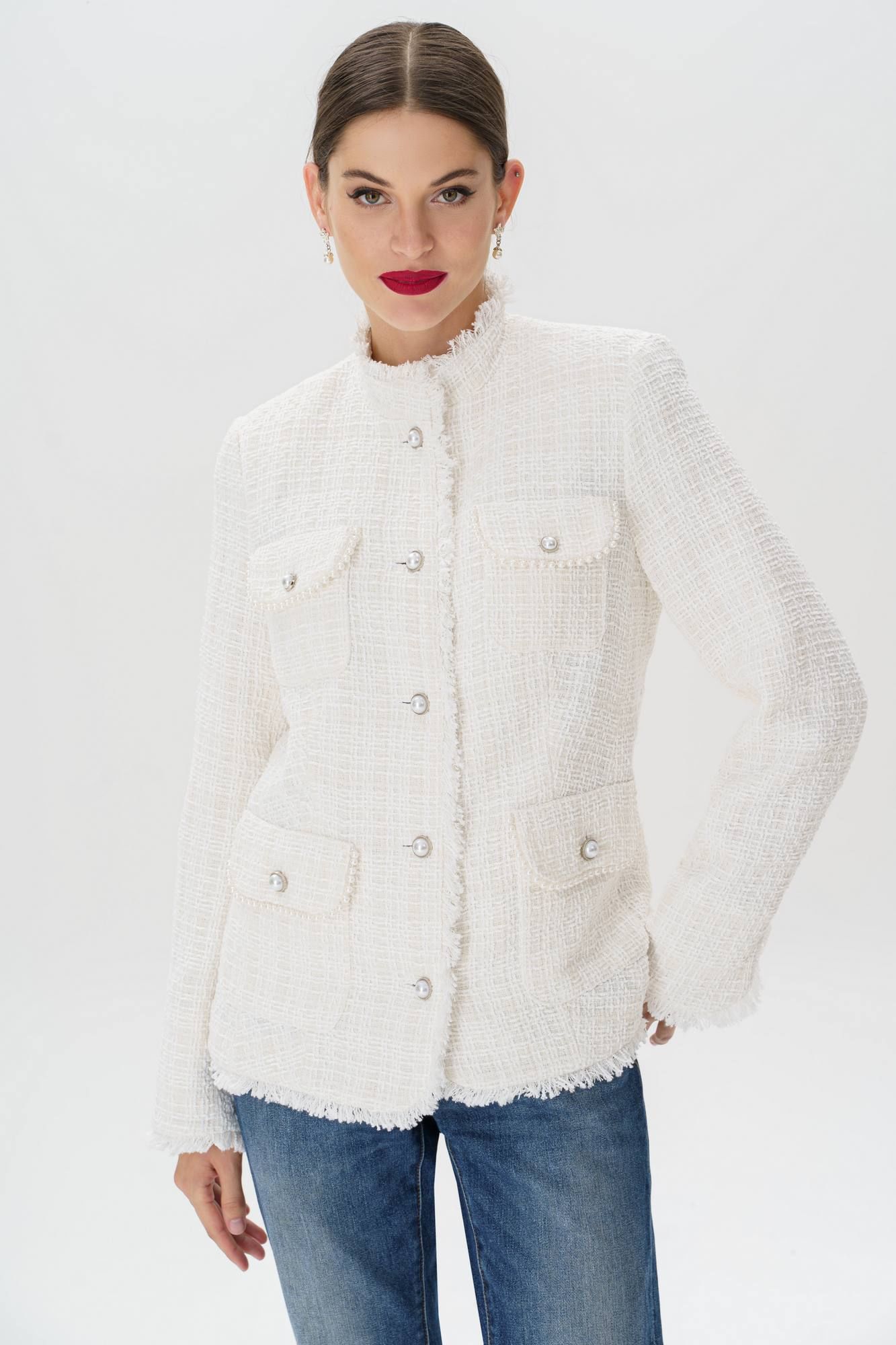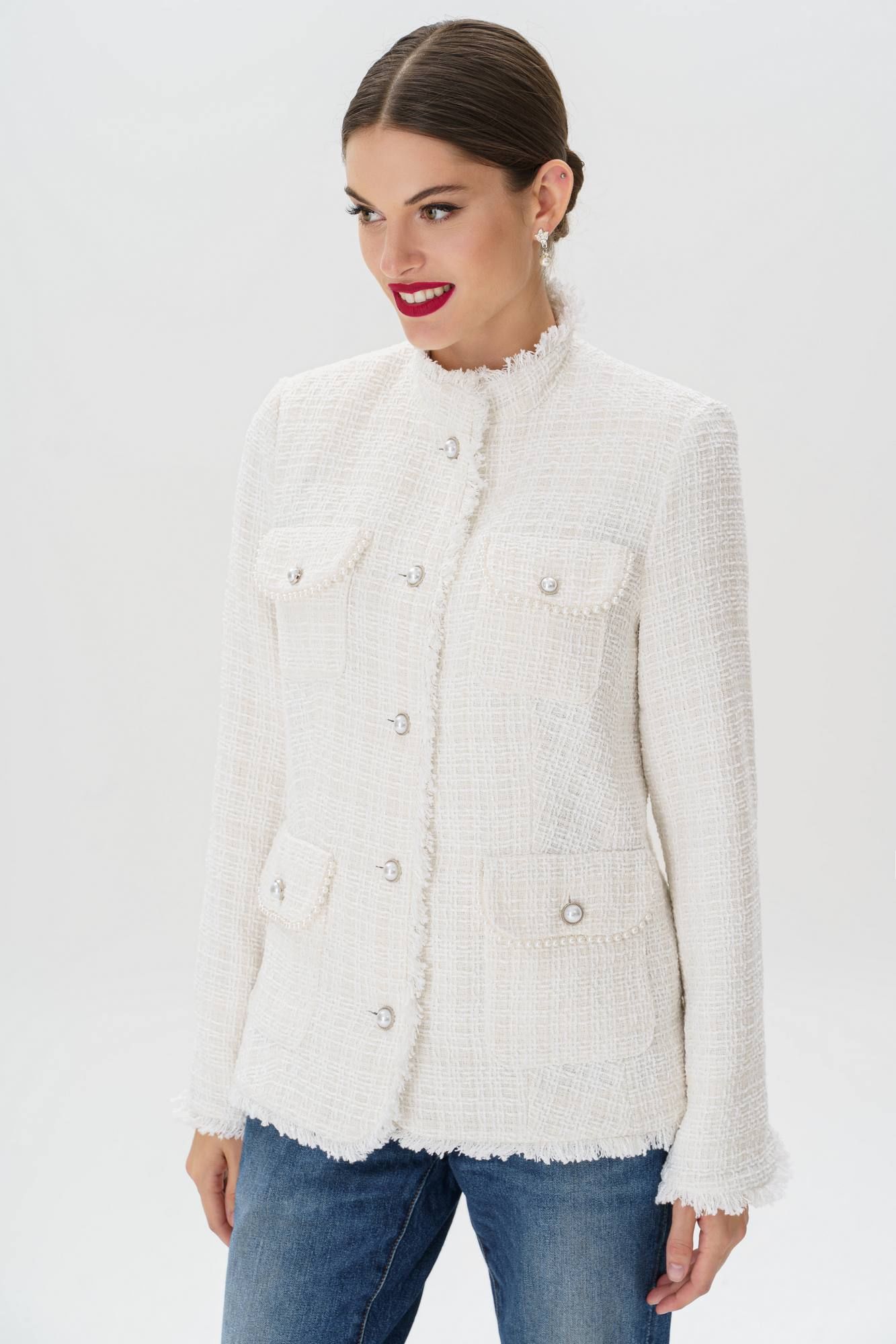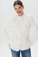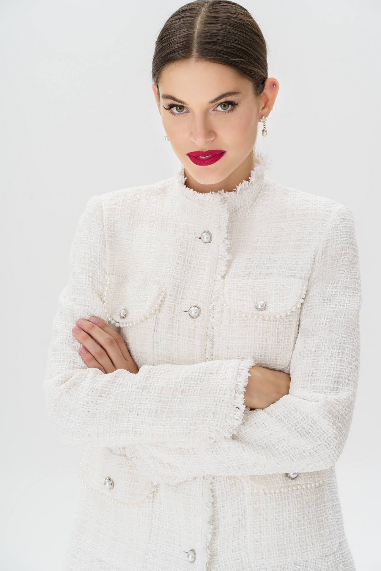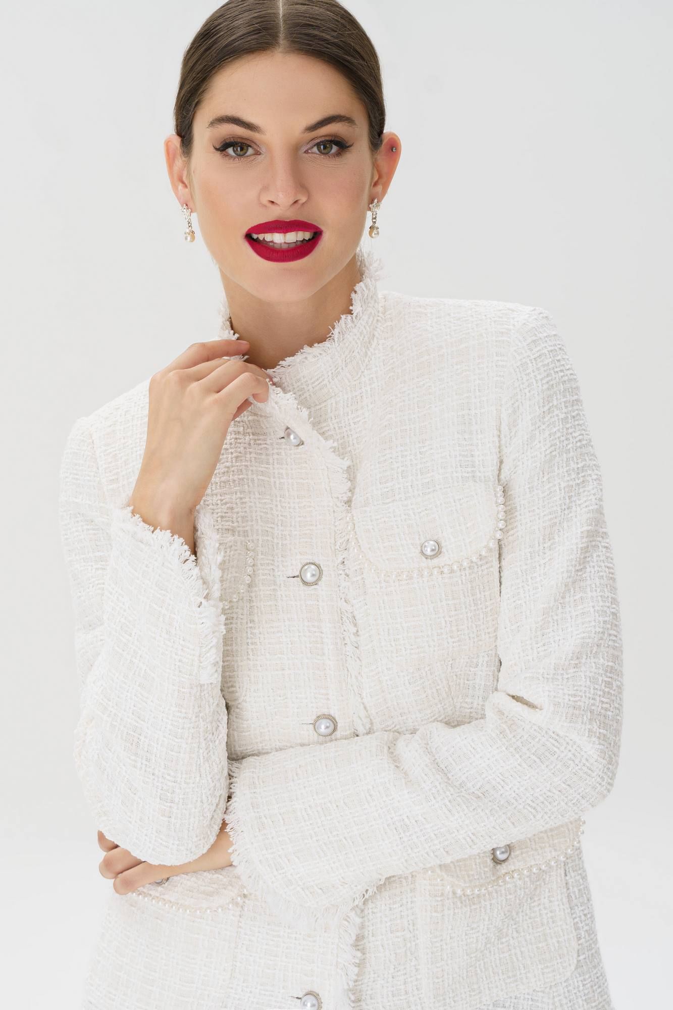 Этот жакет в стиле Шанель выполнен из молочного твида, что придает ему особый шарм и элегантность. Красивая отделка и фурнитура дополняют образ, делая его еще более изысканным. Жакет идеально подойдет для создания строгого, но в то же время женственного образа. Он прекрасно сочетается с платьями и юбками, а также с джинсами и брюками. Благодаря качественным материалам и мастерству исполнения, жакет сохранит свою форму и внешний вид на долгое время. В этом жакете вы будете выглядеть стильно и уверенно в любой ситуации. Жакет женский полуприлегающего силуэта на подкладке, нарядный. Жакет с центральной бортовой застежкой на 5 петель и пуговиц (фурнитура может незначительно отличаться от фото). Перед с отрезным бочком и талиевой вытачкой. На переде расположены 2 пары накладных карманов с клапаном, по низу карманы немного больше, карманов расположенных на уровне груди. Карманы, клапаны и низ борта закругленной формы. По краю клапанов идет декоративная отделочная тесьма, карманы застегиваются на петлю и пуговицу. Спинка со средним швом и отрезными бочками. Рукава втачные двухшовные длинные по низу локтевого шва обработан разрез с закругленными краями. Плечевой пояс оформлен плечевыми накладками. Горловина обработана воротником стойкой. По низу рукавов, борту жакета, низу и стойке идет отделка бахромой. "42 размер Жакет Длина по среднему шву спинки – 60,0 см (±2,0 см), Длина рукава - 62,0 см (±1,0 см), Ширина рукава вверху - 16,5 см (±1,0 см), Ширина рукава по низу - 13,0 см (±0,5 см), Ширина на уровне глубины проймы - 47,0 см (±1,0 см), Ширина на уровне линии талии - 45,0 см (±1,0 см), Ширина на уровне линии бедер -50,5 см (±1,0 см), Длина плеча - 11,6 см (±1,0 см). 44 размер Жакет Длина по среднему шву спинки – 60,5 см (±2,0 см), Длина рукава - 62,0 см (±1,0 см), Ширина рукава вверху - 17,5 см (±1,0 см), Ширина рукава по низу - 13,2 см (±0,5 см), Ширина на уровне глубины проймы - 49,0 см (±1,0 см), Ширина на уровне линии талии - 47,0 см (±1,0 см), Ширина на уровне линии бедер - 52,0 см (±1,0 см), Длина плеча - 11,7 см (±1,0 см). 46 размер Жакет Длина по среднему шву спинки – см (±2,0 см), Длина рукава - см (±1,0 см), Ширина рукава вверху - см (±1,0 см), Ширина рукава по низу - см (±0,5 см), Ширина на уровне глубины проймы - см (±1,0 см), Ширина на уровне линии талии - см (±1,0 см), Ширина на уровне линии бедер - см (±1,0 см), Длина плеча - см (±1,0 см). 48 размер Жакет Длина по среднему шву спинки – см (±2,0 см), Длина рукава - см (±1,0 см), Ширина рукава вверху - см (±1,0 см), Ширина рукава по низу - см (±0,5 см), Ширина на уровне глубины проймы - см (±1,0 см), Ширина на уровне линии талии - см (±1,0 см), Ширина на уровне линии бедер - см (±1,0 см), Длина плеча - см (±1,0 см). 50 размер Жакет Длина по среднему шву спинки – см (±2,0 см), Длина рукава - см (±1,0 см), Ширина рукава вверху - см (±1,0 см), Ширина рукава по низу - см (±0,5 см), Ширина на уровне глубины проймы - см (±1,0 см), Ширина на уровне линии талии - см (±1,0 см), Ширина на уровне линии бедер - см (±1,0 см), Длина плеча - см (±1,0 см). 52 размер Жакет Длина по среднему шву спинки – см (±2,0 см), Длина рукава - см (±1,0 см), Ширина рукава вверху - см (±1,0 см), Ширина рукава по низу - см (±0,5 см), Ширина на уровне глубины проймы - см (±1,0 см), Ширина на уровне линии талии - см (±1,0 см), Ширина на уровне линии бедер - см (±1,0 см), Длина плеча - см (±1,0 см). "
