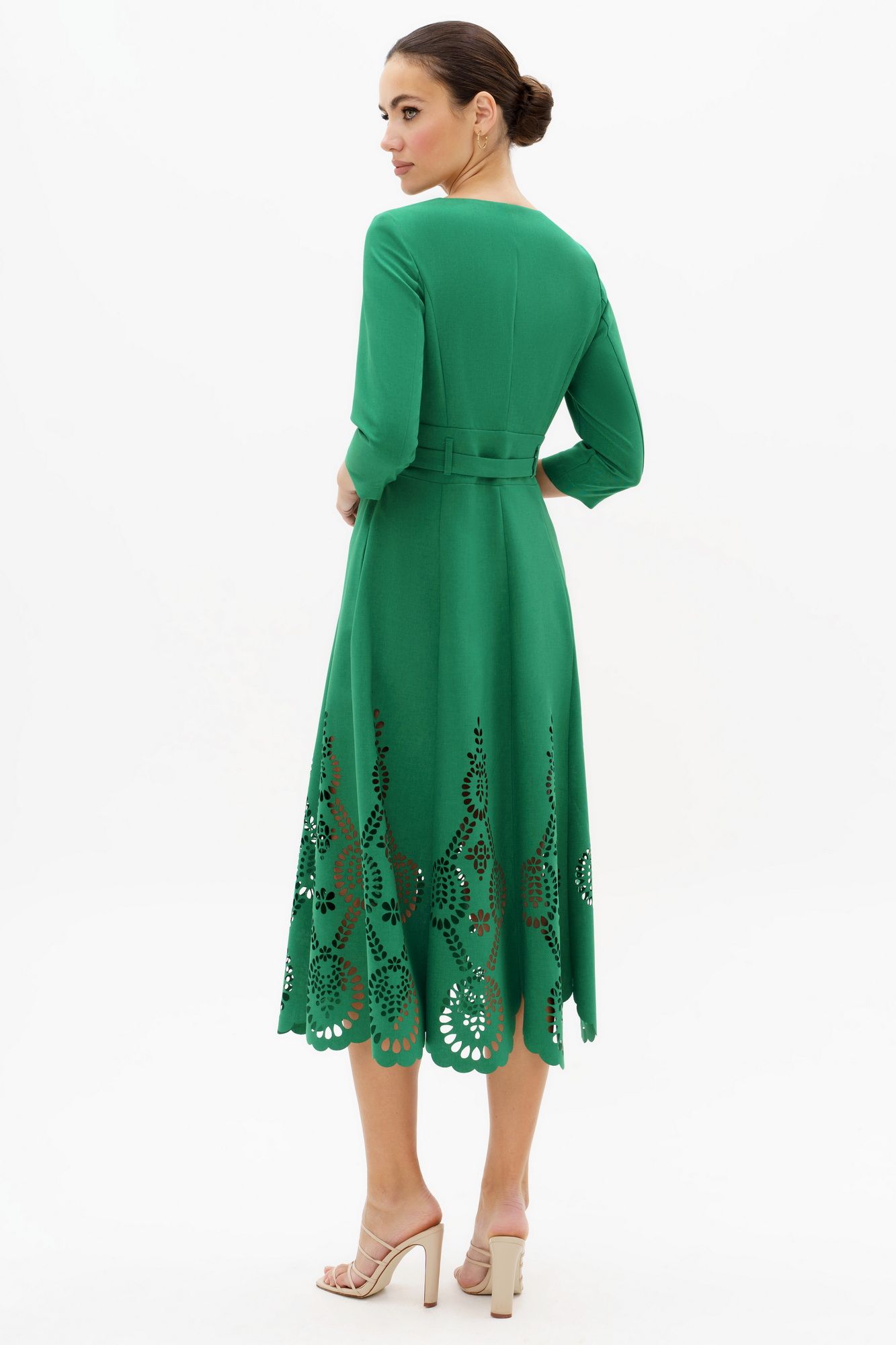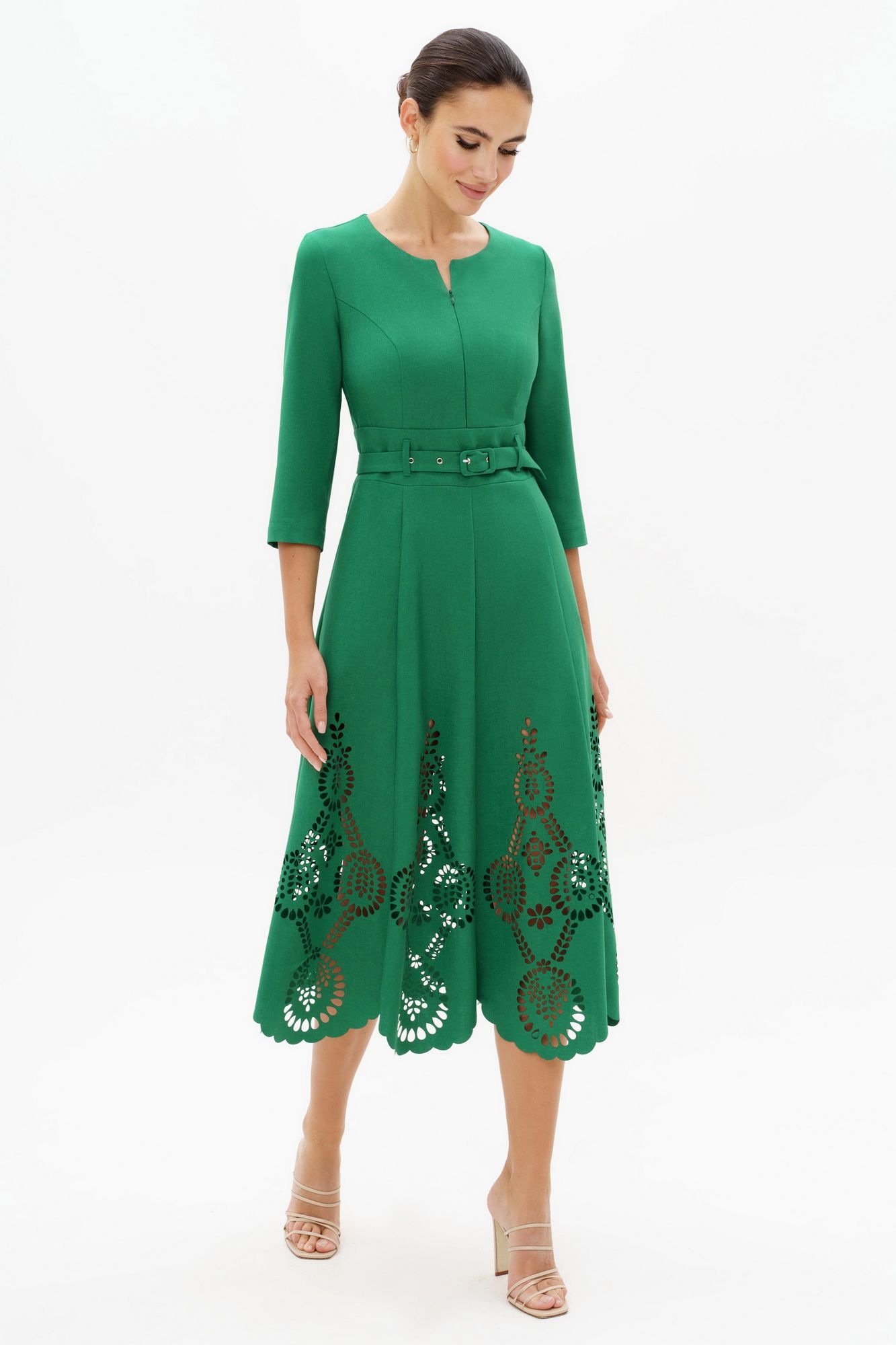 Лаконичный фасон и женственность – две важные особенности. Именно этими словами можно охарактеризовать это платье с дизайнерской перфорацией по низу. Платье женское полуприлегающего силуэта, из плательной ткани лен-вишер, отрезное по линии талии с втачным поясом. Платье с художественной перфорацией по низу изделия. Платье может быть как нарядным так и для повседневной носки. Верхняя часть переда с рельефными швами, проходящими через центр груди и идущими из пройм, вниз до пояса, со средним швом, в верхней части которого обработана застежка на потайную тесьму - "молнию". Спинка со средним швом, в верхней части которого расположена застежка на потайную тесьму - "молнию", с рельефными швами идущими из пройм, вниз до втачного пояса. Втачной пояс по переду и спинке на уровне талии с двумя парами настрочных шлевок. Горловина круглой формы, обтачная. Рукава втачные, двухшовные, длинной ¾. Нижняя часть платья восьмиклинка. В боковых швах нижней части платья обработаны карманы в шве. Платье со съемным поясом с обтяжной пряжкой и металлическими люверсами (размер и цвет фурнитуры может незначительно отличаться от фото). Средняя длина платья по среднему шву спинки 124,0 см (±3,0 см). Средняя длина рукава ¾. 45,0 см (±1,5 см). Состав ткани: ПЛАТЬЕ: полиэстер - 100%