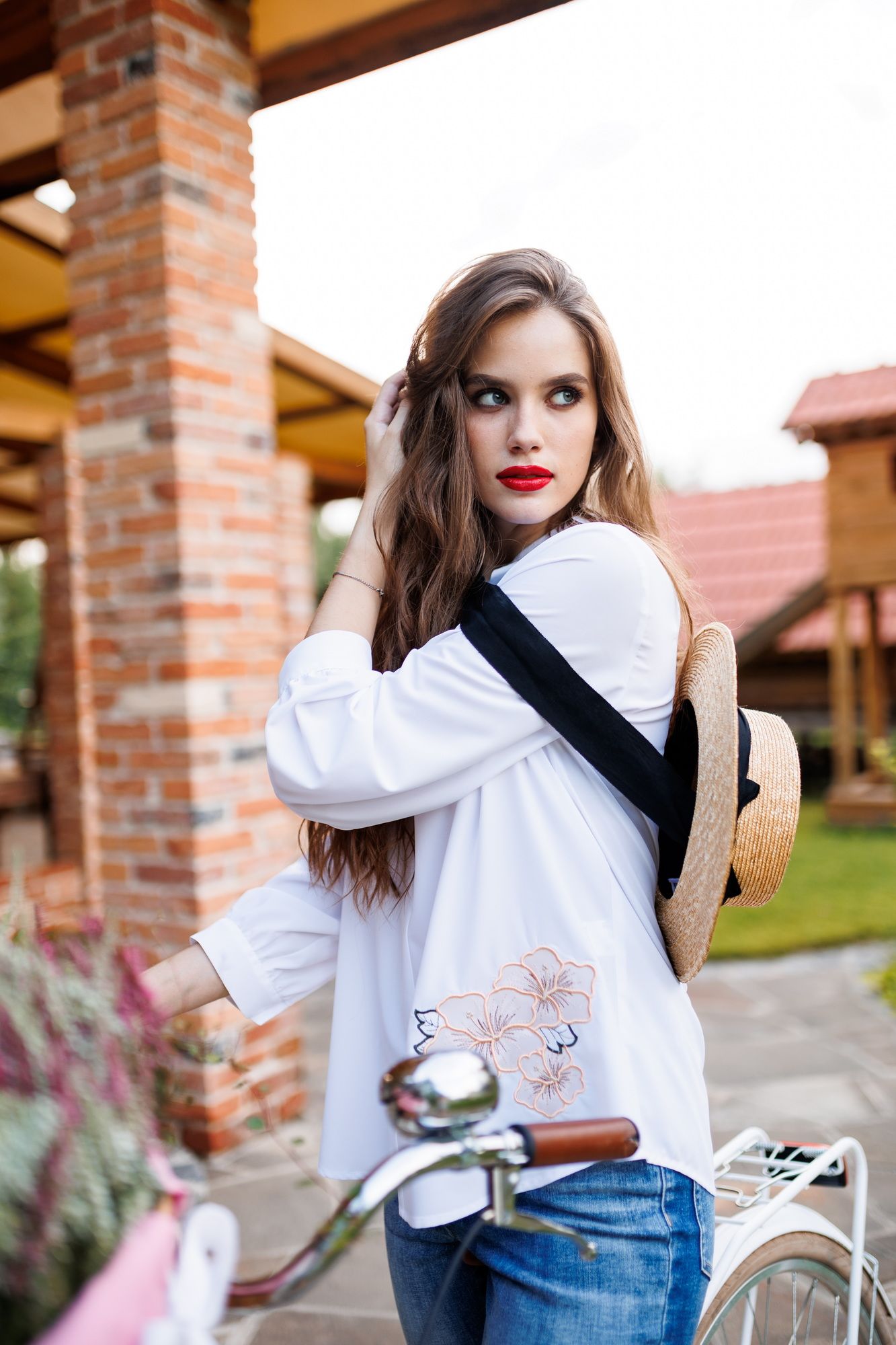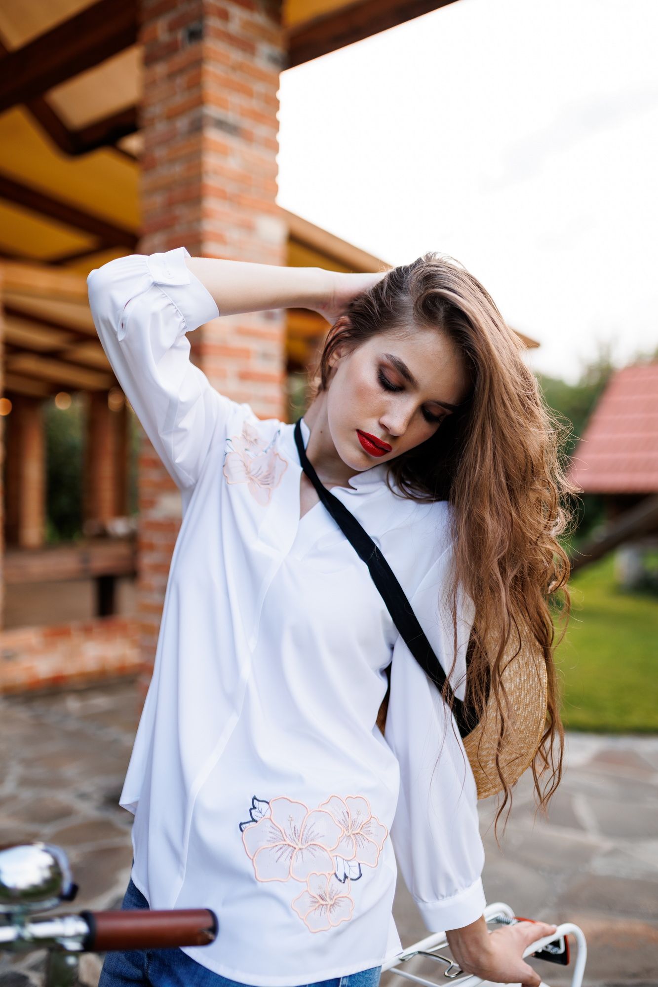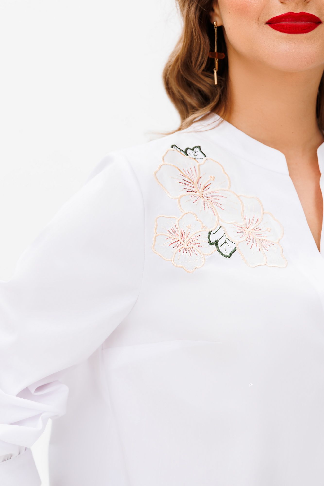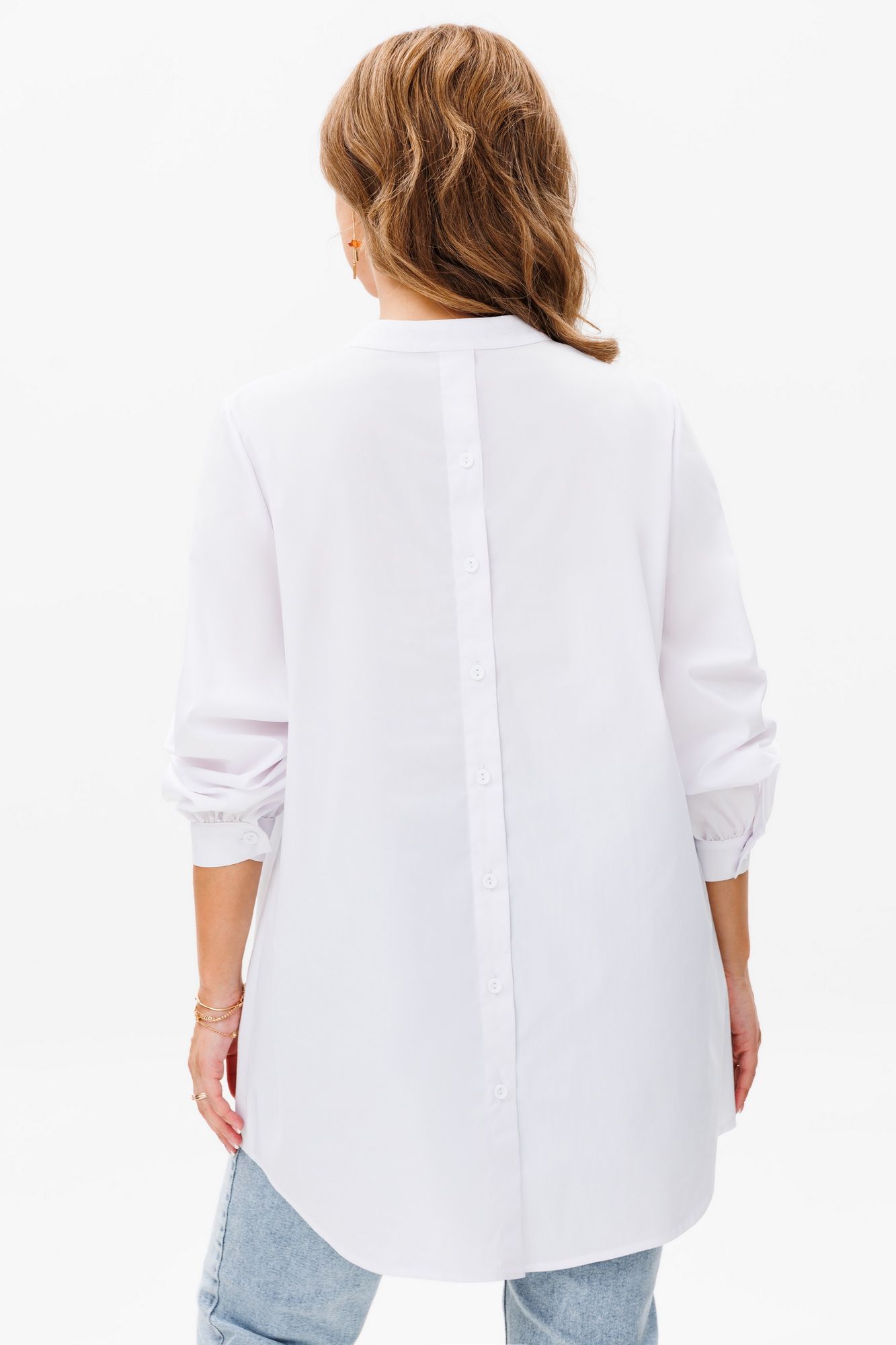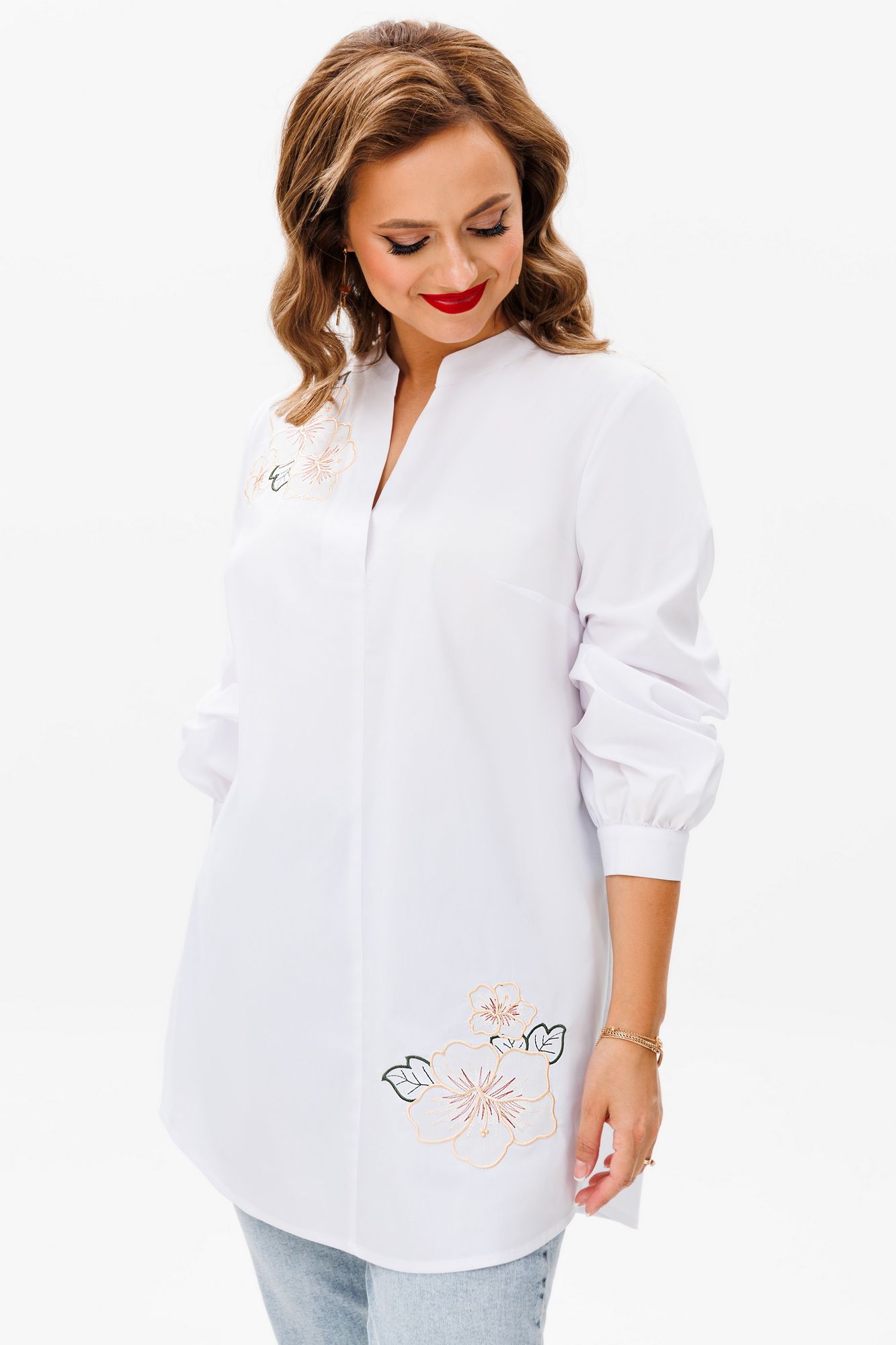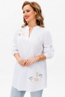 Блузка женская свободного силуэта, выполненная из лёгкой и приятной к телу блузочной ткани, создаёт стильный и комфортный образ. Верхняя правая и нижняя левая части переда украшены изящной вышивкой в виде цветов, добавляя изысканности и нежности. Изюминку блузки добавляет спинка с центральной функциональной застежкой идущей от воротника-стойки до низа. Эта блузка идеально сочетается с юбками, брюками и джинсами, позволяя экспериментировать с образами и подчёркивая индивидуальность. Блузка женская свободного силуэта, выполнена из блузочной ткани. Перед с нагрудными вытачками, идущими от боковых швов, с ˅- образным углубленным вырезом с цельнокроеными планками. Со смещенным влево ассиметричным средним швом, идущим от планок и уходящим вниз. Верхняя правая и нижняя левая части переда оформлены декоративной вышивкой. Спинка с центральной функциональной застежкой на 7 петель и 7 пуговиц идущей от воротника-стойки до низа. Низ переда и спинки фигурной формы. Верхний срез горловины переда и спинки обработан воротником-стойкой с закругленными концами. Расстояние между концами воротника 5,0 см. Рукава втачные, длинные, одношовные, по низу со сборкой, с притачными манжетами, застегивающимися на 1 петлю и 1 пуговицу, с окантованными разрезами. Средняя длина блузки по середине спинки от воротника-стойки до низа 79,0 см (±2,0 см); Средняя длина рукава с манжетой 60,0 см.(±1,5 см); Тип ткани: блузочная. Состав изделия: хлопок - 70%, полиэстер - 27%, спандекс - 3%