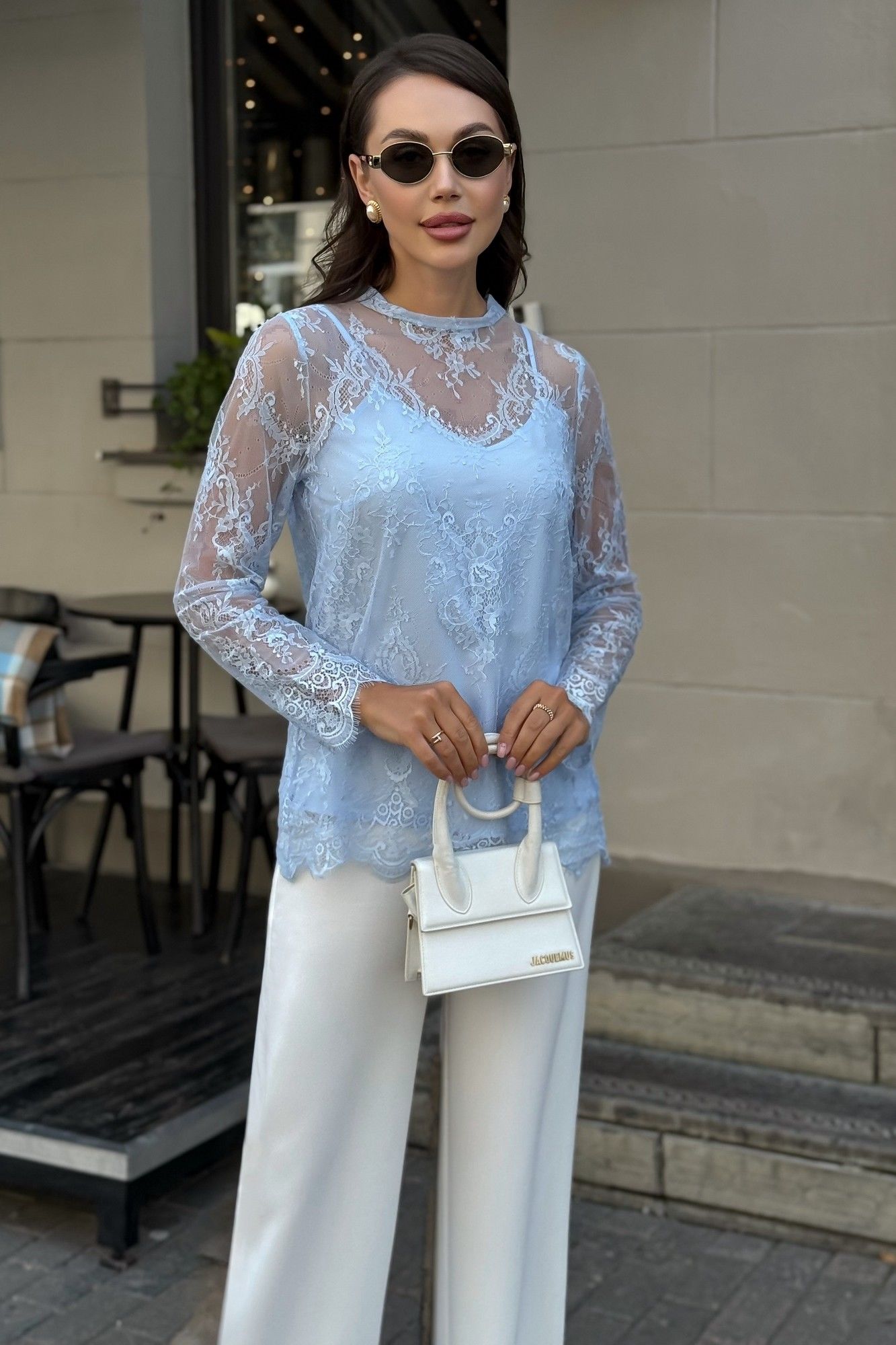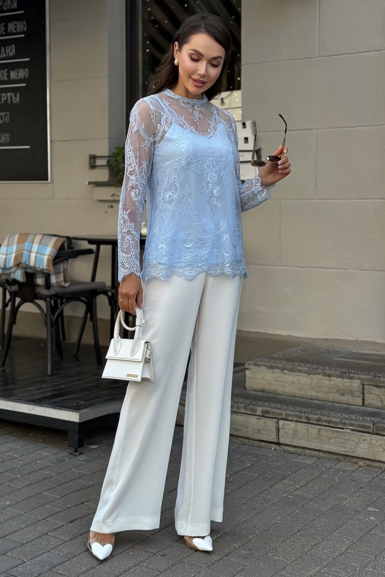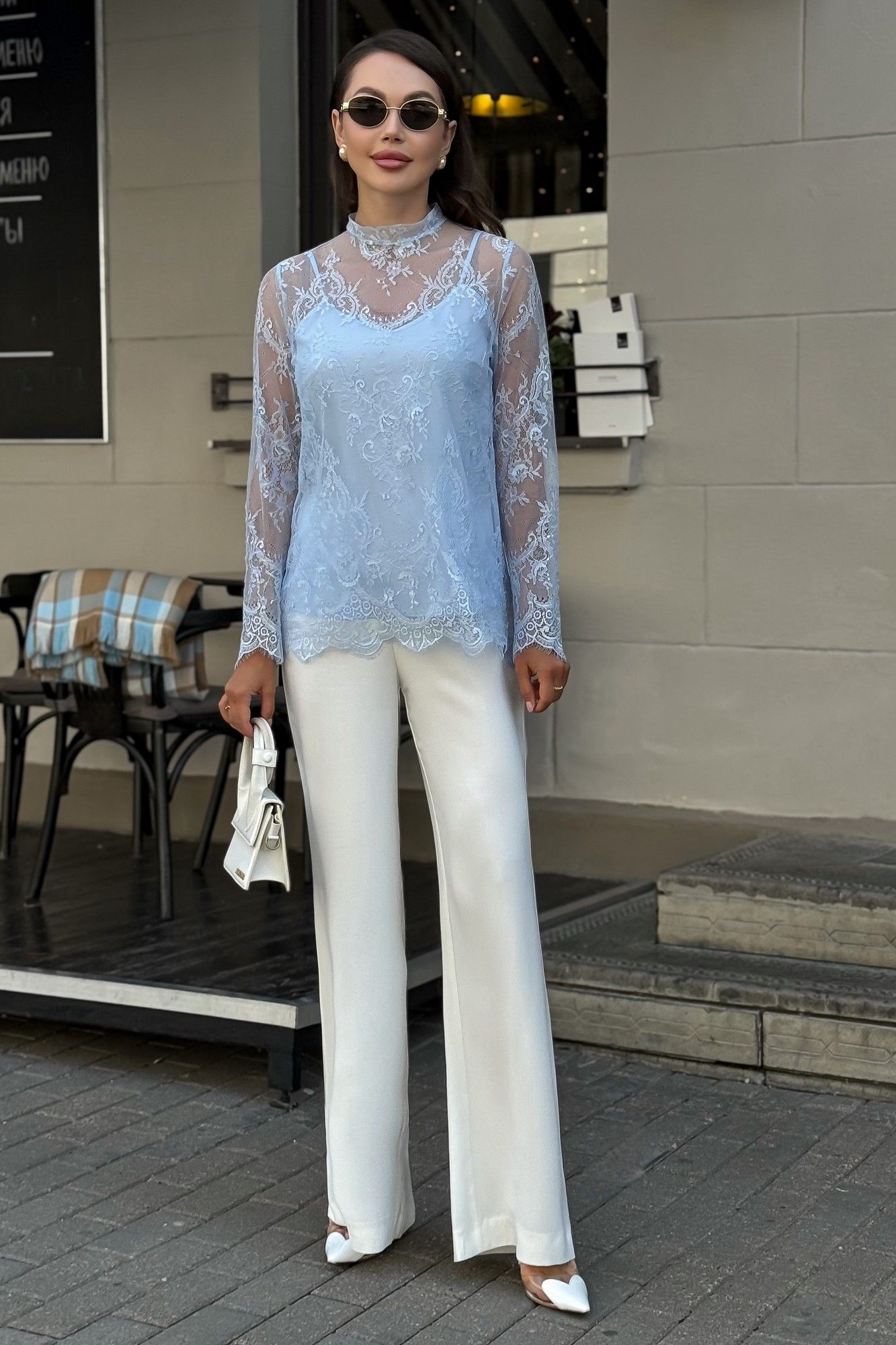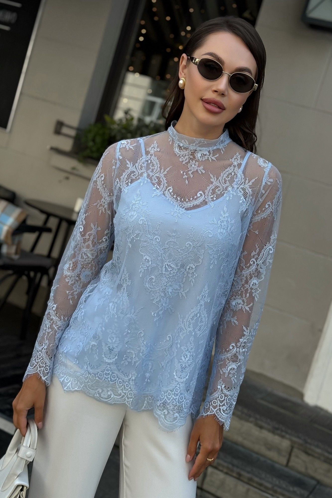 Блузка женская нарядная из гипюра с топом — комплект 2 в 1 для особых случаев Эта нарядная женская блузка из нежного гипюра — идеальное решение для торжественного образа. Комплект женский 2-х предметный, состоящий из блузы и топа, предназначен как для нарядной, так и для повседневной носки. Блуза женская полуприлегающего силуэта, выполнена из гипюровой ткани. Перед и спинка цельные, без вытачек. Спинка от горловины с застежкой на 1 навесную петлю и пуговицу (размер и цвет фурнитуры может незначительно отличаться от фото). Горловина с воротником-стойкой, с обтачными концами по спинке. Рукава втачные, одношовные, длинные. Низа переда, спинки, рукавов оформлены фестонами. Топ женский, 2-х слойный, полуприлегающего силуэта, на регулируемых бретелях. Верхний и нижний слои выполнены из блузочной ткани. Перед с нагрудными вытачками, выходящими из боковых швов. Низ переда и спинки фигурной формы.