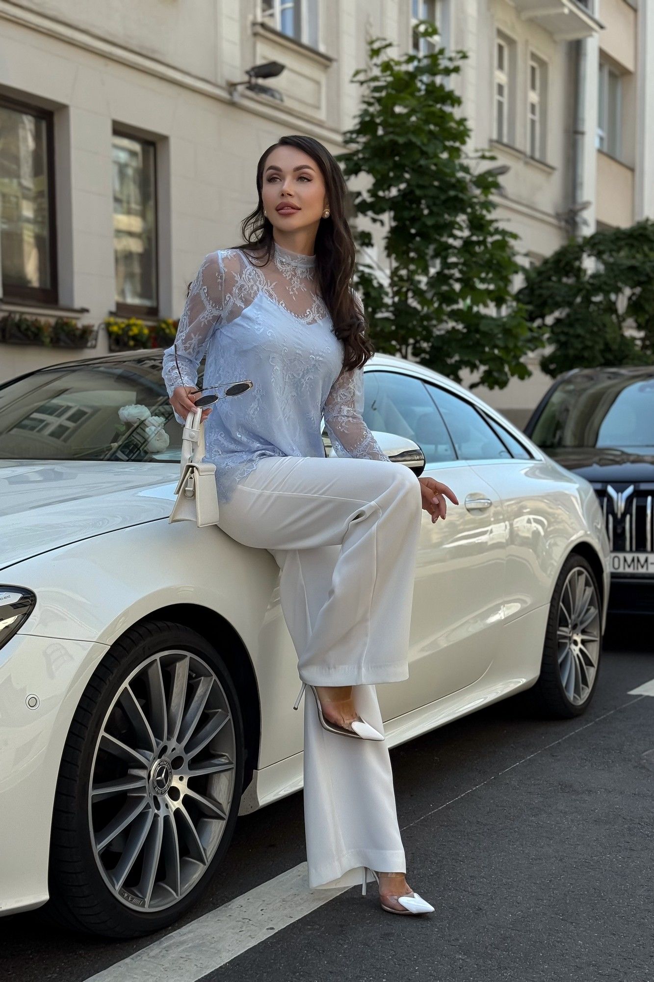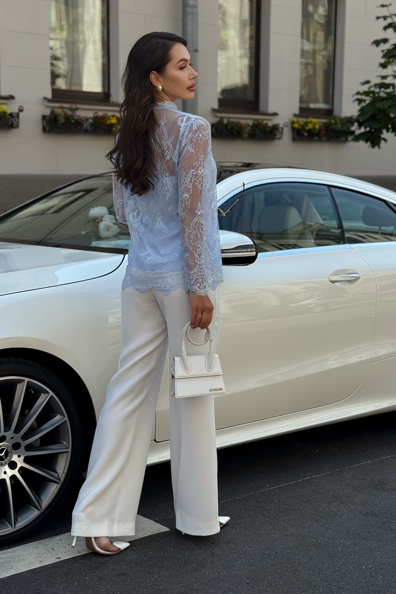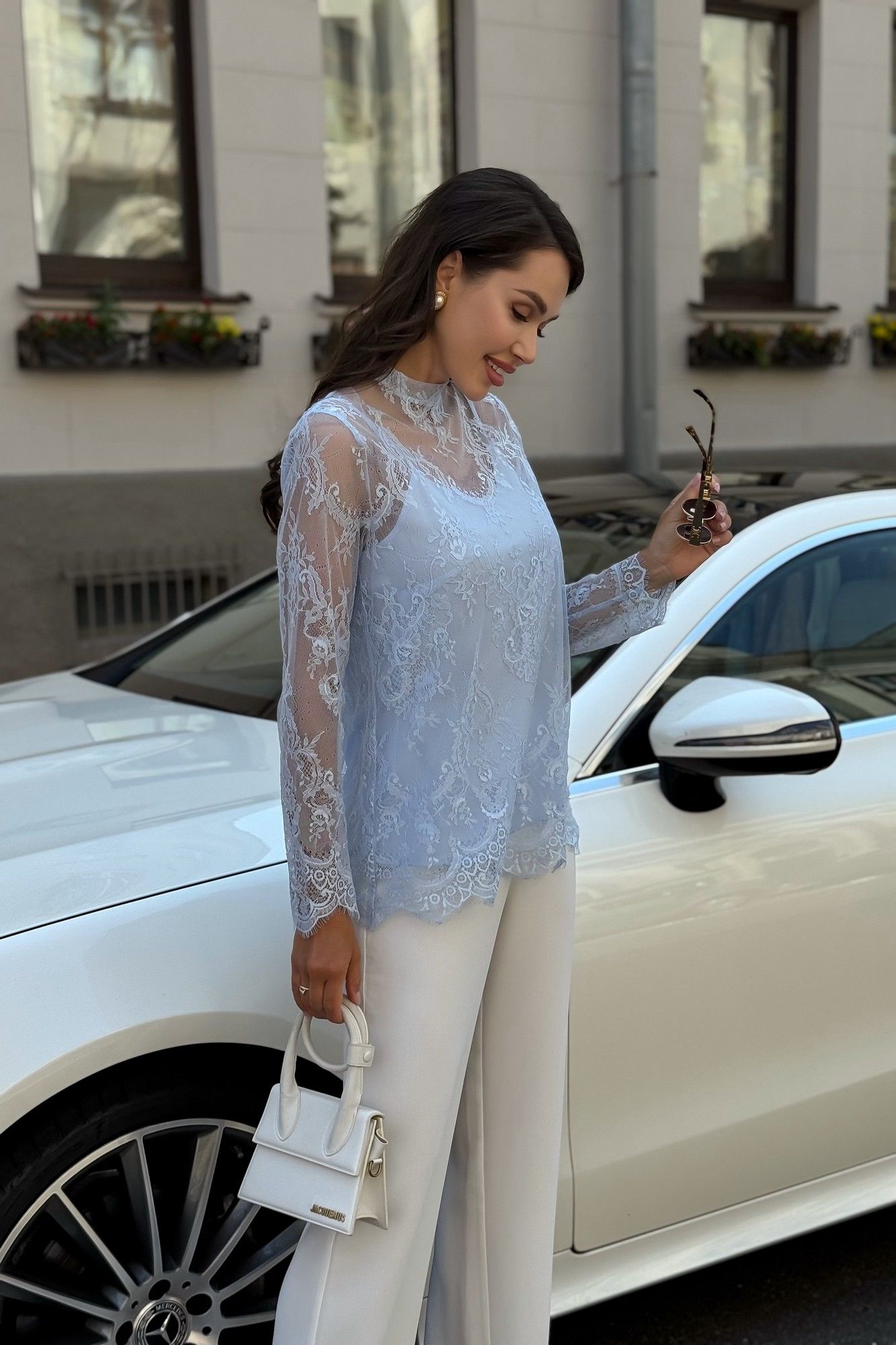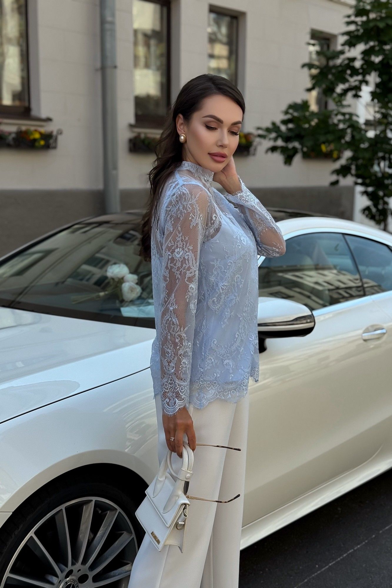 Блузка женская нарядная из гипюра с топом — комплект 2 в 1 для особых случаев Эта нарядная женская блузка из нежного гипюра — идеальное решение для торжественного образа. Комплект женский 2-х предметный, состоящий из блузы и топа, предназначен как для нарядной, так и для повседневной носки. Блуза женская полуприлегающего силуэта, выполнена из гипюровой ткани. Перед и спинка цельные, без вытачек. Спинка от горловины с застежкой на 1 навесную петлю и пуговицу (размер и цвет фурнитуры может незначительно отличаться от фото). Горловина с воротником-стойкой, с обтачными концами по спинке. Рукава втачные, одношовные, длинные. Низа переда, спинки, рукавов оформлены фестонами. Топ женский, 2-х слойный, полуприлегающего силуэта, на регулируемых бретелях. Верхний и нижний слои выполнены из блузочной ткани. Перед с нагрудными вытачками, выходящими из боковых швов. Низ переда и спинки фигурной формы.