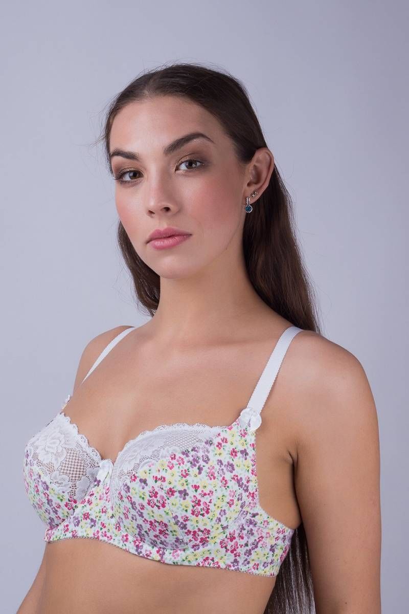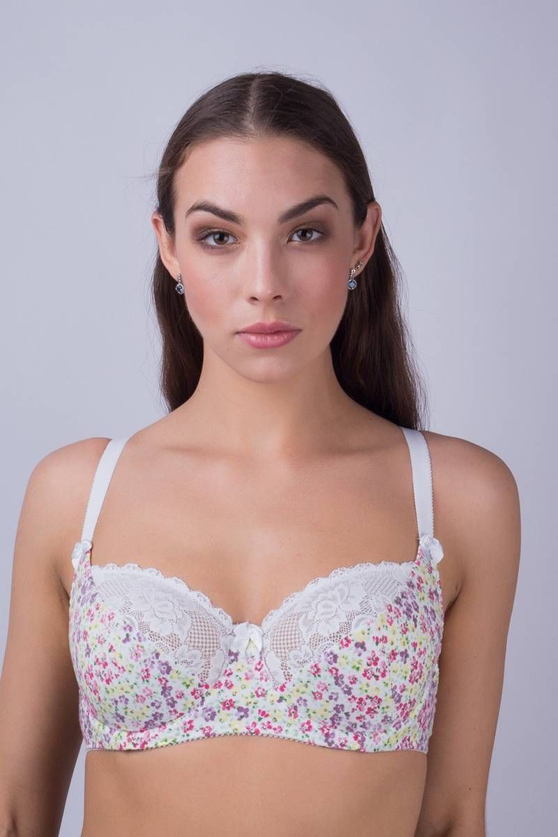 Бюстгальтер из эластичного хлопчатобумажного полотна, нижняя чашка на дубляже, верхняя часть из эластичного кружева, боковые детали из основного трикотажного полотна.