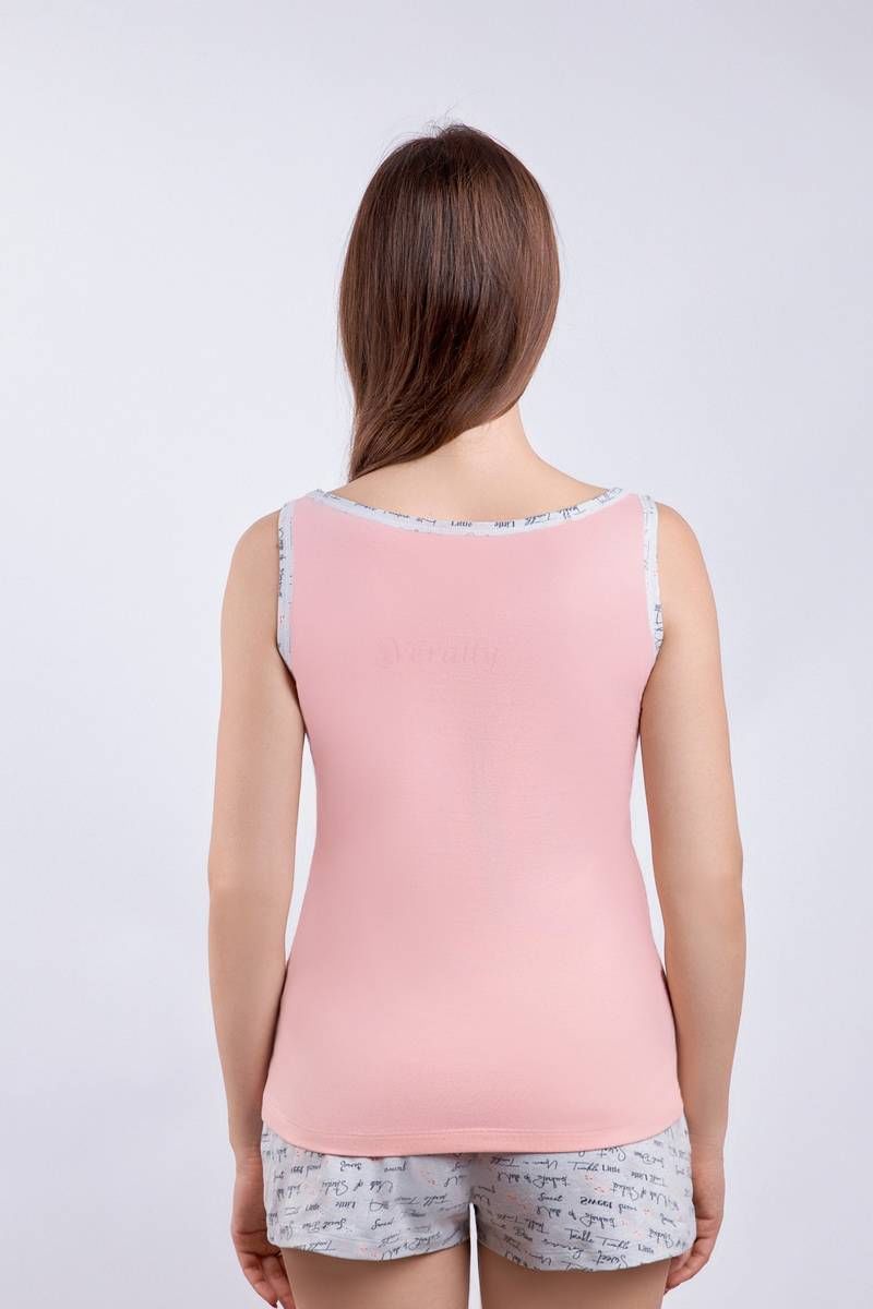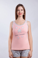 Пижама женская из хлопка с лайкрой. Майка без рукава. На перед майки нанесен принт. Шорты короткие с высокой посадкой.