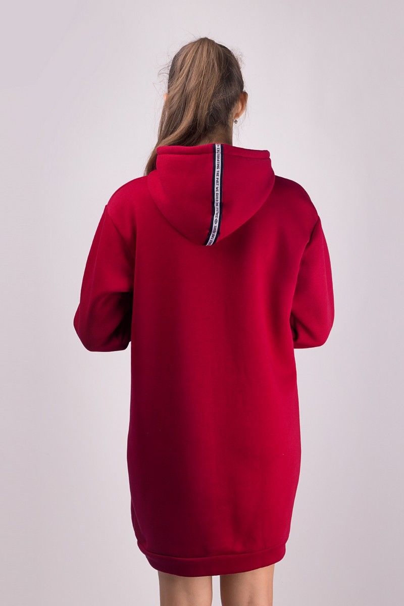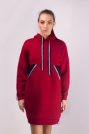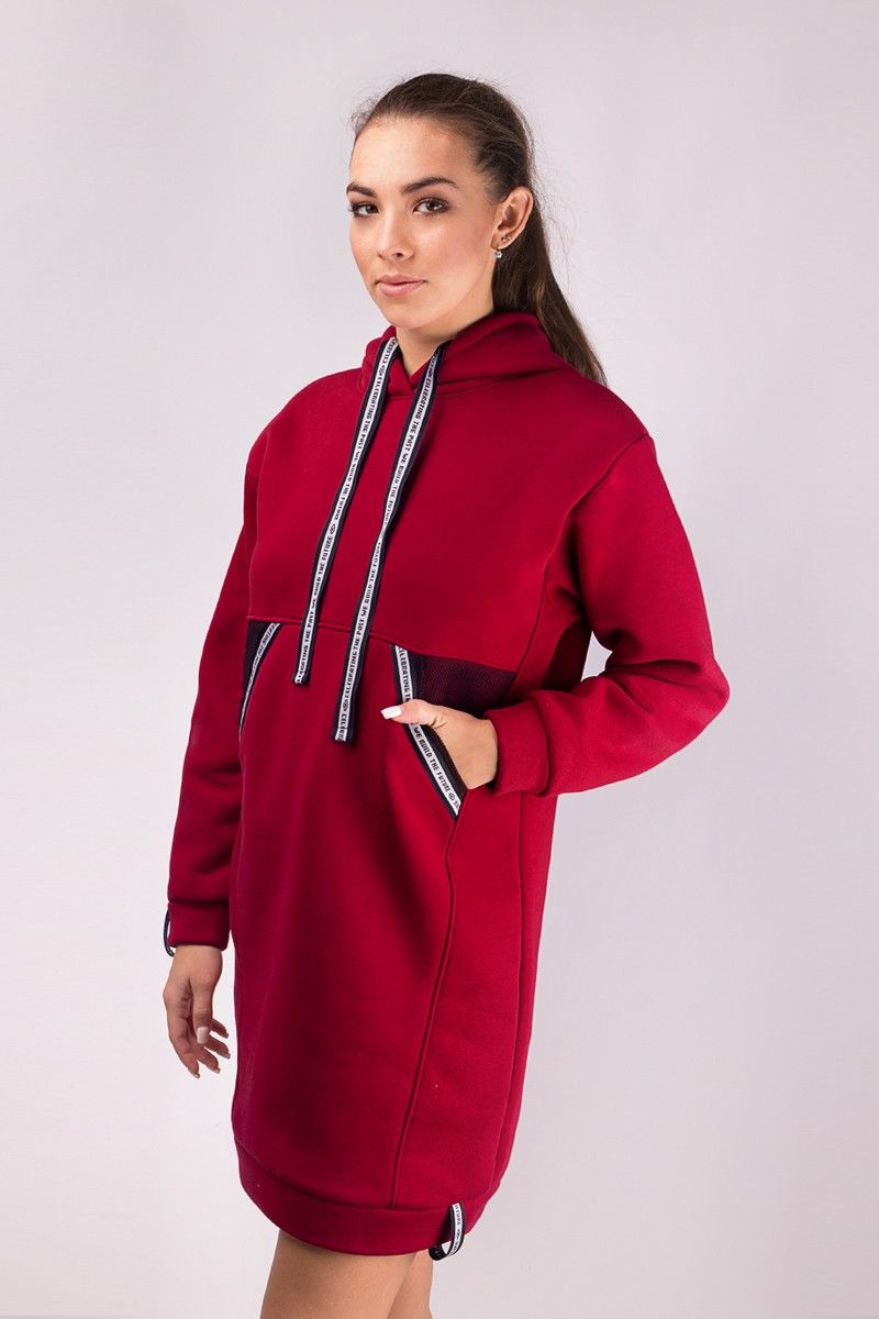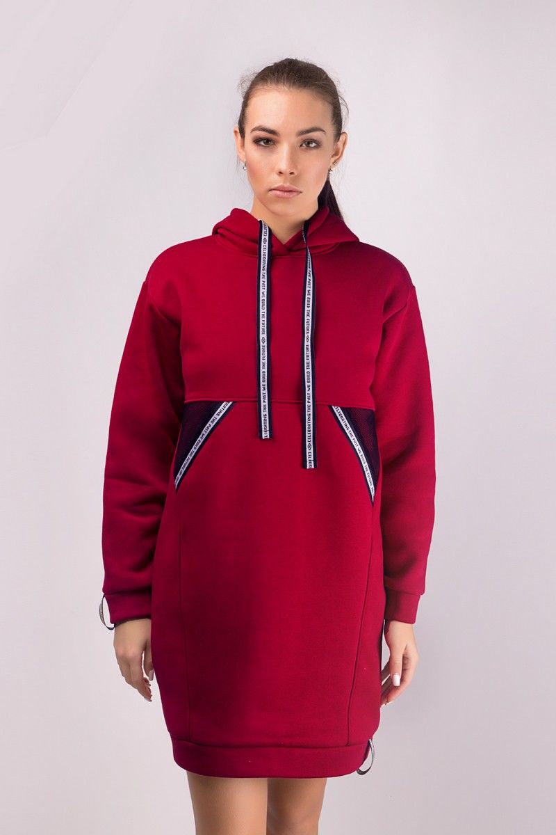 Платье из футера с начесом. По переду имеются рельефы, в которых обработаны карманы и вставки из эластичной сетки. По шву входа в карман и по капюшону настрачивается отделочная лента.