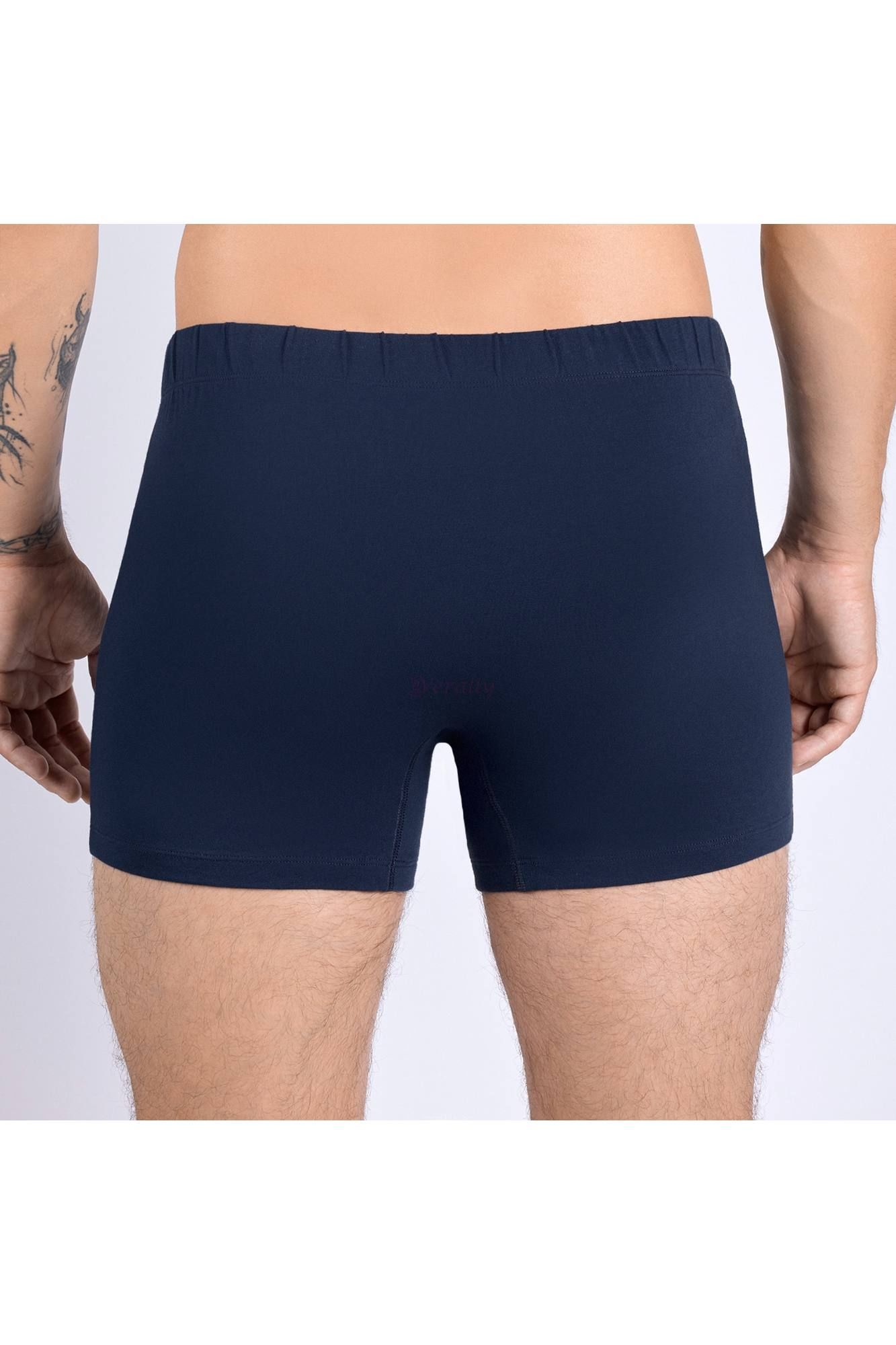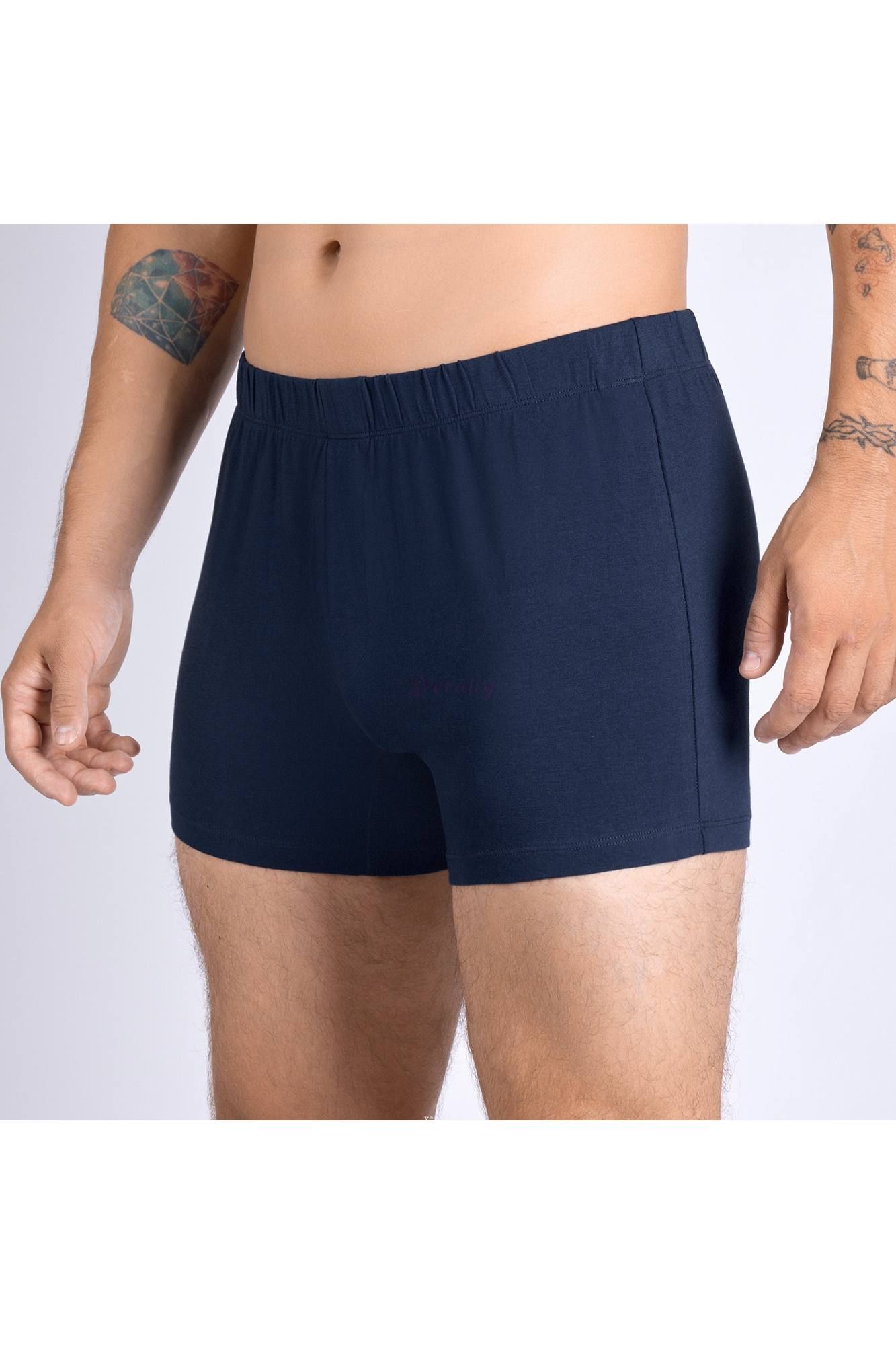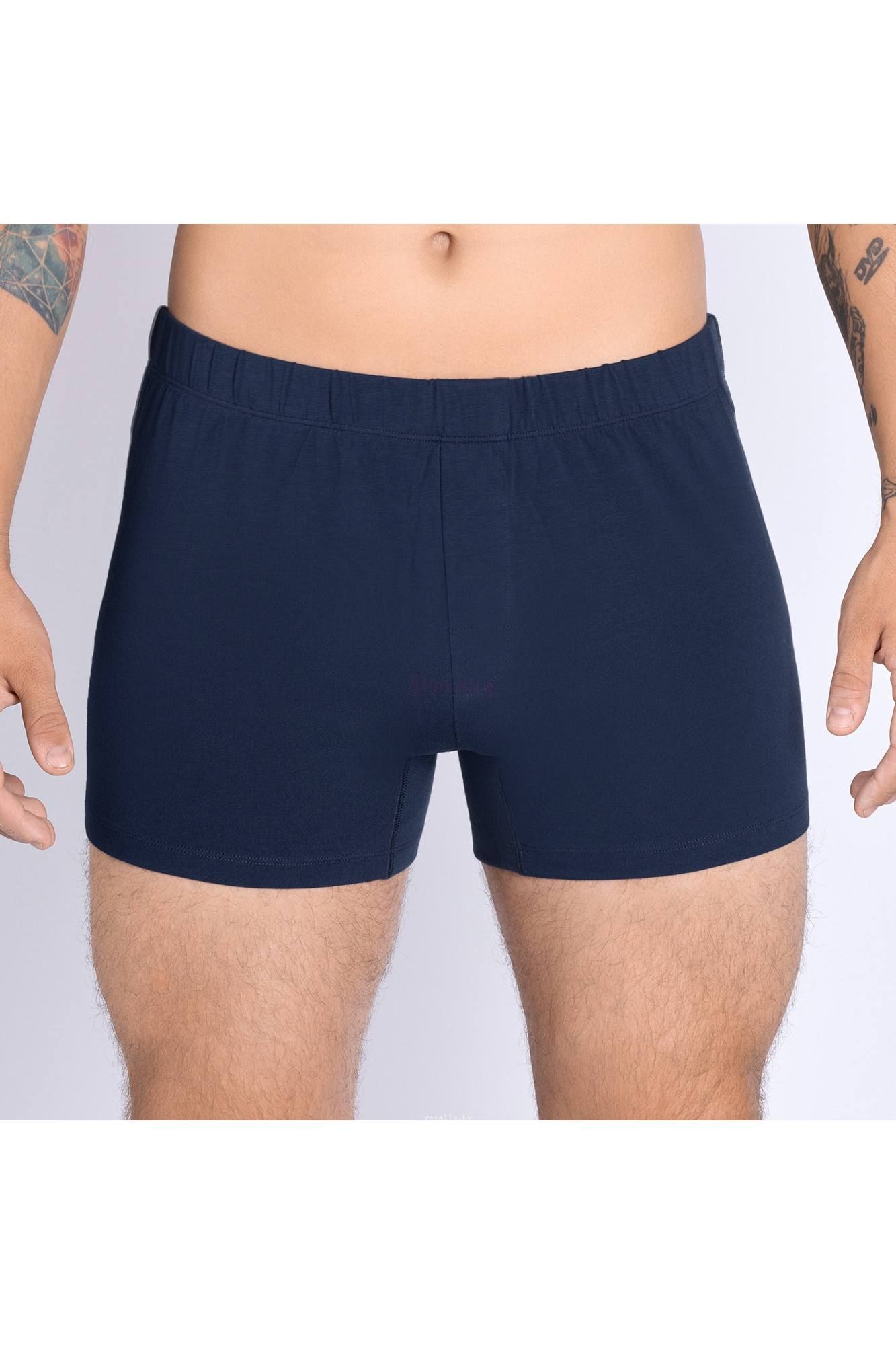 Мужские трусы-шорты из эластичного хлопкового полотна. Умеренного объема, средней посадки на фигуре. Изделие с боковыми швами. По центру переда имитация «гульфика». Верхний срез обработан эластичной тесьмой 3,5см внутри подгибки.