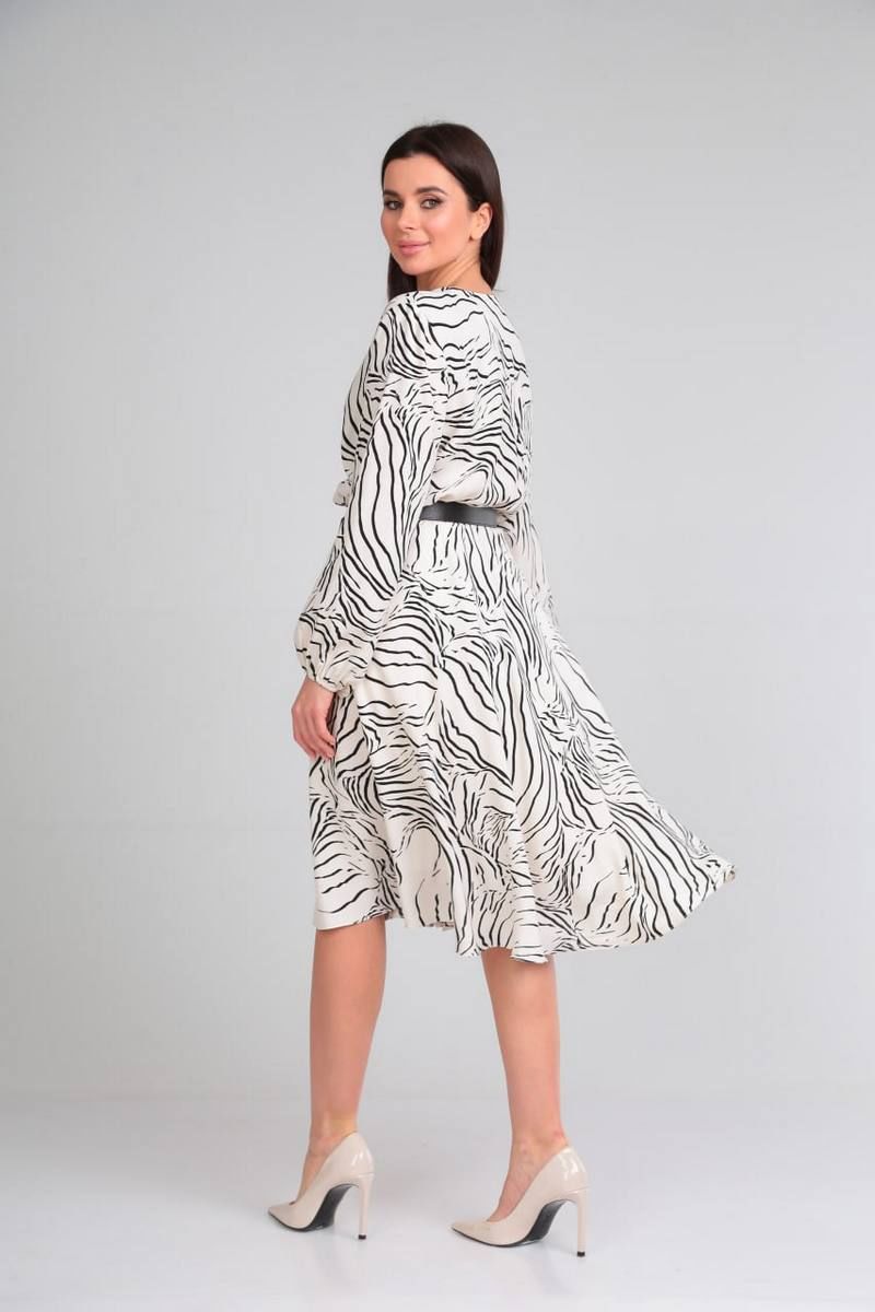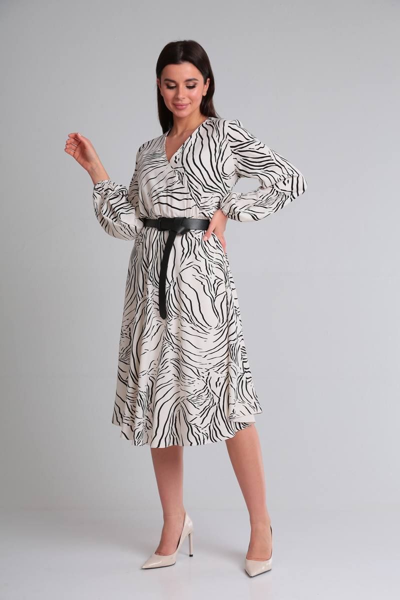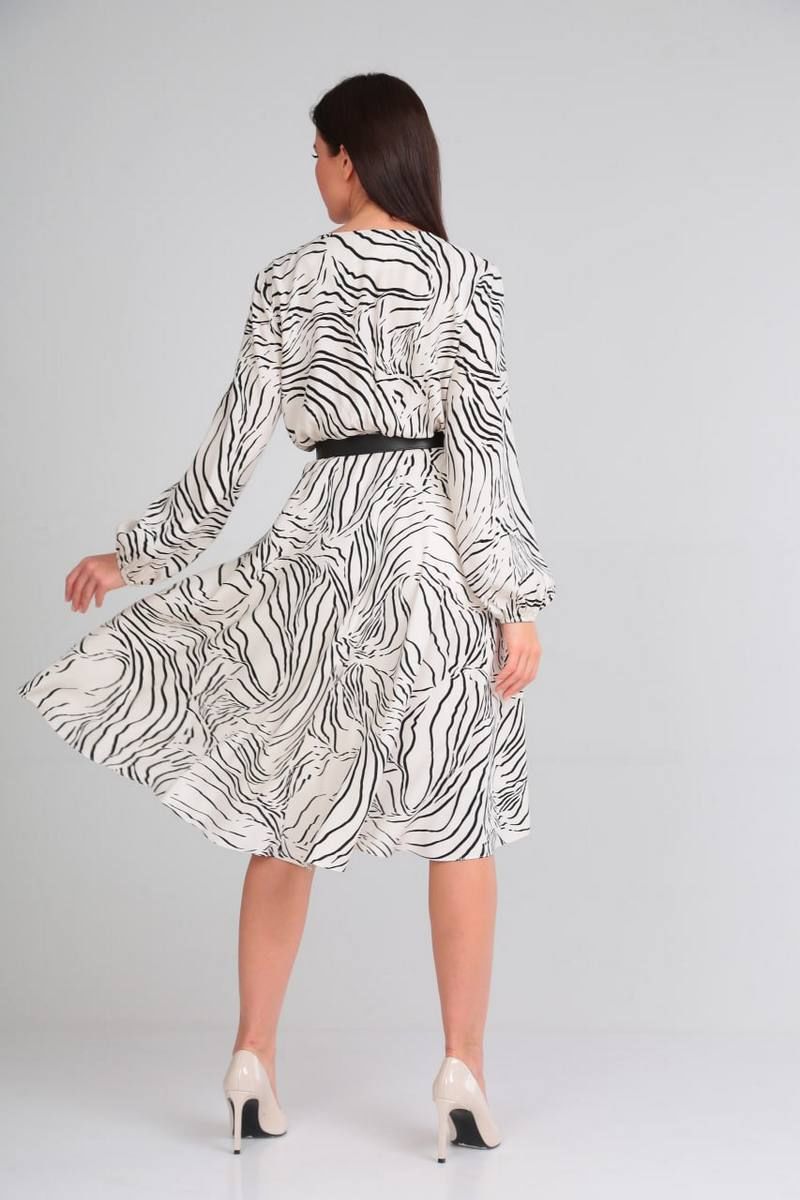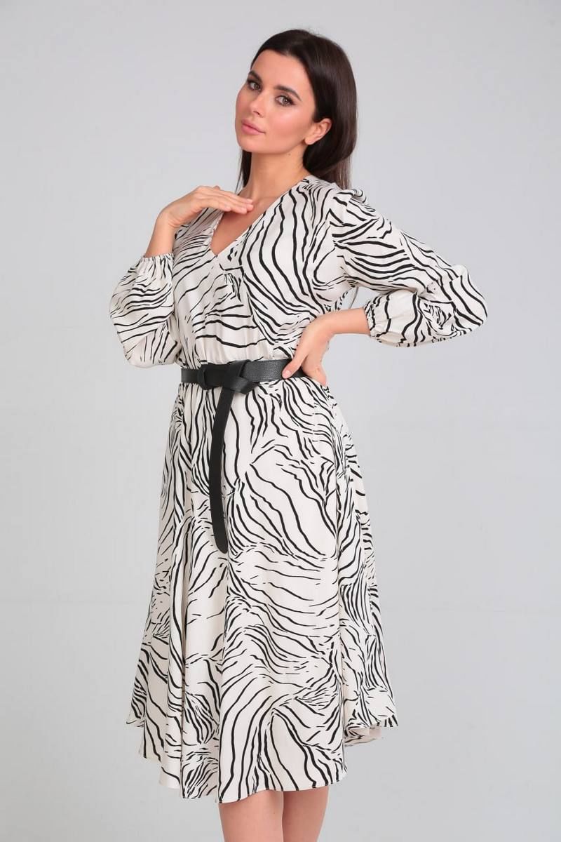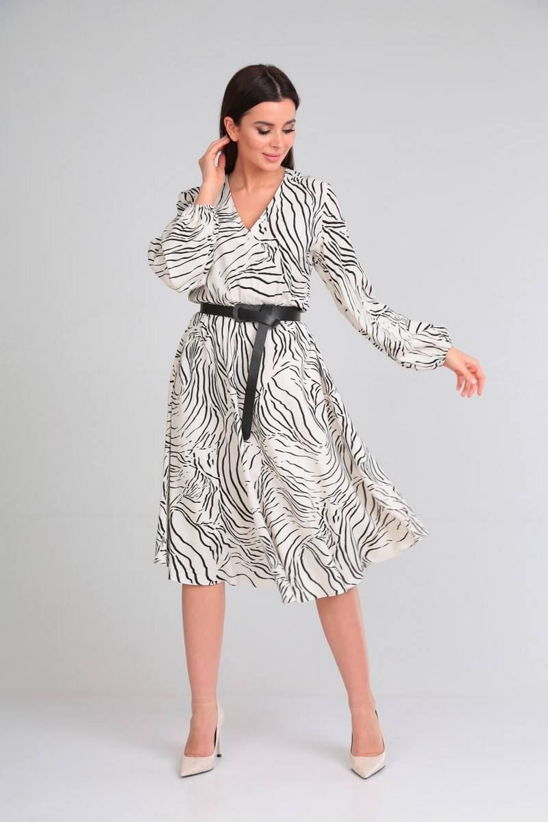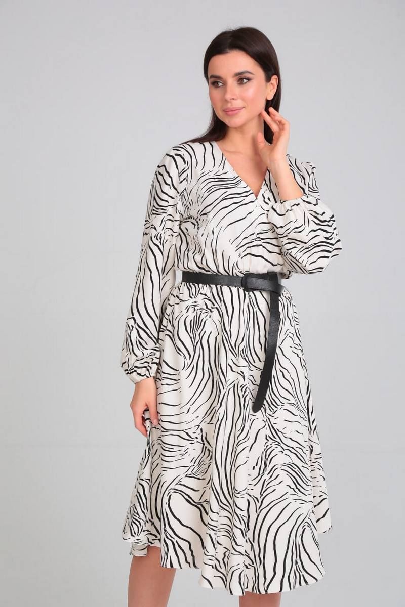 Платье свободного силуэта, отрезное по талии на резинке. По низу платья есть подкладка. Рукав длинный, по низу сборка на резинку. Лиф с имитацией запаха, вырез горловины V-образный. Ремень из экокожи входит в комплект.