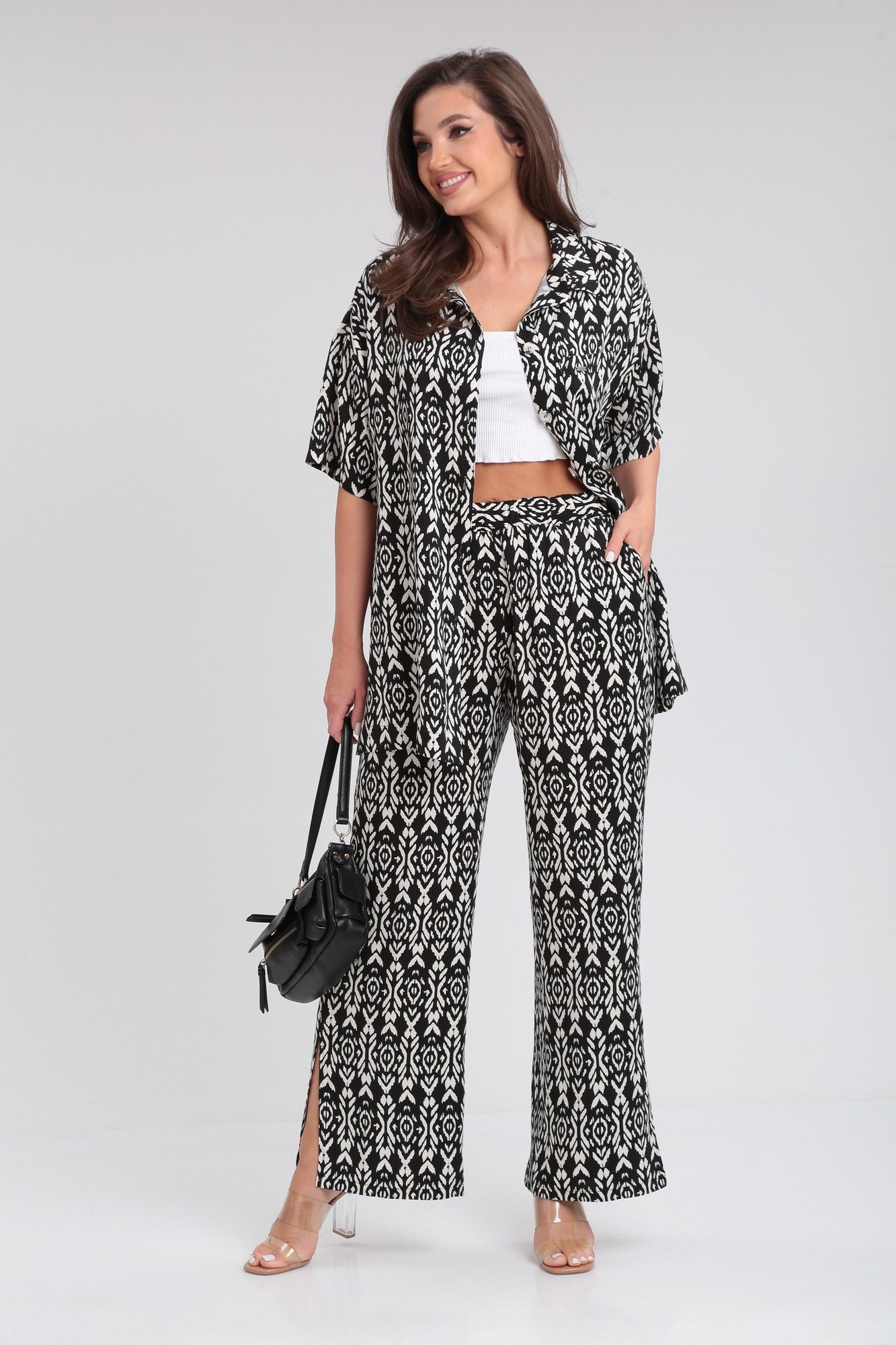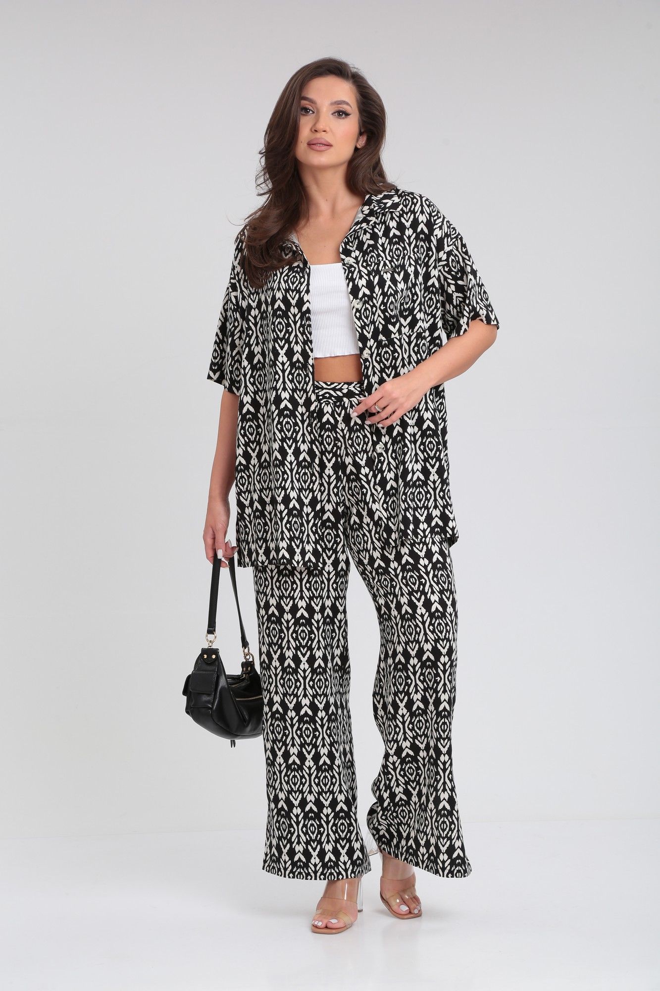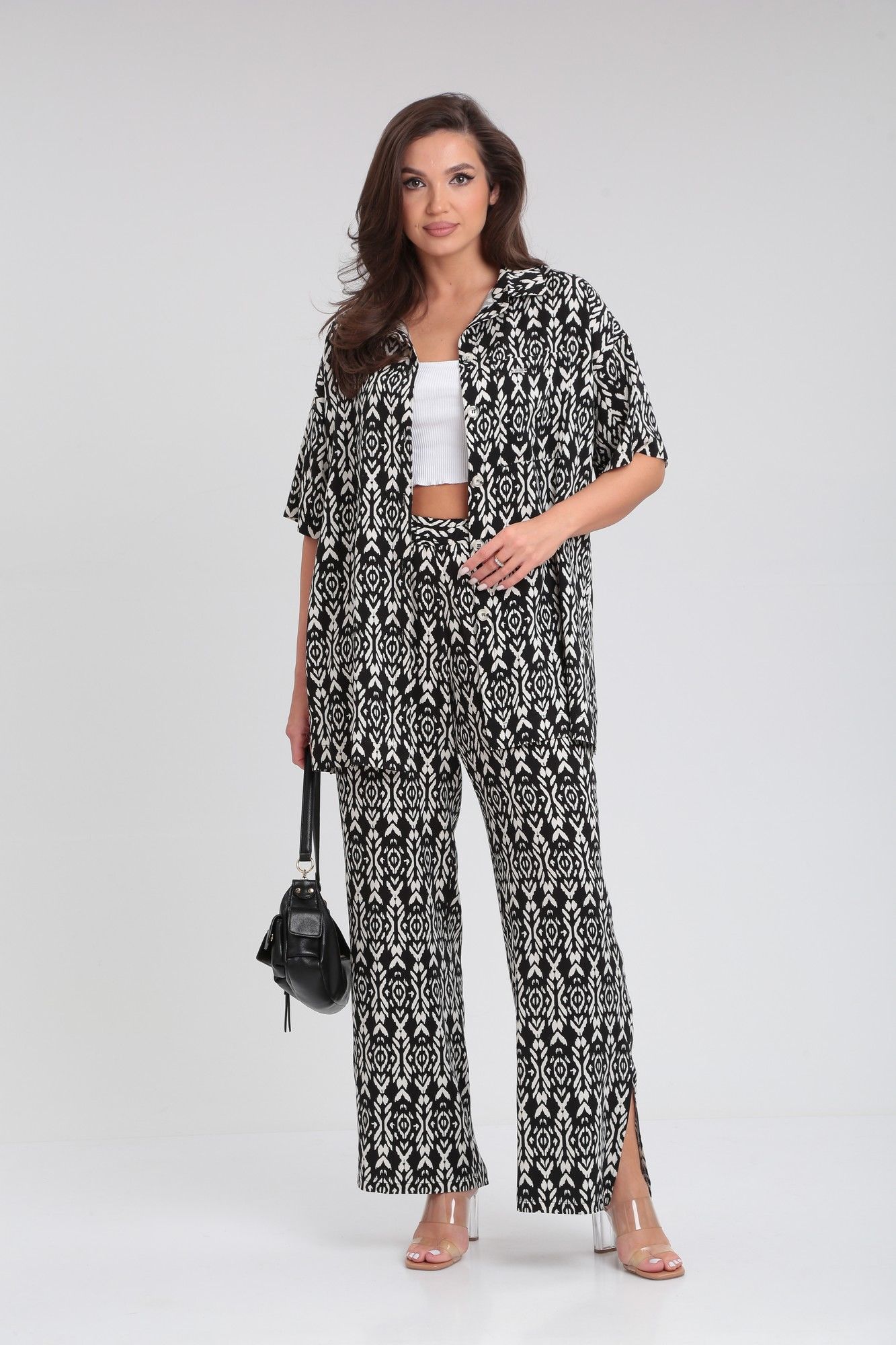 Комплект двойка состоят из рубашки и брюк выполнен из вискозной ткани. Рубашка свободного кроя, с укороченным рукавом. По спинке отрезная кокетка, со складкой. По переду настрочной карман. Застежка петли пуговицы. Брюки прямого кроя. В боковых швах карманы. По низу брюк разрезы.Средняя посадка, пояс на резинке. Длина рубашки – 76 см