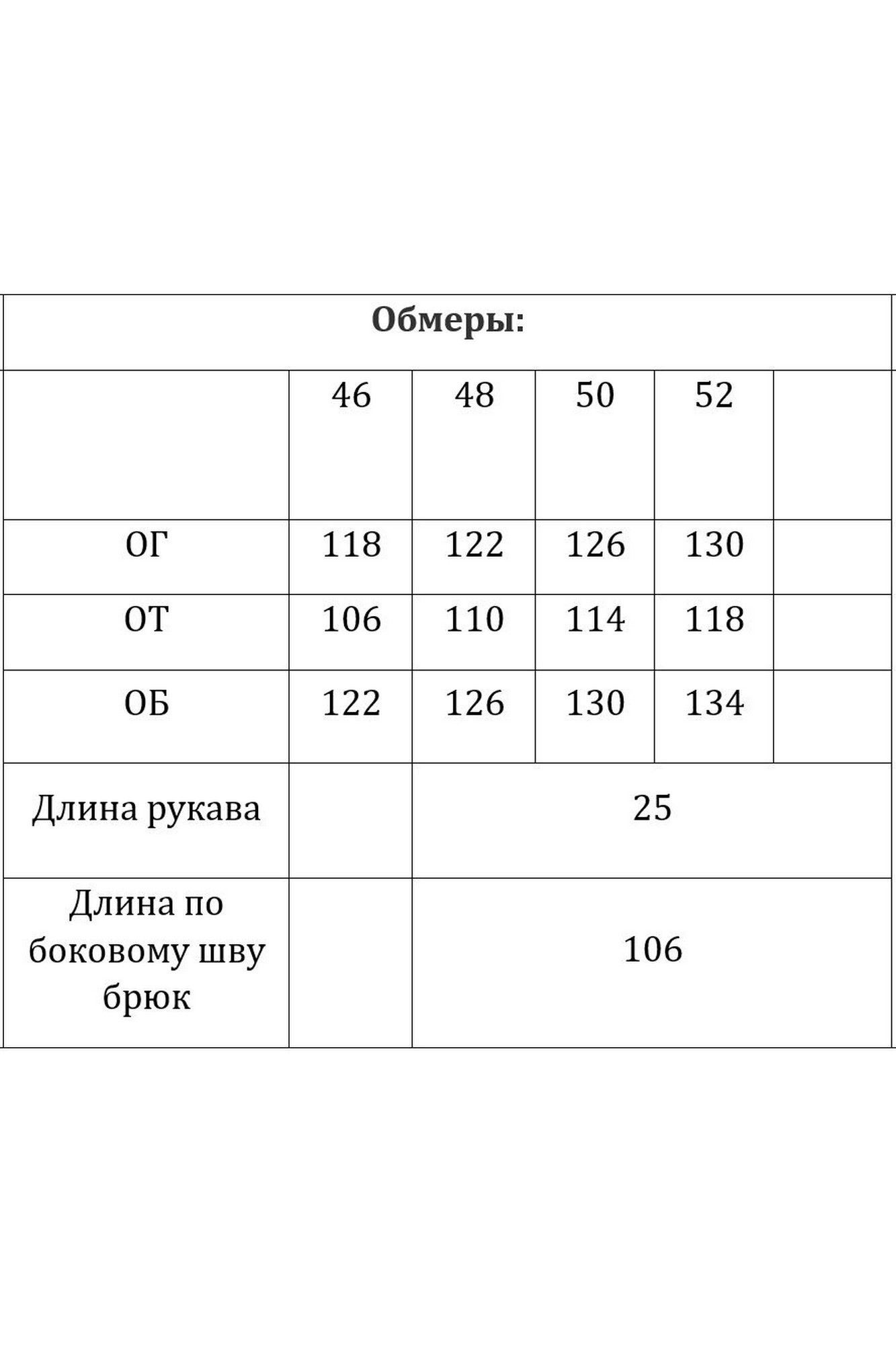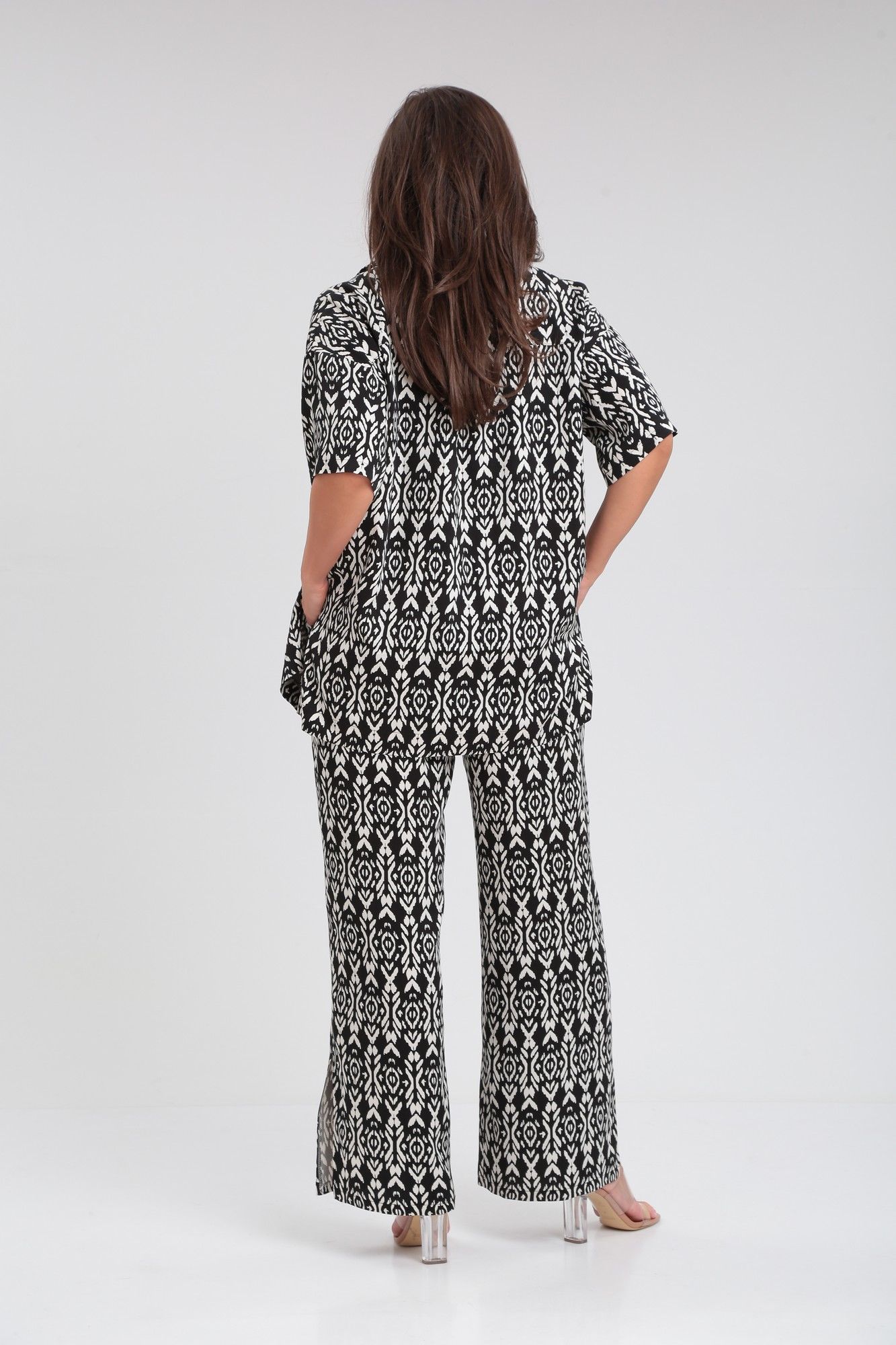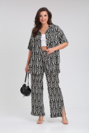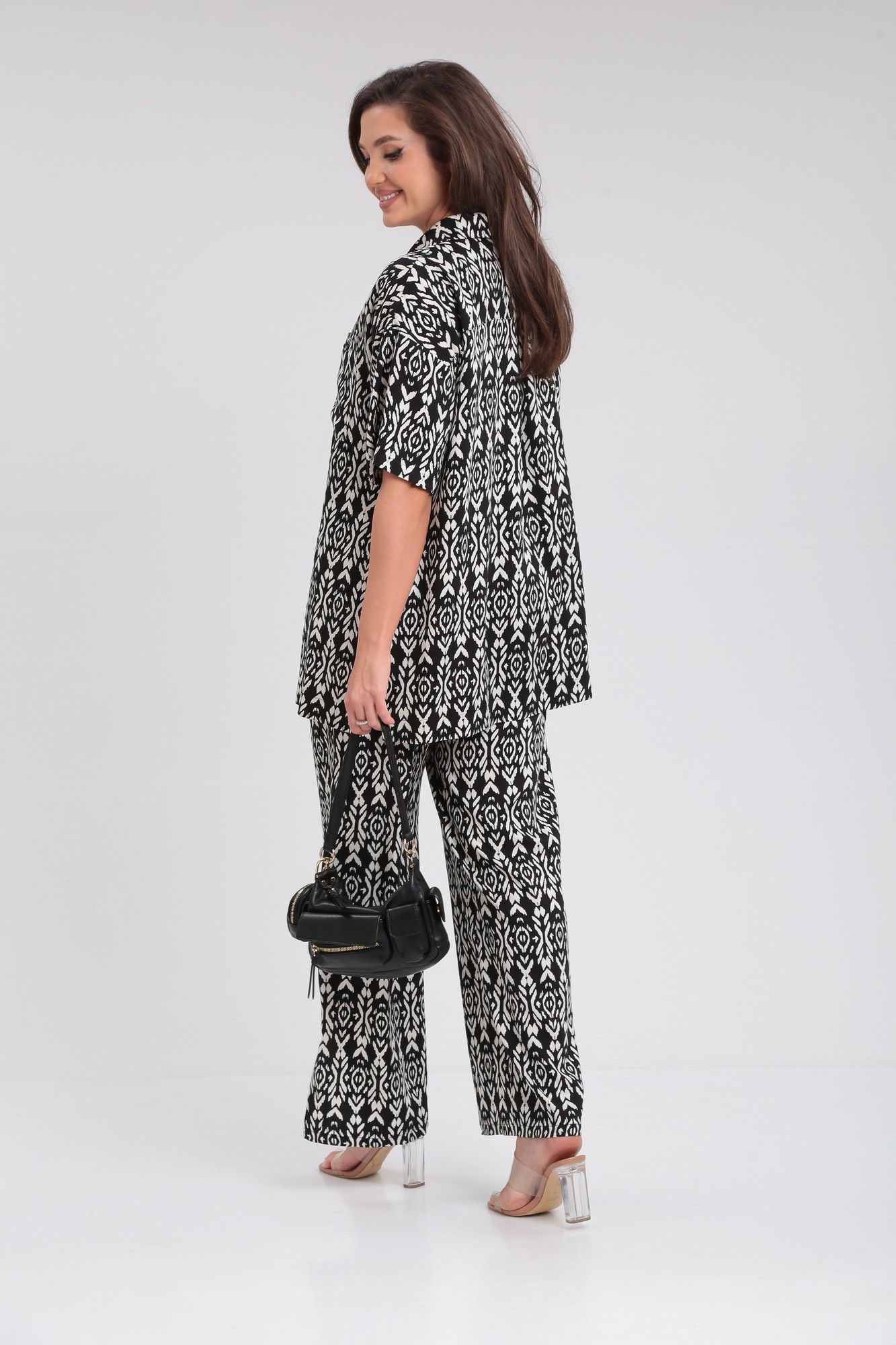 Комплект двойка состоят из рубашки и брюк выполнен из вискозной ткани. Рубашка свободного кроя, с укороченным рукавом. По спинке отрезная кокетка, со складкой. По переду настрочной карман. Застежка петли пуговицы. Брюки прямого кроя. В боковых швах карманы. По низу брюк разрезы.Средняя посадка, пояс на резинке. Длина рубашки – 76 см