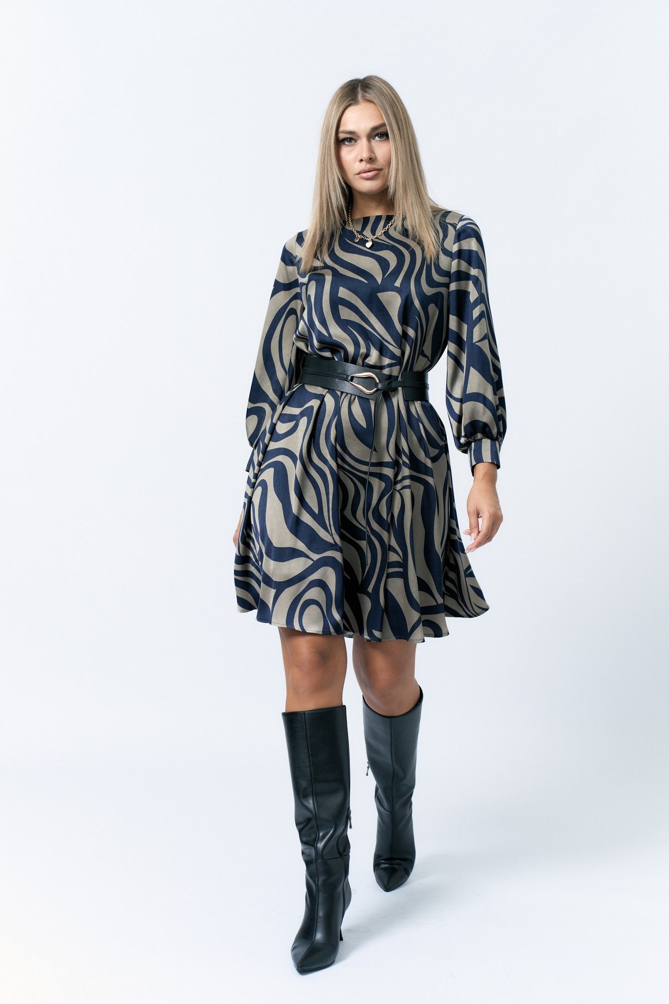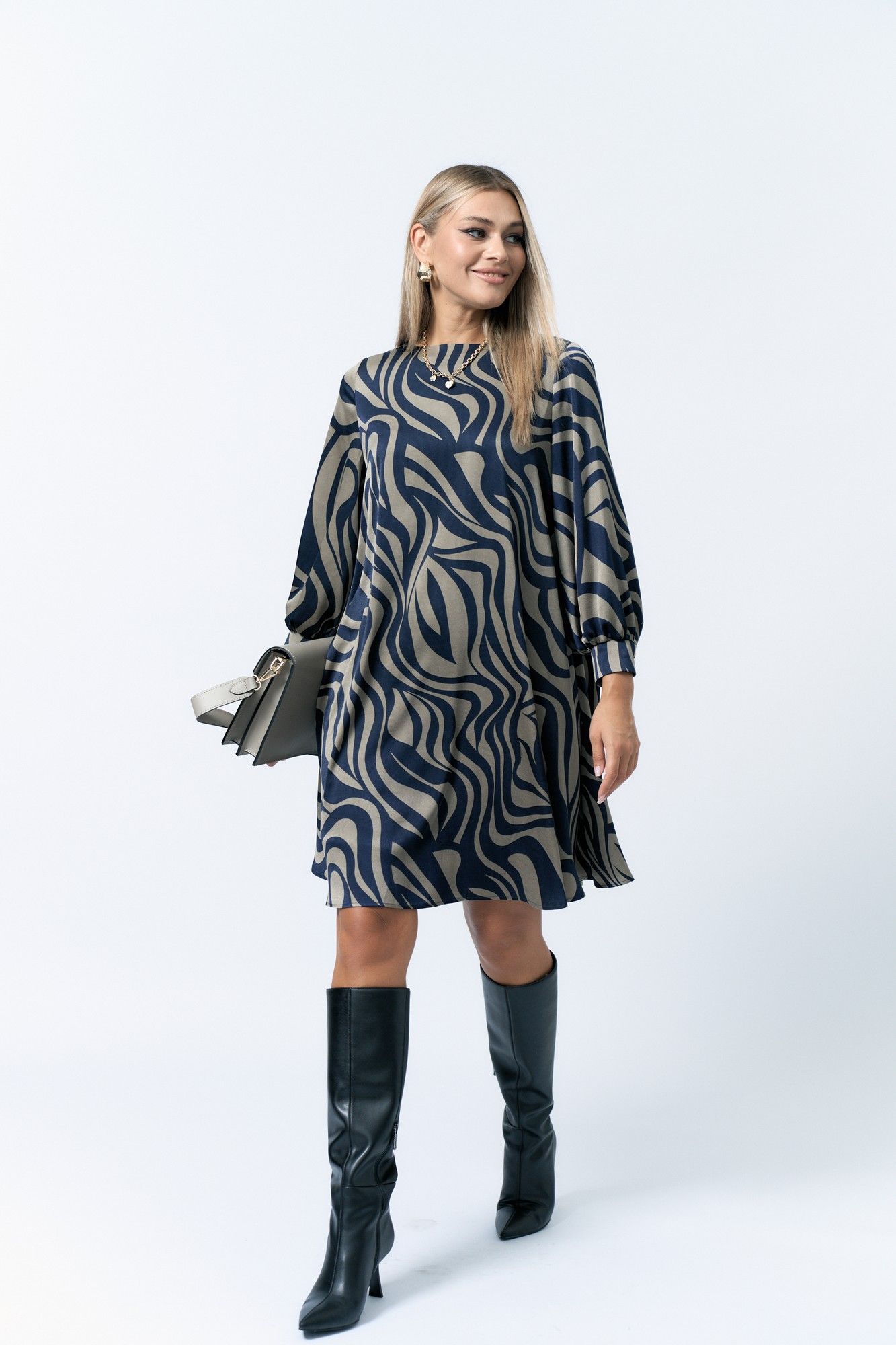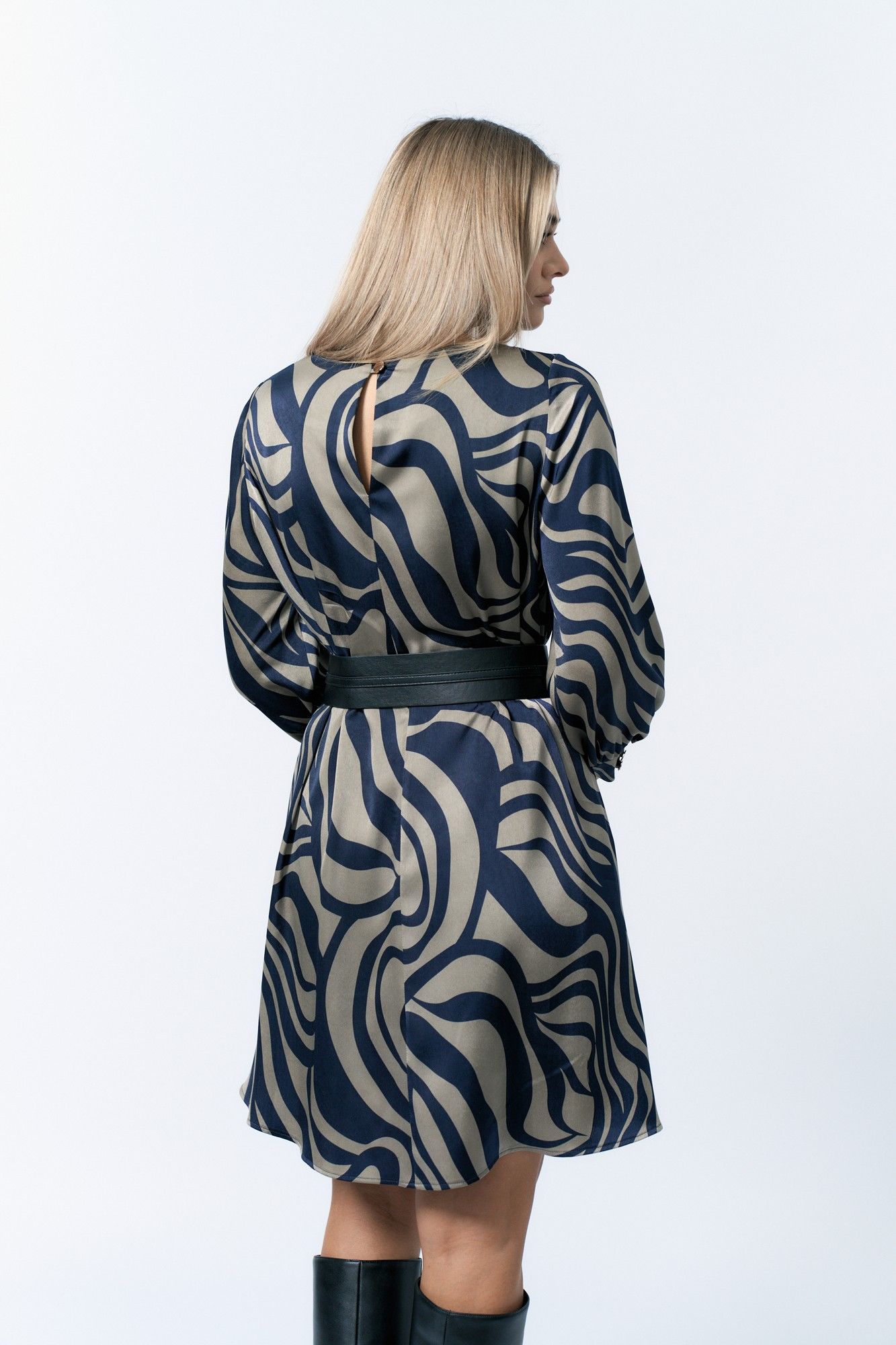 Платье женское А-образного силуэта. Горловина округлой формы. Рукав втачной.По низу рукава манжет застегивается на 2 петли пуговицы. Спинка со средним швом. По спинке вырез с застежкой на петлю пуговицу. Изделие на подкладке. Пояс в комплекте.