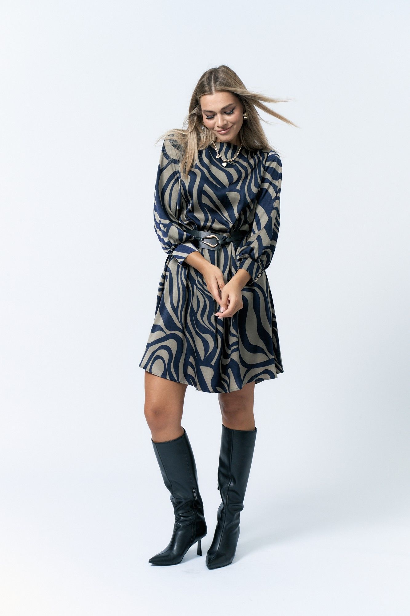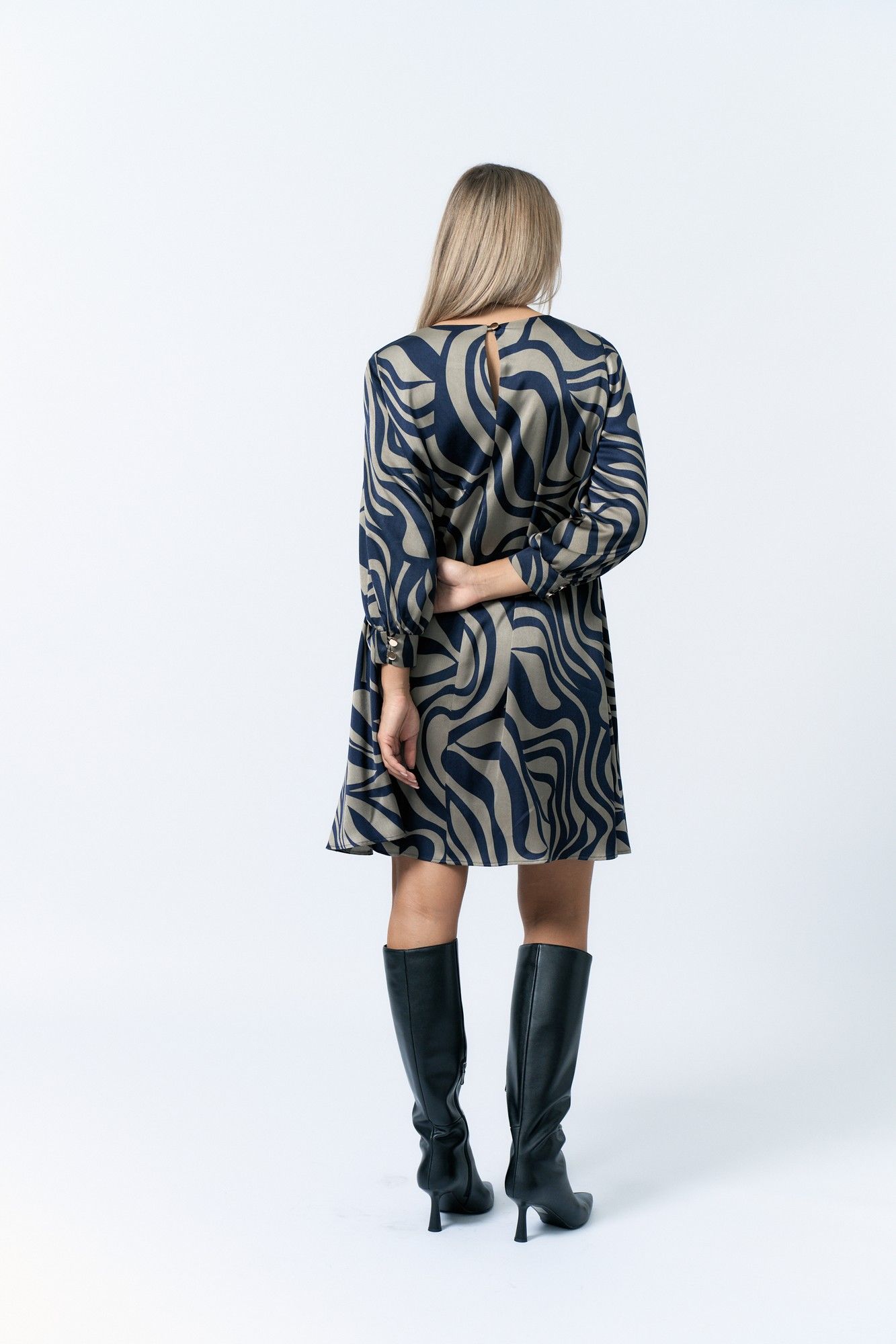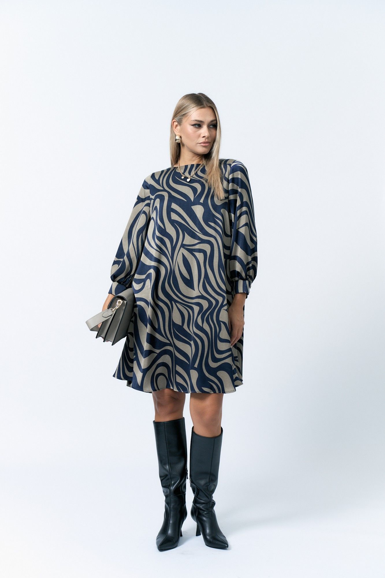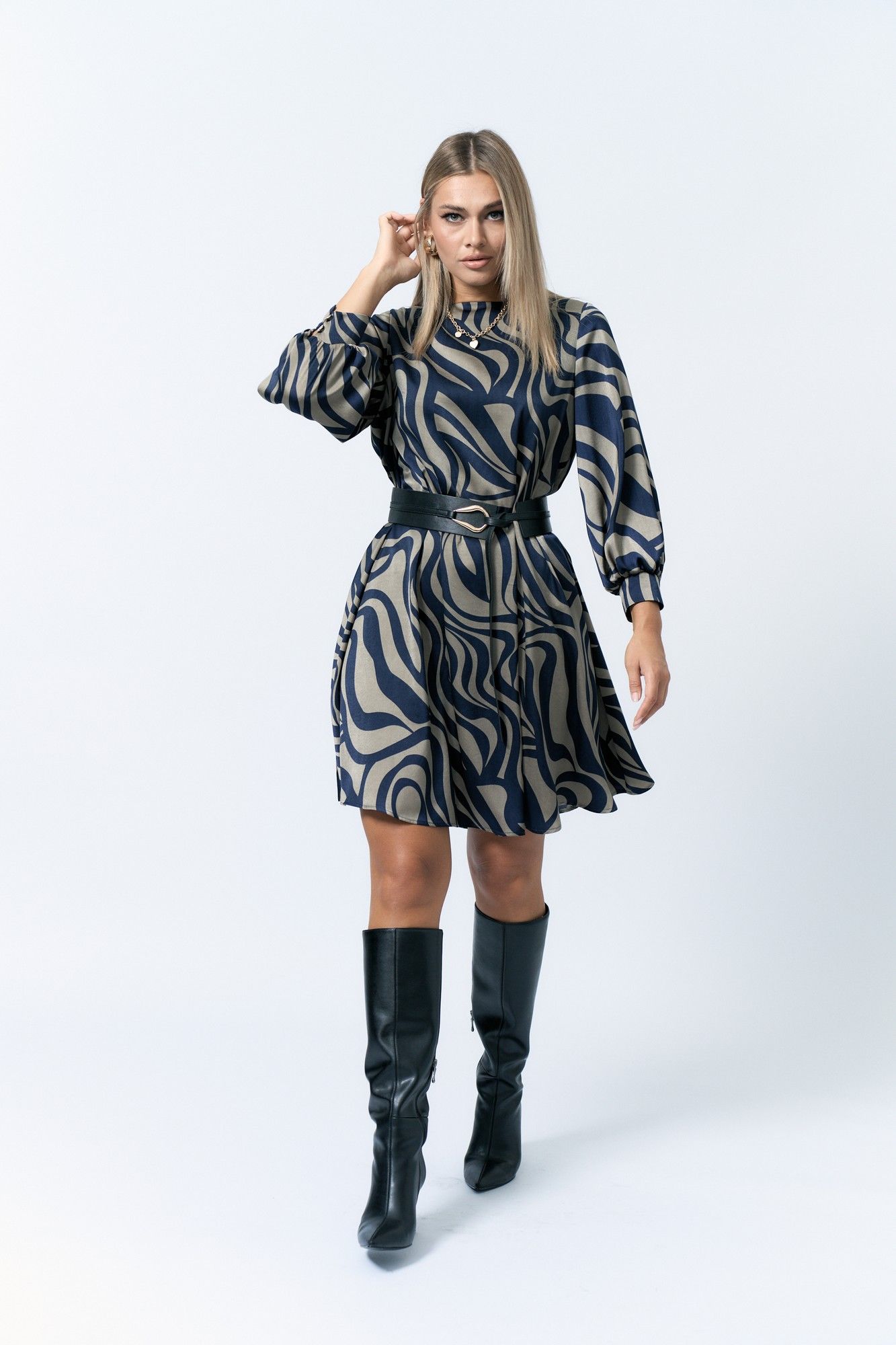 Платье женское А-образного силуэта. Горловина округлой формы. Рукав втачной.По низу рукава манжет застегивается на 2 петли пуговицы. Спинка со средним швом. По спинке вырез с застежкой на петлю пуговицу. Изделие на подкладке. Пояс в комплекте.