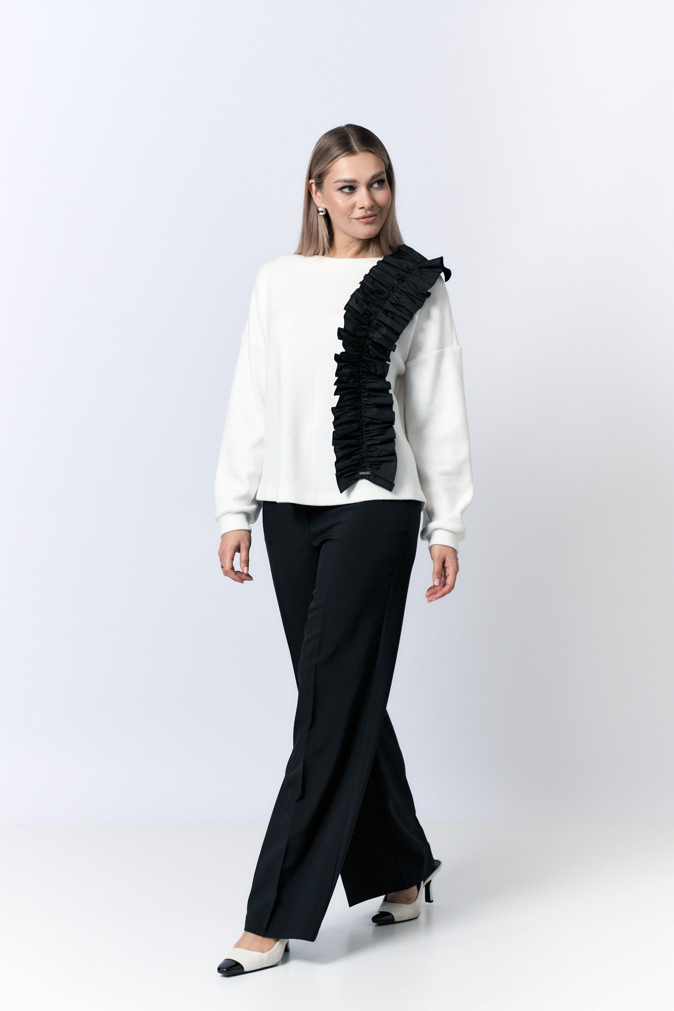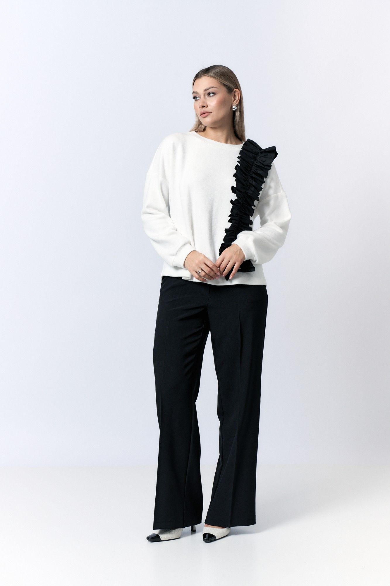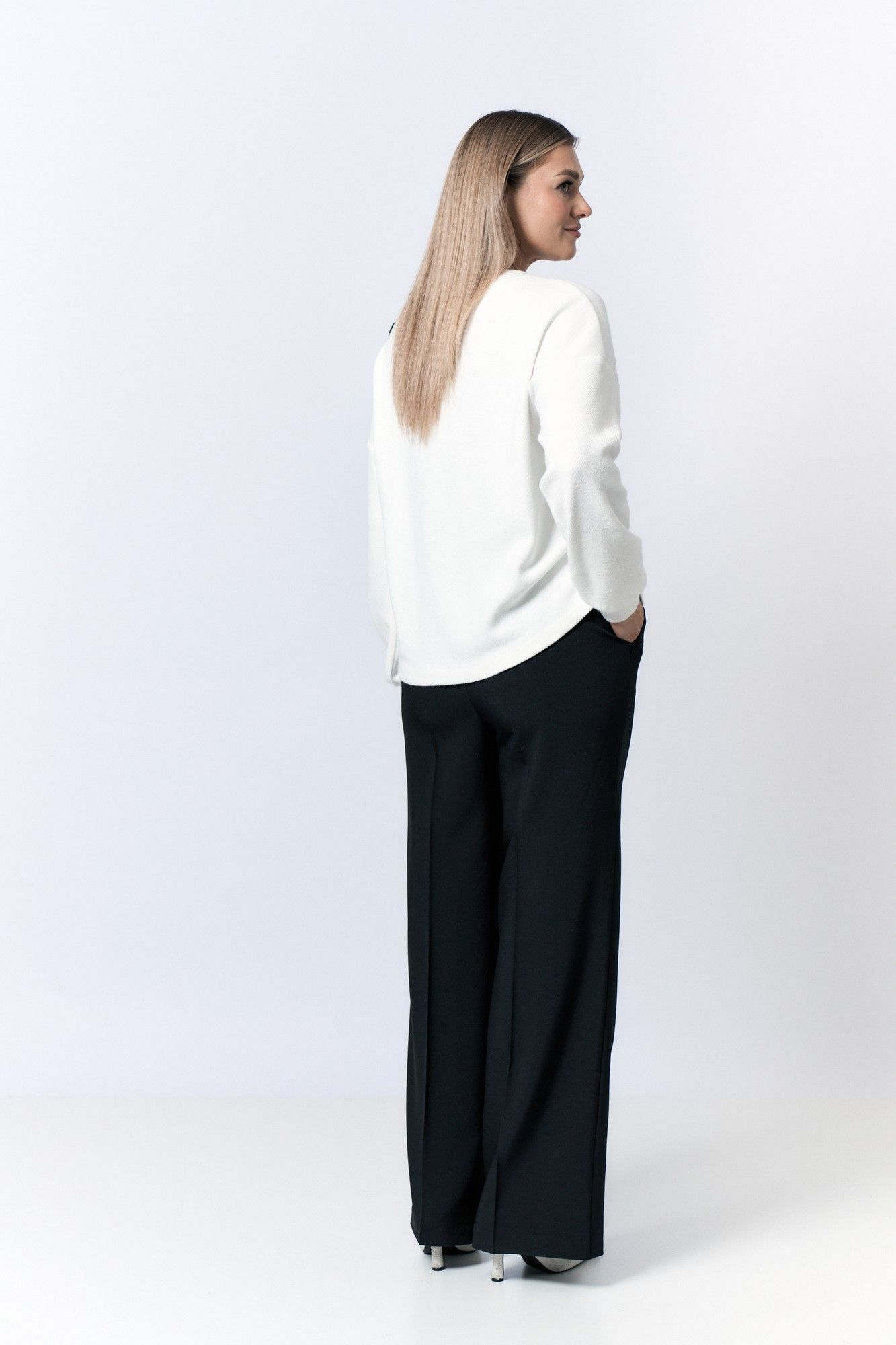 Комплект состоящий из блузы и брюк. Блуза свободного силуэта. Горловина округлой формы. Рукав спущенный на манжете. По переду декоративная,съемная деталь(рюша), на кнопках. Предусмотрена для удобства при стирке. Брюки классические, на притачном поясе с резинкой. В боковых швах выполнены карманы.