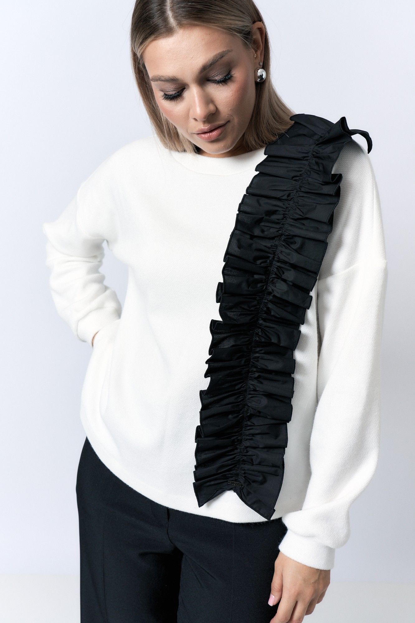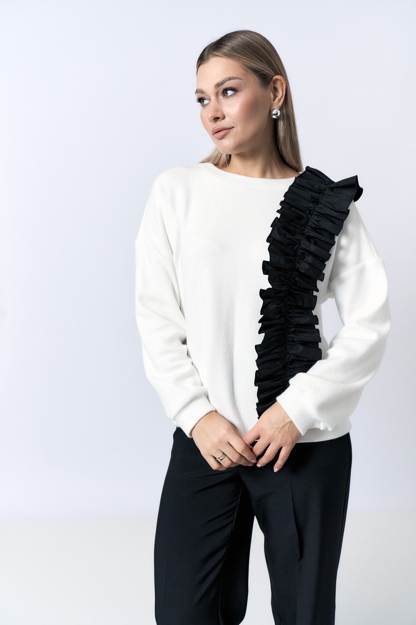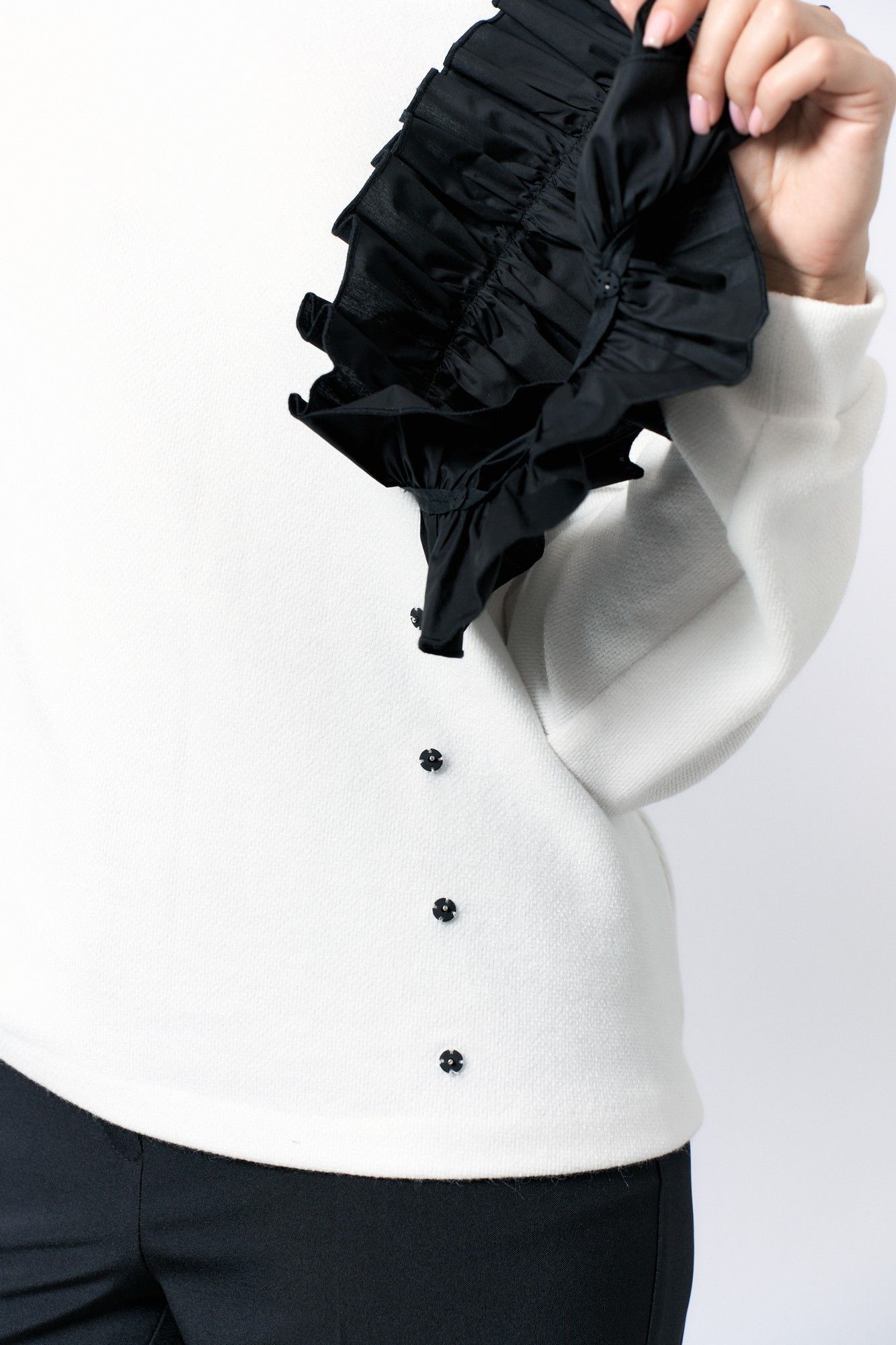 Комплект состоящий из блузы и брюк. Блуза свободного силуэта. Горловина округлой формы. Рукав спущенный на манжете. По переду декоративная,съемная деталь(рюша), на кнопках. Предусмотрена для удобства при стирке. Брюки классические, на притачном поясе с резинкой. В боковых швах выполнены карманы.