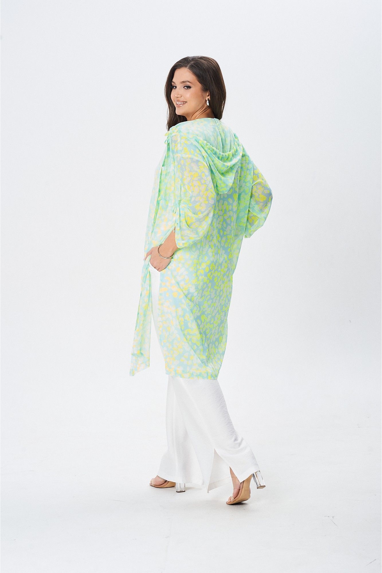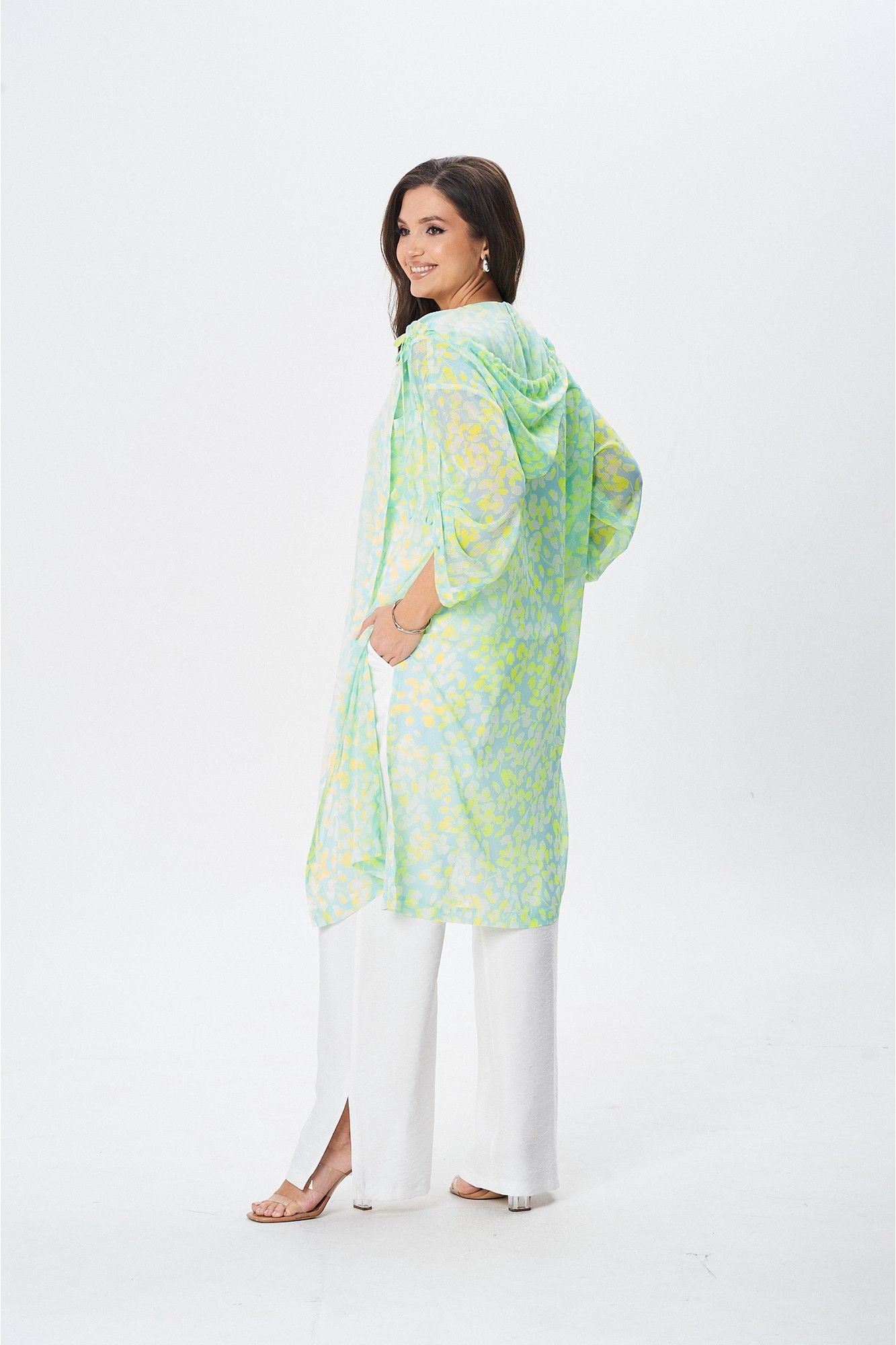 Комплект женский,тройка. Состоит из накидки, брюк и топа. Накидка с капюшоном. Рукав спущенный регулируется завязкой. По переду накидки есть функциональный накладной карман. В боковых швах разрезы.Застежка на петли пуговицы. Брюки прямого кроя. В боковых швах карманы. По низу брюк разрезы.Изделие со средней посадкой, пояс на резинке. Топ свободного силуэта с V- образным вырезом горловины. Издели идет со спущенным плечом.