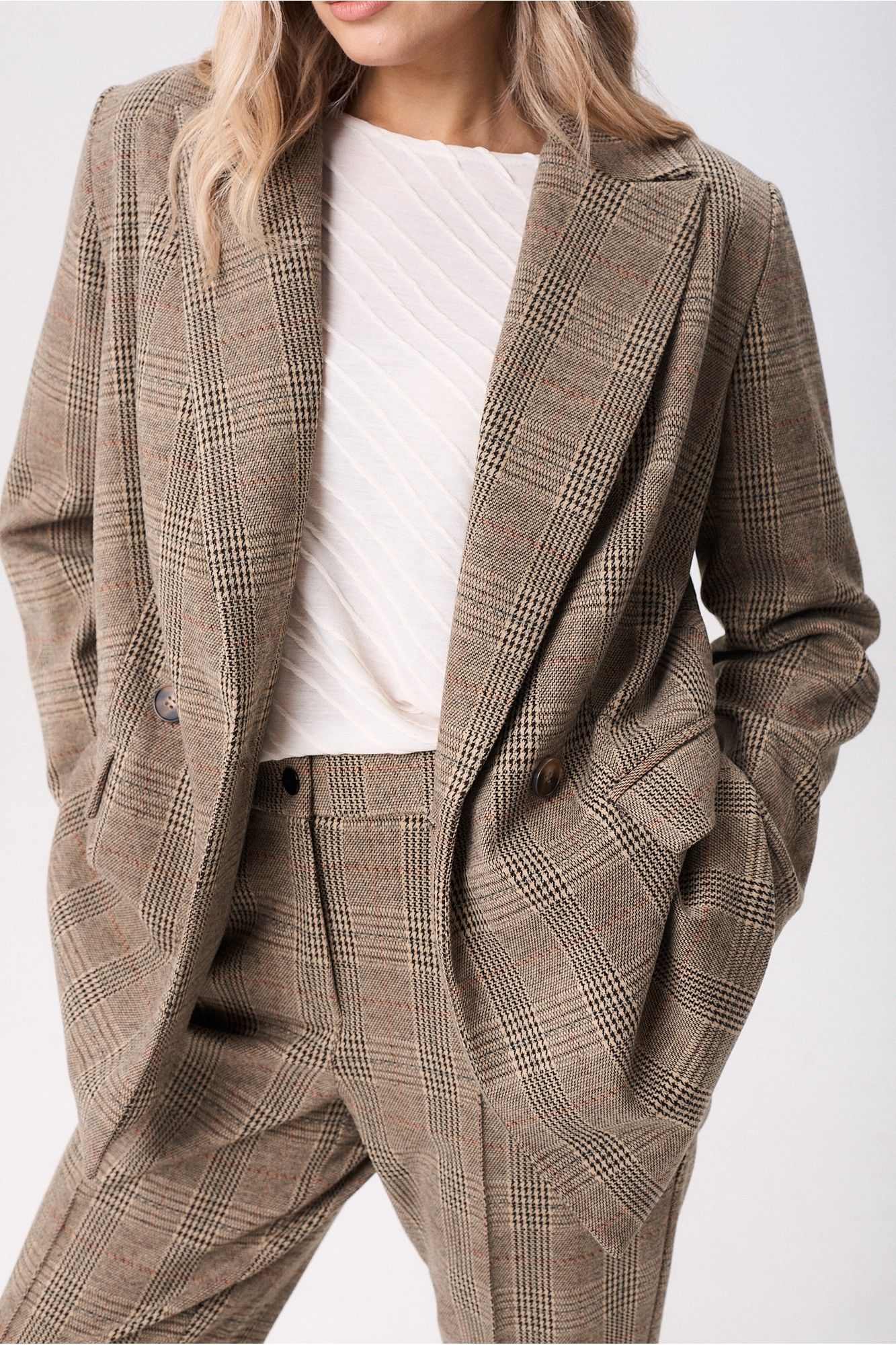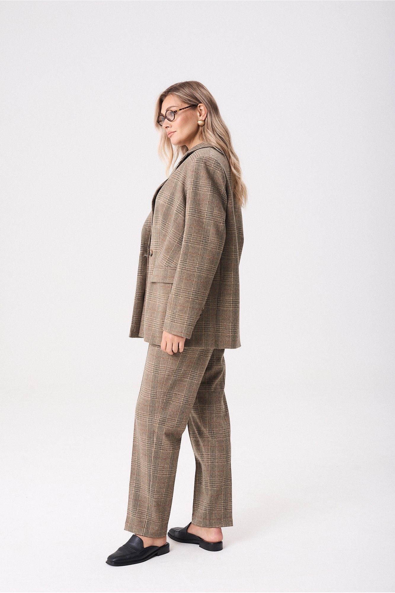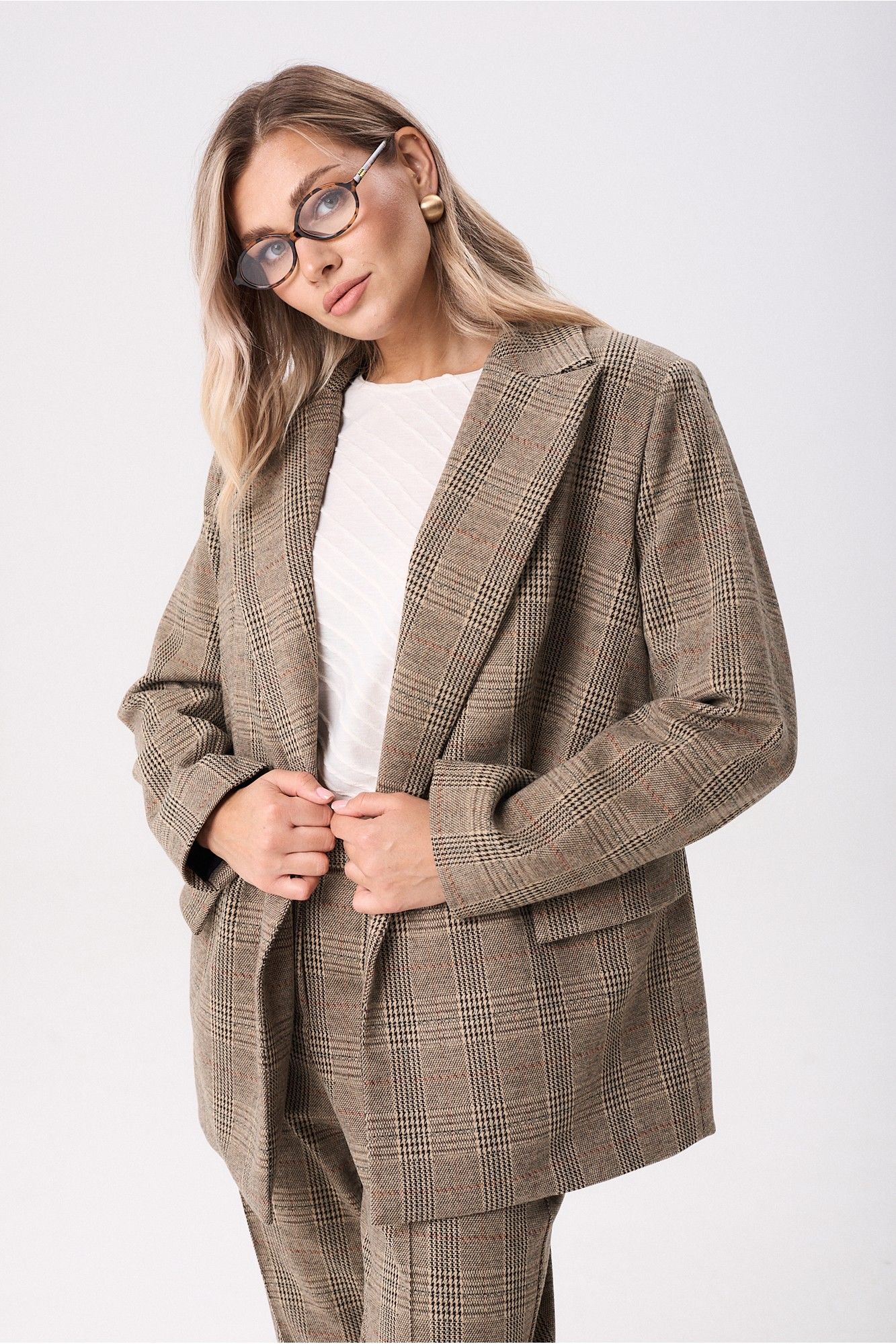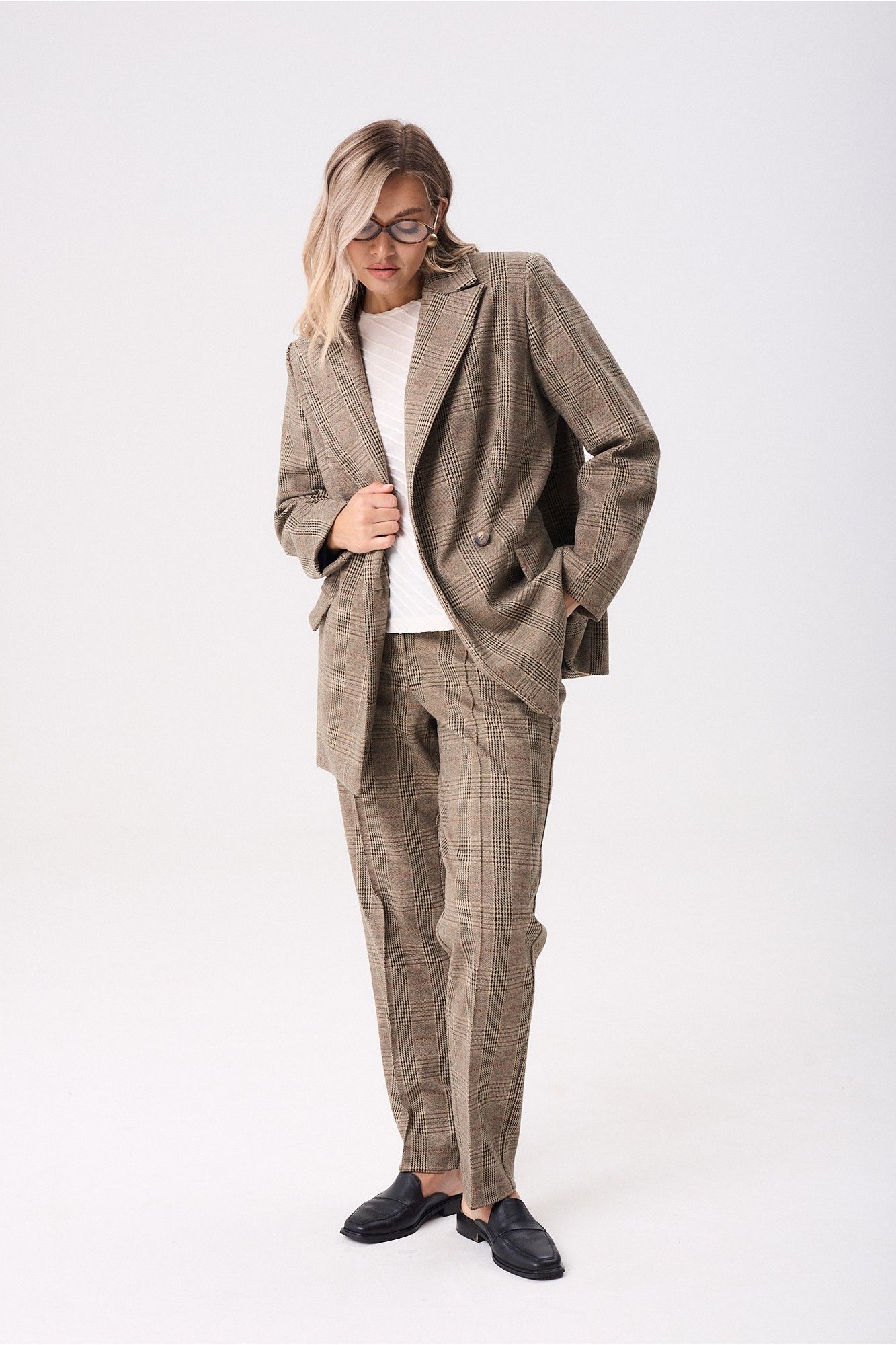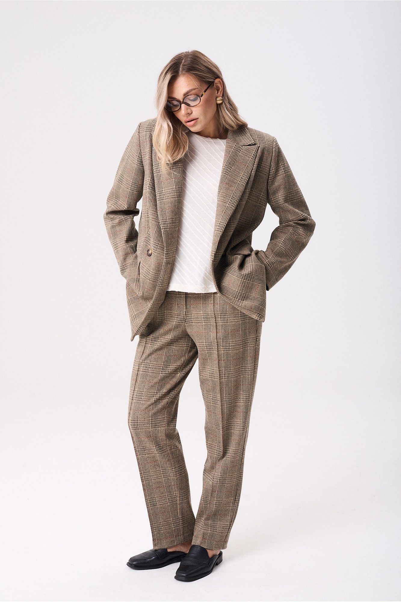 Костюм женский состоит из жакета и брюк. Жакет прямого силуэта. Воротник пиджачного типа.Застежка двубортная на петли пуговицы. По переду прорезной карман с клапаном. Втачной рукав, длинный. По рукаву декоративная шлица с пуговицами. Жакет на подкладке с плечевыми накладками. Брюки классические, на притачном поясе, с застежкой на молнию и петлю пуговицу. Карманы в боковых швах.