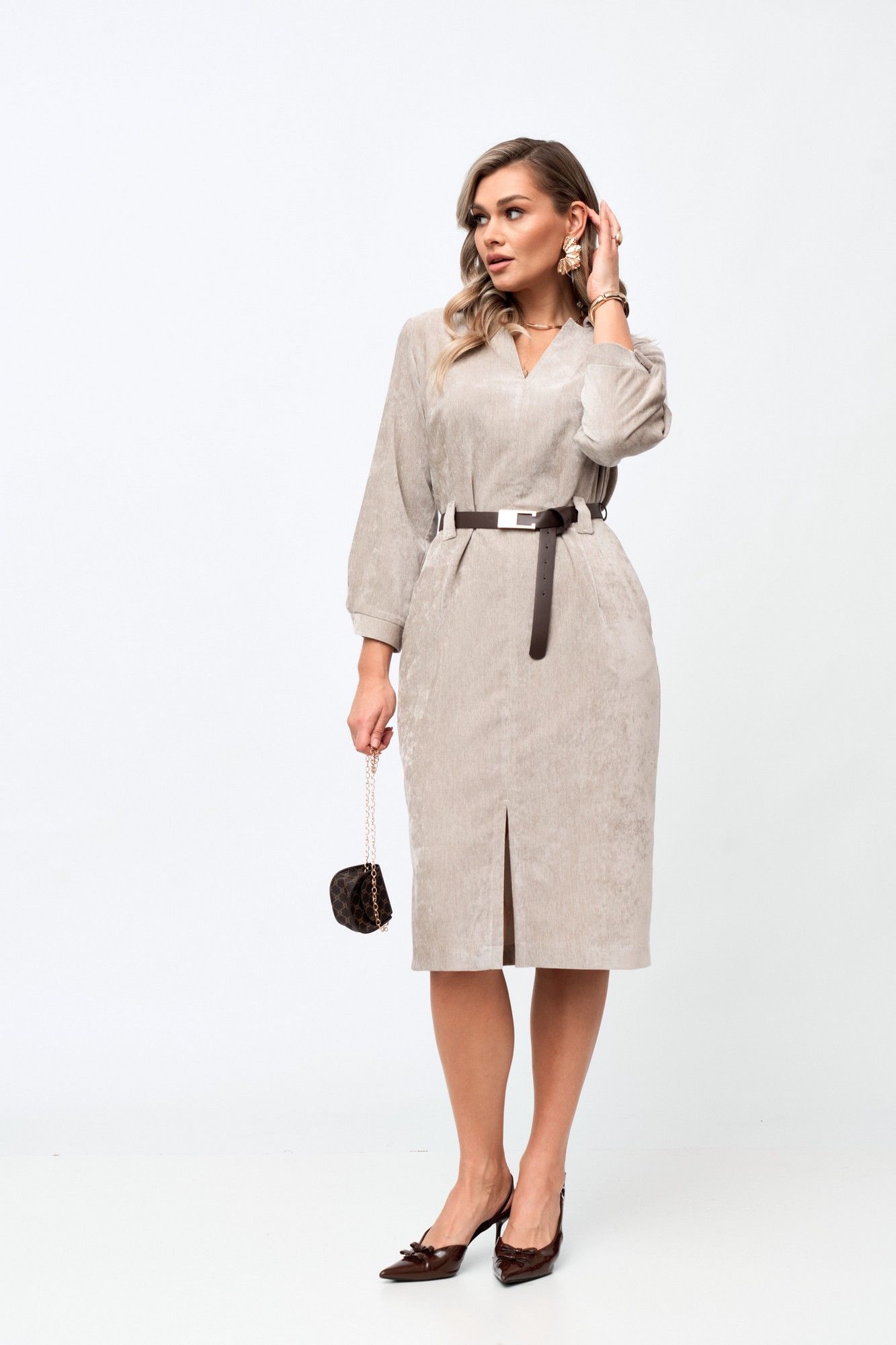 Платье полуприлегающего силуэта слегка зауженное к низу, выполнено из мягкой и качественной ткани Рукав втачной ¾. на манжете. Горловина V -образная с воротником на стойке. По переднему полотнищу карманы и разрез по низу среднего шва. По спинке изделия средний шов. В комплекте с изделием идет пояс.