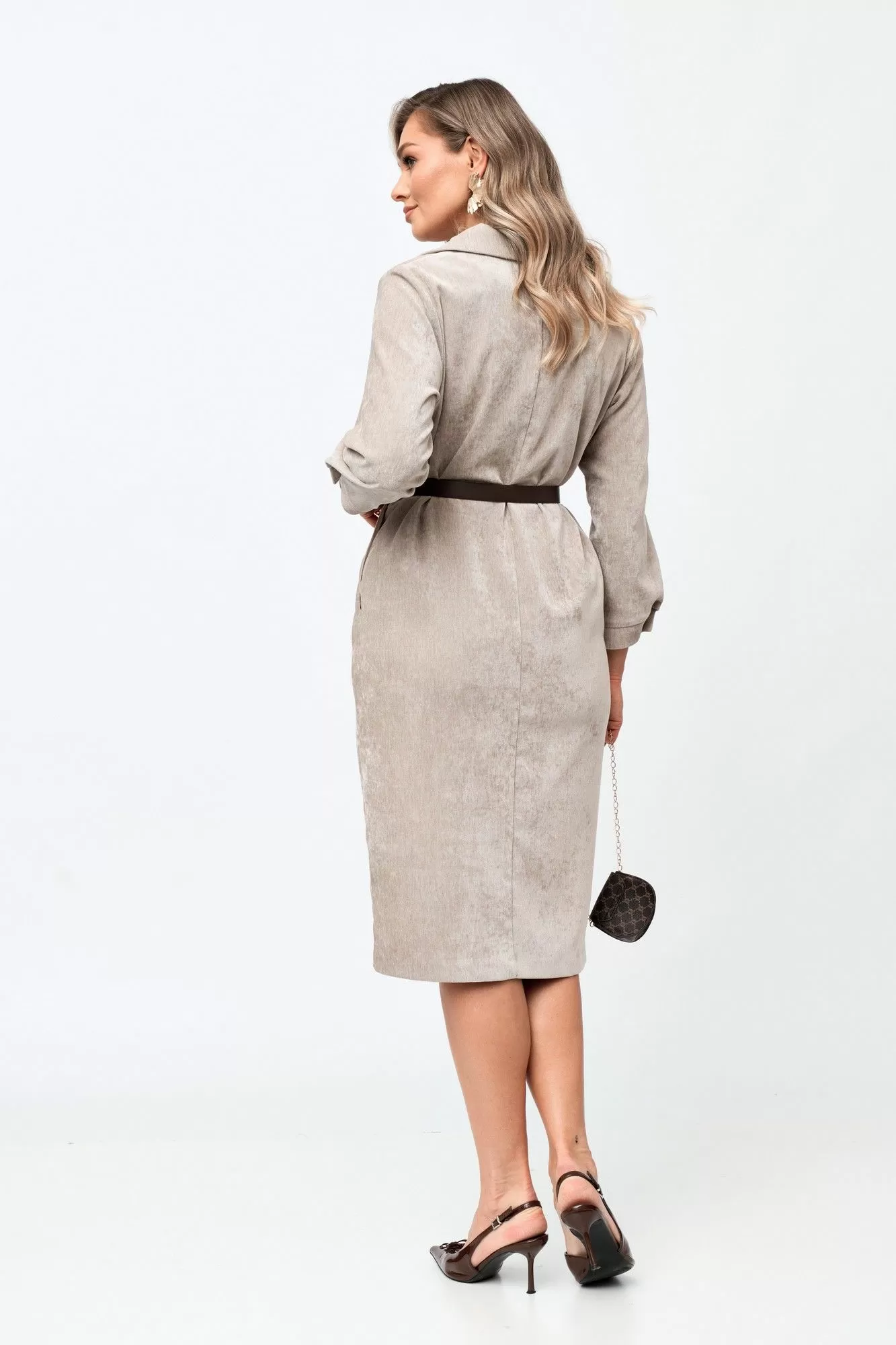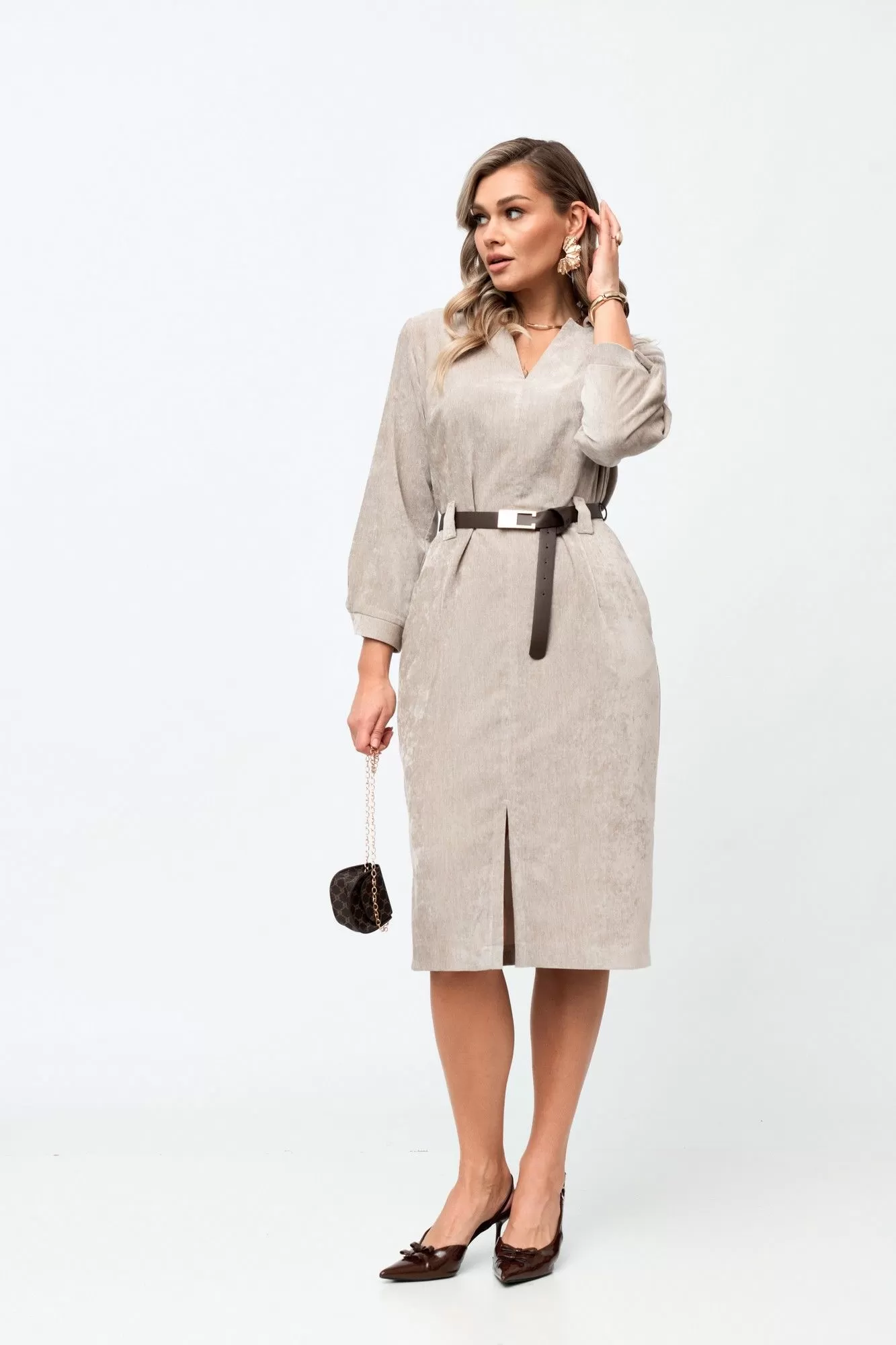 Платье полуприлегающего силуэта слегка зауженное к низу, выполнено из мягкой и качественной ткани Рукав втачной ¾. на манжете. Горловина V -образная с воротником на стойке. По переднему полотнищу карманы и разрез по низу среднего шва.